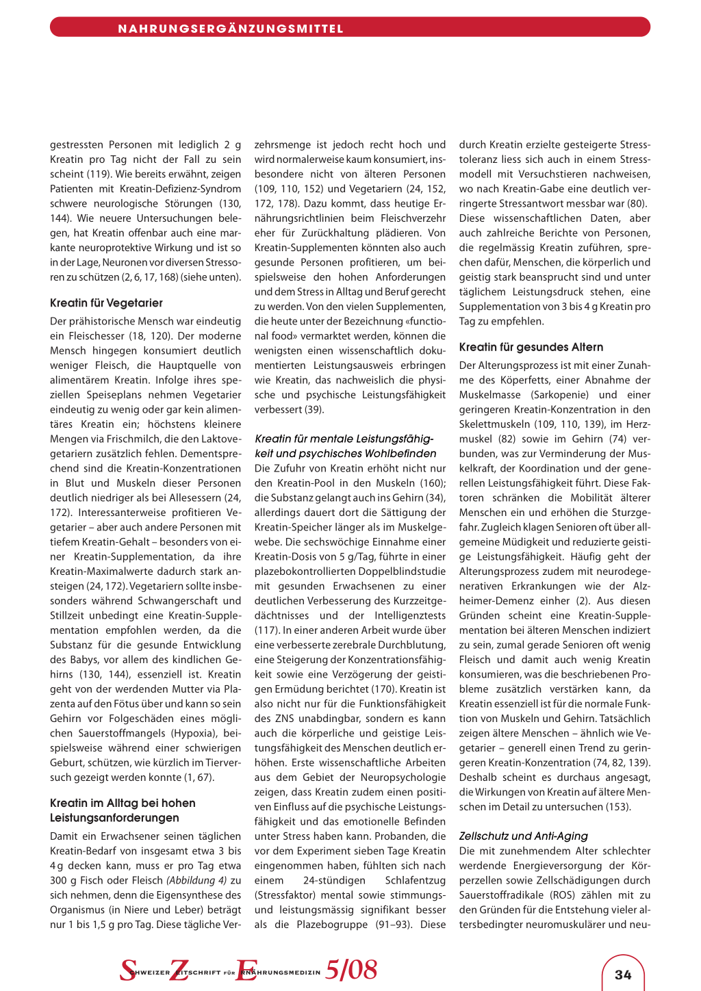 zehrsmenge ist jedoch recht hoch und wird normalerweise kaum konsumiert, insbesondere nicht von älteren Personen (109, 110, 152) und Vegetariern (24, 152, 172, 178). Dazu kommt, dass heutige Ernährungsrichtlinien beim Fleischverzehr eher für Zurückhaltung plädieren. Von Kreatin-Supplementen könnten also auch gesunde Personen profitieren, um beispielsweise den hohen Anforderungen und dem Stress in Alltag und Beruf gerecht zu werden. Von den vielen Supplementen, die heute unter der Bezeichnung «functional food» vermarktet werden, können die wenigsten einen wissenschaftlich dokumentierten Leistungsausweis erbringen wie Kreatin, das nachweislich die physische und psychische Leistungsfähigkeit verbessert (39).