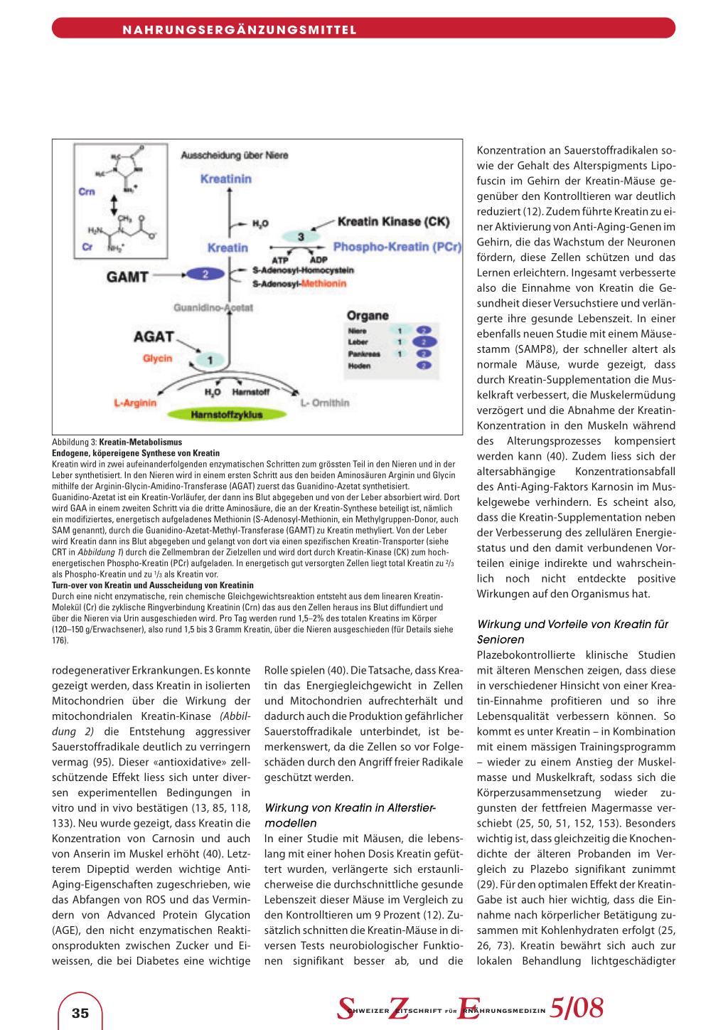 rodegenerativer Erkrankungen. Es konnte gezeigt werden, dass Kreatin in isolierten Mitochondrien über die Wirkung der mitochondrialen Kreatin-Kinase (Abbildung 2) die Entstehung aggressiver Sauerstoffradikale deutlich zu verringern vermag (95). Dieser «antioxidative» zellschützende Effekt liess sich unter diversen experimentellen Bedingungen in vitro und in vivo bestätigen (13, 85, 118, 133). Neu wurde gezeigt, dass Kreatin die Konzentration von Carnosin und auch von Anserin im Muskel erhöht (40). Letzterem Dipeptid werden wichtige AntiAging-Eigenschaften zugeschrieben, wie das Abfangen von ROS und das Vermindern von Advanced Protein Glycation (AGE), den nicht enzymatischen Reaktionsprodukten zwischen Zucker und Eiweissen, die bei Diabetes eine wichtige