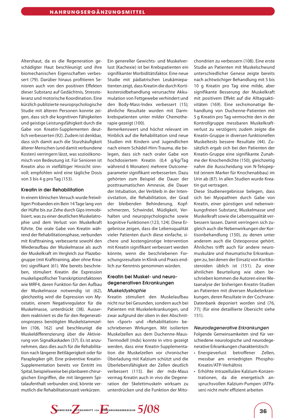 In einem klinischen Versuch wurde freiwilligen Probanden ein Bein 14 Tage lang von der Hüfte bis zur Zehe durch Gips immobilisiert, was zu einer deutlichen Muskelatrophie und dem Verlust von Muskelkraft führte. Die orale Gabe von Kreatin während der Rehabilitationsphase, verbunden mit Krafttraining, verbesserte sowohl den Wiederaufbau der Muskelmasse als auch der Muskelkraft im Vergleich zur Plazebogruppe (mit Krafttraining, aber ohne Kreatin) signifikant (61). Wie bereits beschrieben, stimuliert Kreatin die Expression muskelspezifischer Transkriptionsfaktoren wie MRF4, deren Funktion für den Aufbau der Muskelmasse notwendig ist (62), gleichzeitig wird die Expression von Myostatin, einem Negativregulator für die Muskelmasse, unterdrückt (38). Ausserdem reaktiviert es die für den Regenerationsprozess benötigten Muskelstammzellen (106, 162) und beschleunigt die Muskeldifferenzierung über die Aktivierung von Signalkaskaden (37). Es ist anzunehmen, dass dies auch für die Rehabilitation nach längerer Bettlägerigkeit oder für Paraplegiker gilt. Eine präventive KreatinSupplementation bereits vor Eintritt ins Spital, beispielsweise bei planbaren chirurgischen Eingriffen, die mit längerem Spitalaufenthalt verbunden sind, könnte vermutlich die Rehabilitationszeit verkürzen.