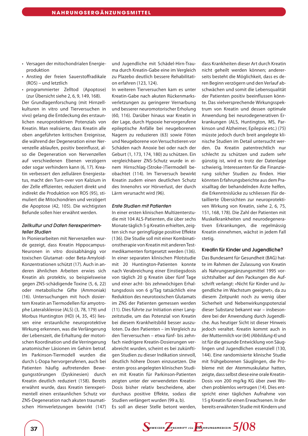dass Krankheiten dieser Art durch Kreatin nicht geheilt werden können; andererseits besteht die Möglichkeit, dass es deren Beginn verzögern und den Verlauf abschwächen und somit die Lebensqualität der Patienten positiv beeinflussen könnte. Das vielversprechende Wirkungsspektrum von Kreatin und dessen optimale Anwendung bei neurodegenerativen Erkrankungen (ALS, Huntington, MS, Parkinson und Alzheimer, Epilepsie etc.) (75) müsste jedoch durch breit angelegte klinische Studien im Detail untersucht werden. Da Kreatin patentrechtlich nur schlecht zu schützen und zudem sehr günstig ist, wird es trotz der Datenlage schwierig, Interessenten für die Finanzierung solcher Studien zu finden. Hier könnten Erfahrungsberichte aus dem Praxisalltag der behandelnden Ärzte helfen, die Erkenntnislücke zu schliessen (für detaillierte Übersichten zur neuroprotektiven Wirkung von Kreatin, siehe 2, 6, 75, 151, 168, 178). Die Zahl der Patienten mit Muskelkrankheiten und neurodegenerativen Erkrankungen, die regelmässig Kreatin einnehmen, wächst in jedem Fall stetig.
