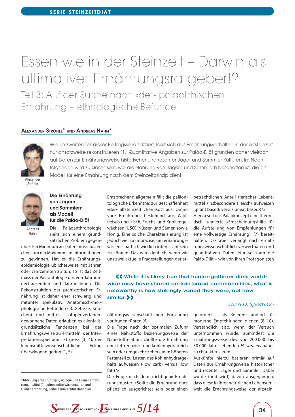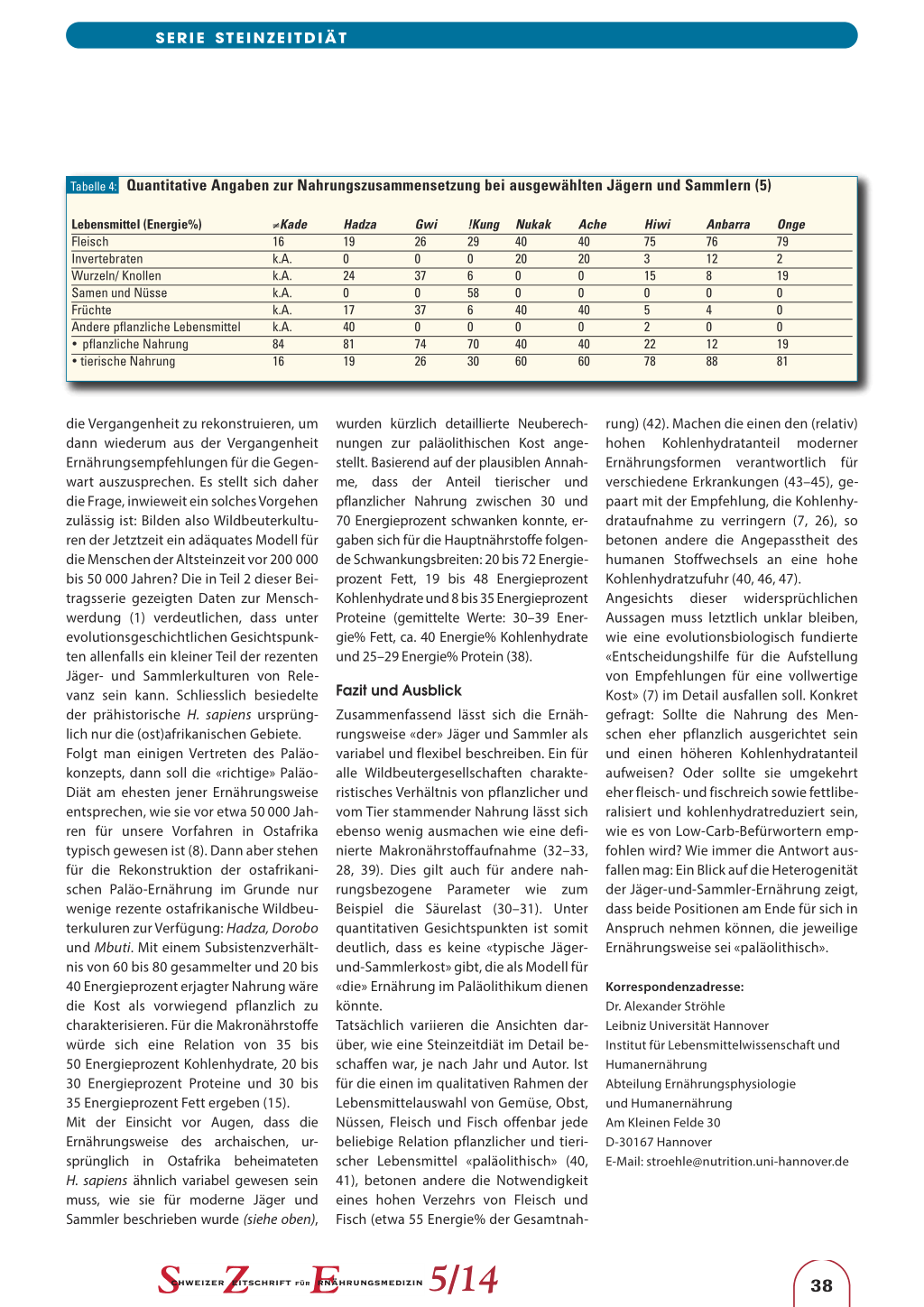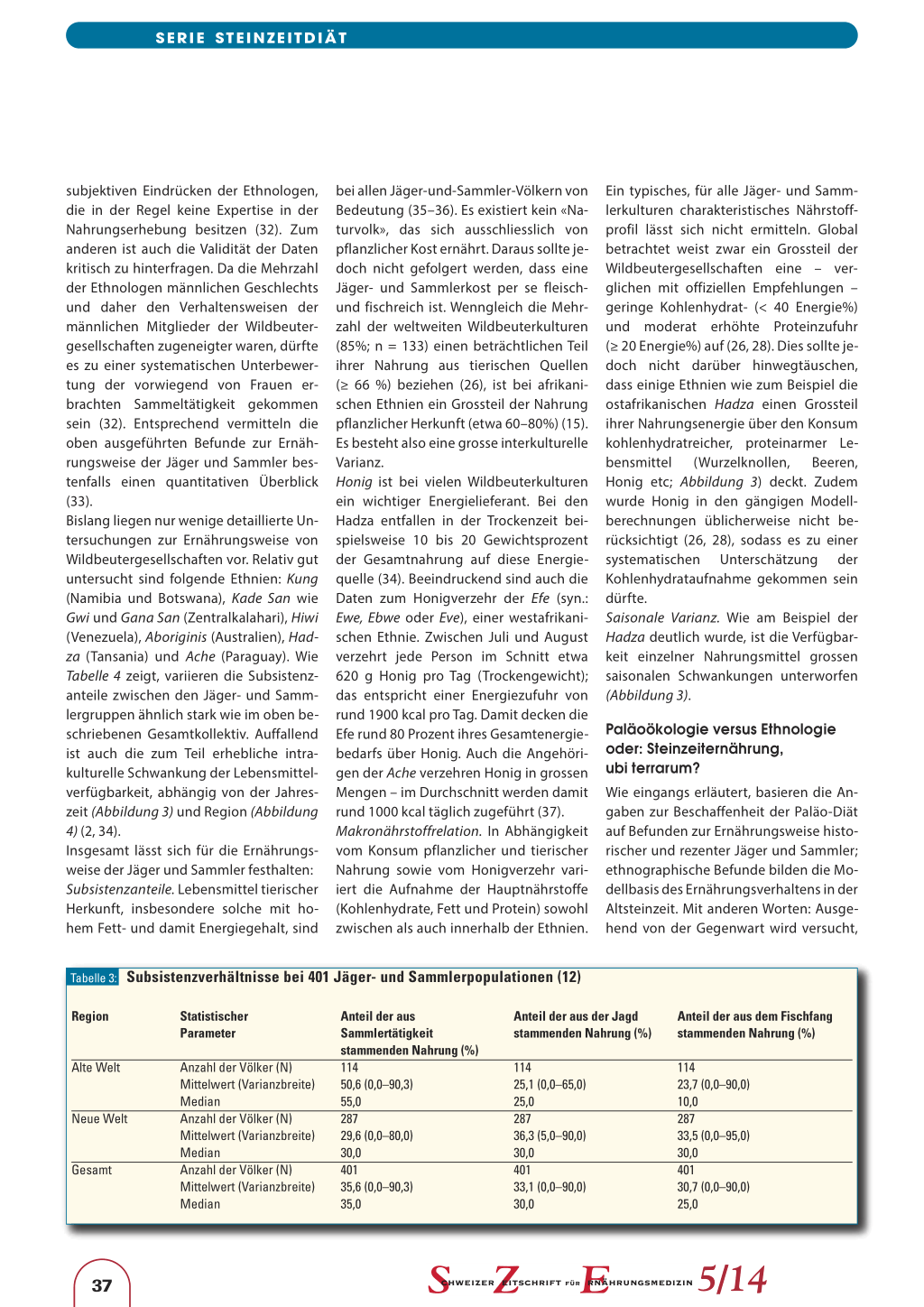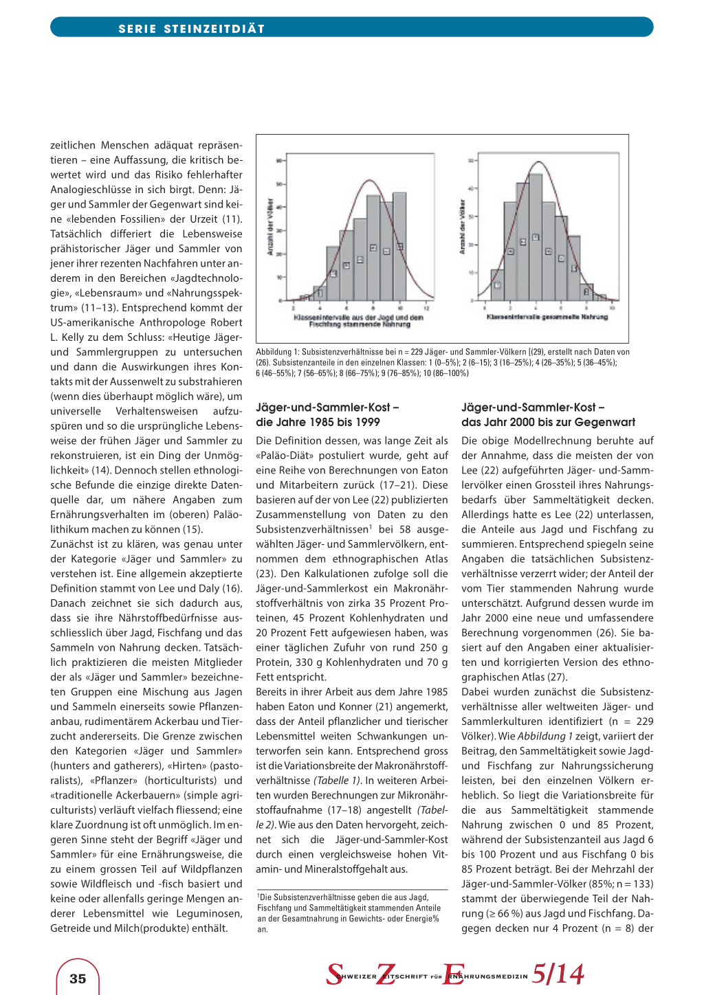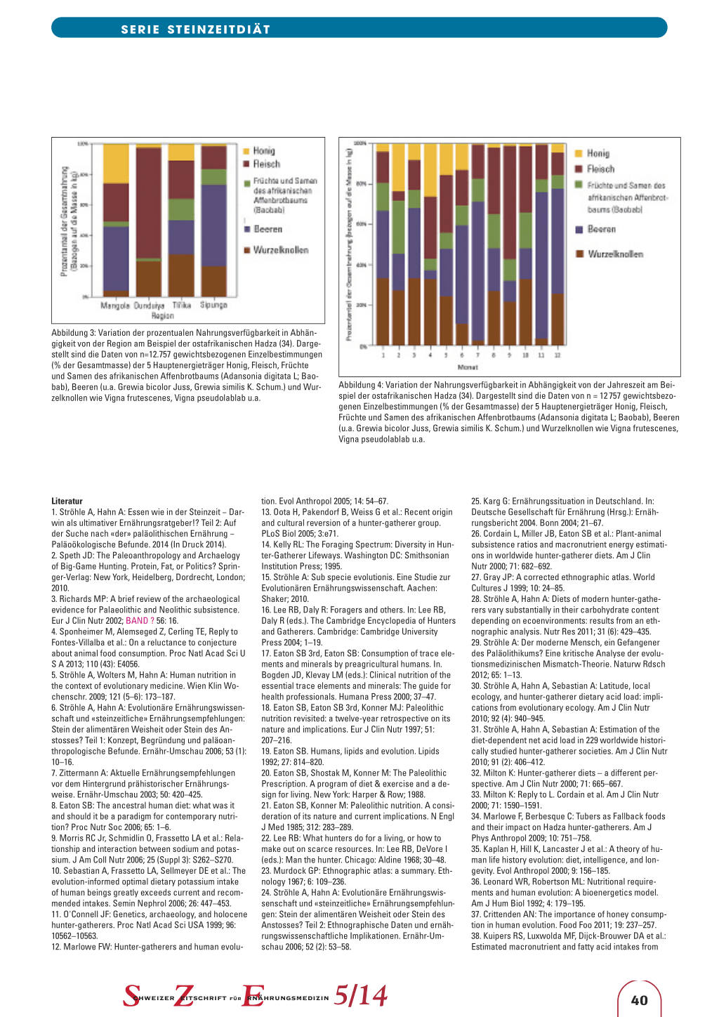 tion. Evol Anthropol 2005; 14: 54–67. 13. Oota H, Pakendorf B, Weiss G et al.: Recent origin and cultural reversion of a hunter-gatherer group. PLoS Biol 2005; 3:e71. 14. Kelly RL: The Foraging Spectrum: Diversity in Hunter-Gatherer Lifeways. Washington DC: Smithsonian Institution Press; 1995. 15. Ströhle A: Sub specie evolutionis. Eine Studie zur Evolutionären Ernährungswissenschaft. Aachen: Shaker; 2010. 16. Lee RB, Daly R: Foragers and others. In: Lee RB, Daly R (eds.). The Cambridge Encyclopedia of Hunters and Gatherers. Cambridge: Cambridge University Press 2004; 1–19. 17. Eaton SB 3rd, Eaton SB: Consumption of trace elements and minerals by preagricultural humans. In. Bogden JD, Klevay LM (eds.): Clinical nutrition of the essential trace elements and minerals: The guide for health professionals. Humana Press 2000; 37–47. 18. Eaton SB, Eaton SB 3rd, Konner MJ: Paleolithic nutrition revisited: a twelve-year retrospective on its nature and implications. Eur J Clin Nutr 1997; 51: 207–216. 19. Eaton SB. Humans, lipids and evolution. Lipids 1992; 27: 814–820. 20. Eaton SB, Shostak M, Konner M: The Paleolithic Prescription. A program of diet & exercise and a design for living. New York: Harper & Row; 1988. 21. Eaton SB, Konner M: Paleolithic nutrition. A consideration of its nature and current implications. N Engl J Med 1985; 312: 283–289. 22. Lee RB: What hunters do for a living, or how to make out on scarce resources. In: Lee RB, DeVore I (eds.): Man the hunter. Chicago: Aldine 1968; 30–48. 23. Murdock GP: Ethnographic atlas: a summary. Ethnology 1967; 6: 109–236. 24. Ströhle A, Hahn A: Evolutionäre Ernährungswissenschaft und «steinzeitliche» Ernährungsempfehlungen: Stein der alimentären Weisheit oder Stein des Anstosses? Teil 2: Ethnographische Daten und ernährungswissenschaftliche Implikationen. Ernähr-Umschau 2006; 52 (2): 53–58.
