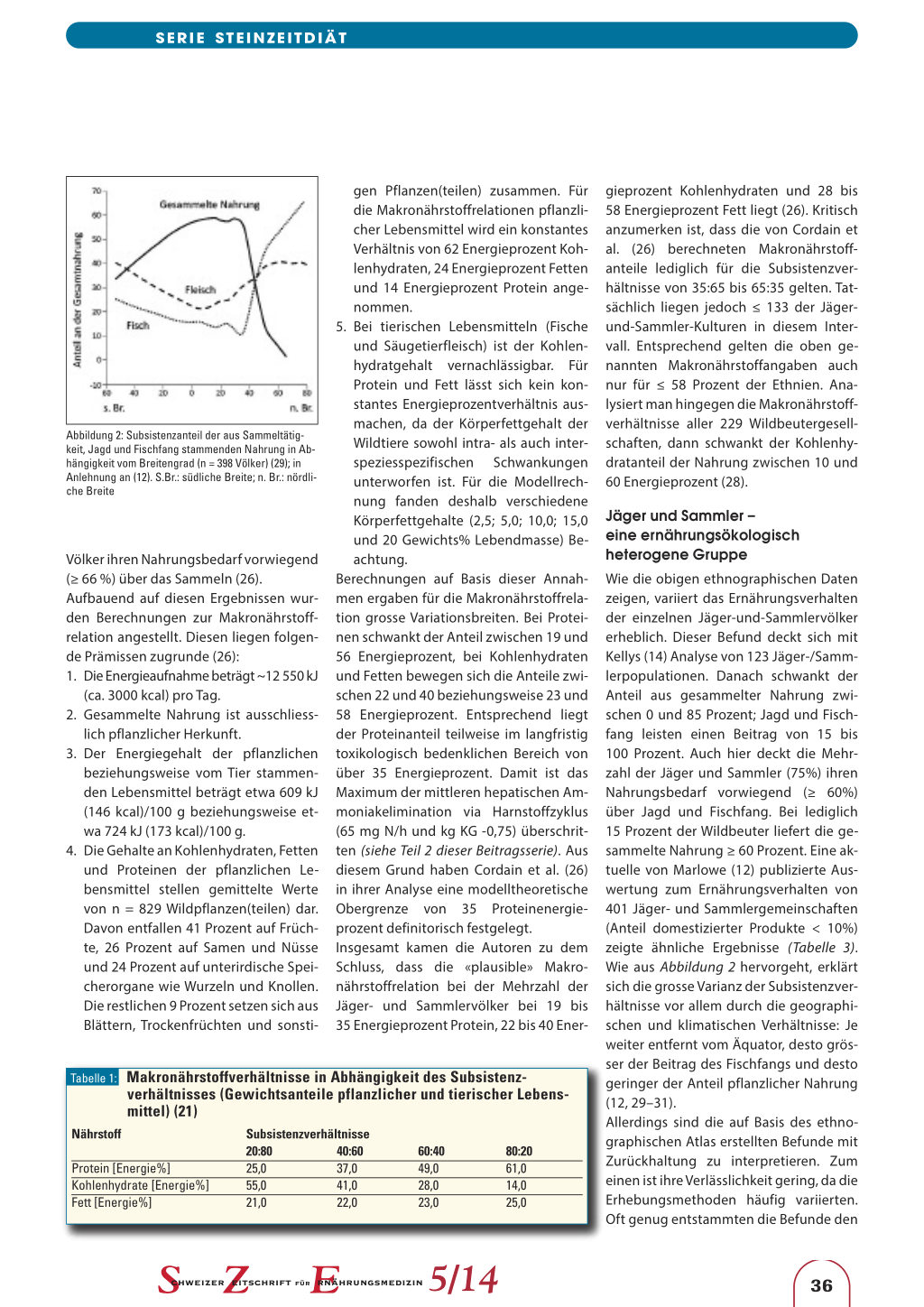 gieprozent Kohlenhydraten und 28 bis 58 Energieprozent Fett liegt (26). Kritisch anzumerken ist, dass die von Cordain et al. (26) berechneten Makronährstoffanteile lediglich für die Subsistenzverhältnisse von 35:65 bis 65:35 gelten. Tatsächlich liegen jedoch ≤ 133 der Jägerund-Sammler-Kulturen in diesem Intervall. Entsprechend gelten die oben genannten Makronährstoffangaben auch nur für ≤ 58 Prozent der Ethnien. Analysiert man hingegen die Makronährstoffverhältnisse aller 229 Wildbeutergesellschaften, dann schwankt der Kohlenhydratanteil der Nahrung zwischen 10 und 60 Energieprozent (28).