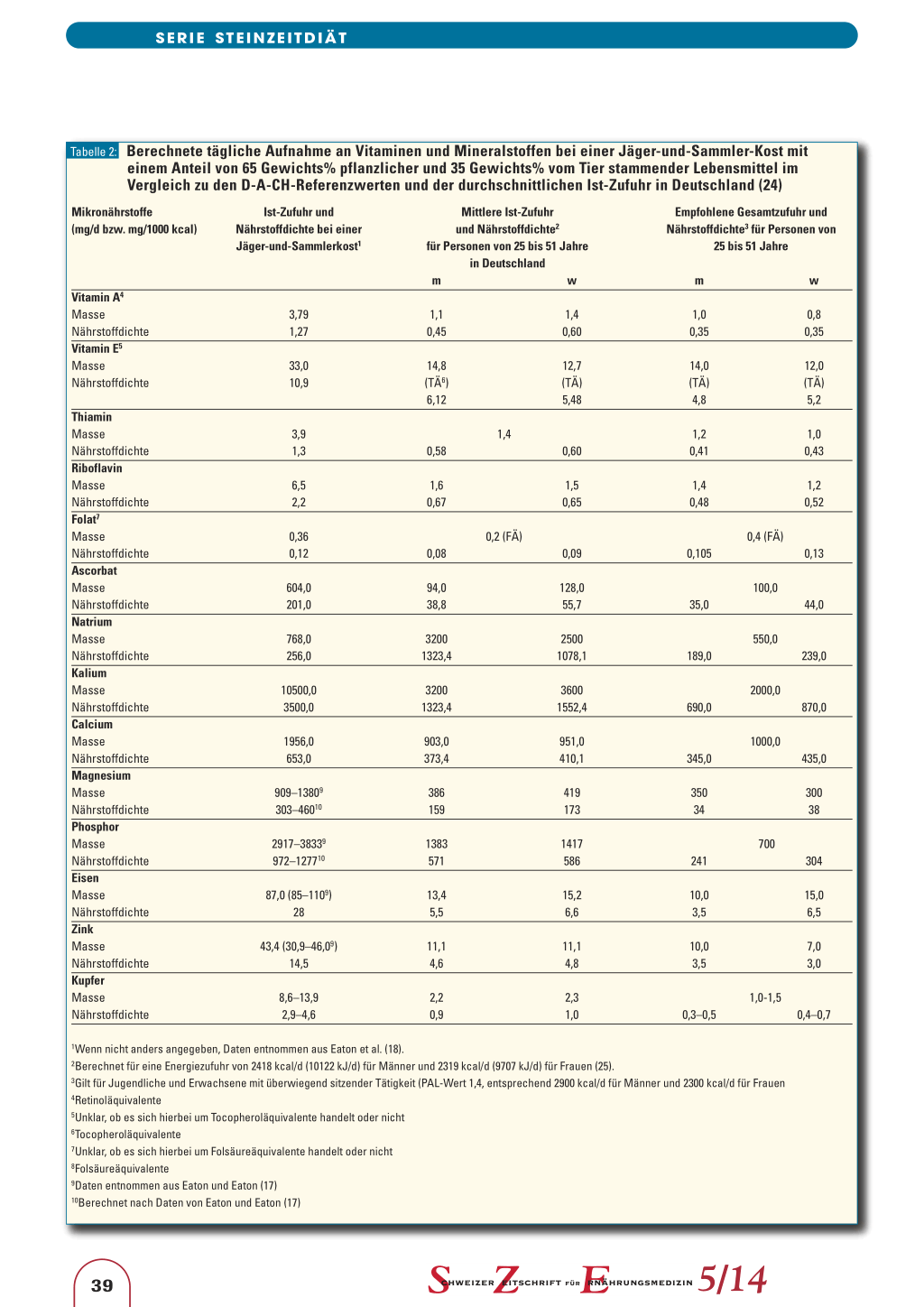 1Wenn nicht anders angegeben, Daten entnommen aus Eaton et al. (18). 2Berechnet für eine Energiezufuhr von 2418 kcal/d (10122 kJ/d) für Männer und 2319 kcal/d (9707 kJ/d) für Frauen (25). 3Gilt für Jugendliche und Erwachsene mit überwiegend sitzender Tätigkeit (PAL-Wert 1,4, entsprechend 2900 kcal/d für Männer und 2300 kcal/d für Frauen 4Retinoläquivalente 5Unklar, ob es sich hierbei um Tocopheroläquivalente handelt oder nicht 6Tocopheroläquivalente 7Unklar, ob es sich hierbei um Folsäureäquivalente handelt oder nicht 8Folsäureäquivalente 9Daten entnommen aus Eaton und Eaton (17) 10Berechnet nach Daten von Eaton und Eaton (17)