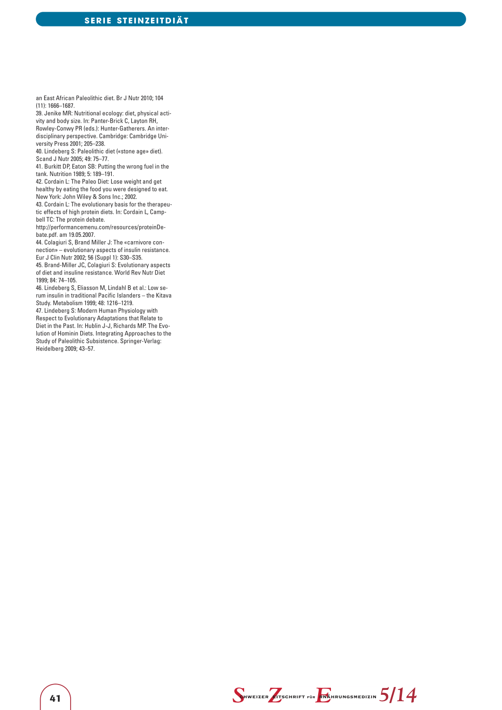 an East African Paleolithic diet. Br J Nutr 2010; 104 (11): 1666–1687. 39. Jenike MR: Nutritional ecology: diet, physical activity and body size. In: Panter-Brick C, Layton RH, Rowley-Conwy PR (eds.): Hunter-Gatherers. An interdisciplinary perspective. Cambridge: Cambridge University Press 2001; 205–238. 40. Lindeberg S: Paleolithic diet («stone age» diet). Scand J Nutr 2005; 49: 75–77. 41. Burkitt DP, Eaton SB: Putting the wrong fuel in the tank. Nutrition 1989; 5: 189–191. 42. Cordain L: The Paleo Diet: Lose weight and get healthy by eating the food you were designed to eat. New York: John Wiley & Sons Inc.; 2002. 43. Cordain L: The evolutionary basis for the therapeutic effects of high protein diets. In: Cordain L, Campbell TC: The protein debate. http://performancemenu.com/resources/proteinDebate.pdf. am 19.05.2007. 44. Colagiuri S, Brand Miller J: The «carnivore connection» – evolutionary aspects of insulin resistance. Eur J Clin Nutr 2002; 56 (Suppl 1): S30–S35. 45. Brand-Miller JC, Colagiuri S: Evolutionary aspects of diet and insuline resistance. World Rev Nutr Diet 1999; 84: 74–105. 46. Lindeberg S, Eliasson M, Lindahl B et al.: Low serum insulin in traditional Pacific Islanders – the Kitava Study. Metabolism 1999; 48: 1216–1219. 47. Lindeberg S: Modern Human Physiology with Respect to Evolutionary Adaptations that Relate to Diet in the Past. In: Hublin J-J, Richards MP. The Evolution of Hominin Diets. Integrating Approaches to the Study of Paleolithic Subsistence. Springer-Verlag: Heidelberg 2009; 43–57.