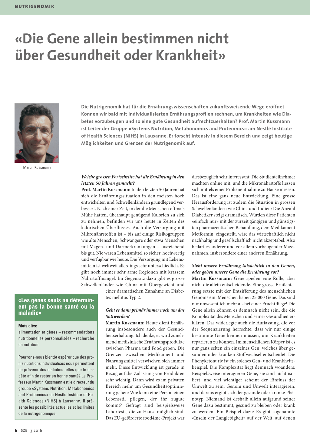 Die Nutrigenomik hat für die Ernährungswissenschaften zukunftsweisende Wege eröffnet. Können wir bald mit individualisierten Ernährungsprofilen rechnen, um Krankheiten wie Diabetes vorzubeugen und so eine gute Gesundheit aufrechtzuerhalten? Prof. Martin Kussmann ist Leiter der Gruppe «Systems Nutrition, Metabonomics and Proteomics» am Nestlé Institute of Health Sciences (NIHS) in Lausanne. Er forscht intensiv in diesem Bereich und zeigt heutige Möglichkeiten und Grenzen der Nutrigenomik auf.