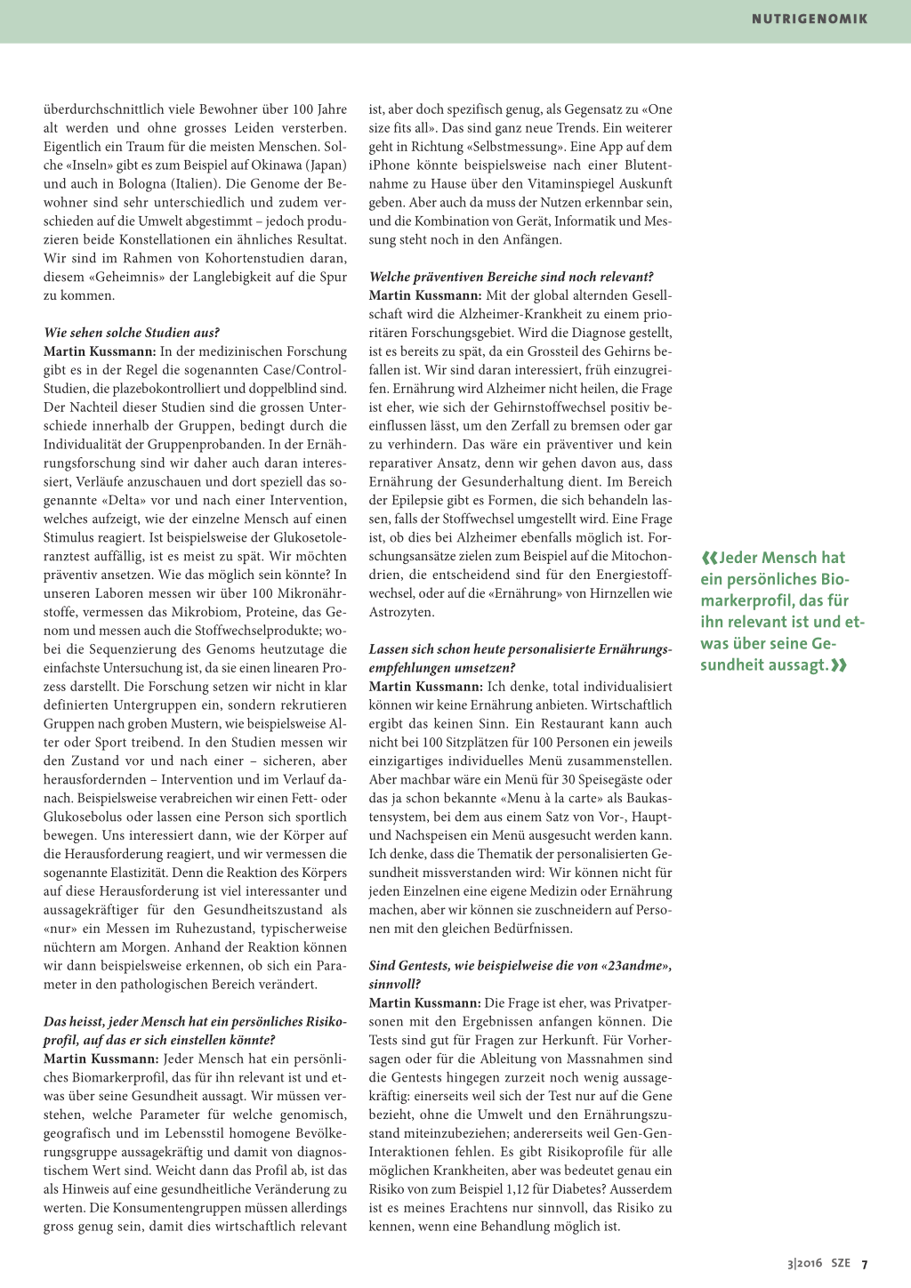 Lassen sich schon heute personalisierte Ernährungsempfehlungen umsetzen? Martin Kussmann: Ich denke, total individualisiert können wir keine Ernährung anbieten. Wirtschaftlich ergibt das keinen Sinn. Ein Restaurant kann auch nicht bei 100 Sitzplätzen für 100 Personen ein jeweils einzigartiges individuelles Menü zusammenstellen. Aber machbar wäre ein Menü für 30 Speisegäste oder das ja schon bekannte «Menu à la carte» als Baukastensystem, bei dem aus einem Satz von Vor-, Hauptund Nachspeisen ein Menü ausgesucht werden kann. Ich denke, dass die Thematik der personalisierten Gesundheit missverstanden wird: Wir können nicht für jeden Einzelnen eine eigene Medizin oder Ernährung machen, aber wir können sie zuschneidern auf Personen mit den gleichen Bedürfnissen.