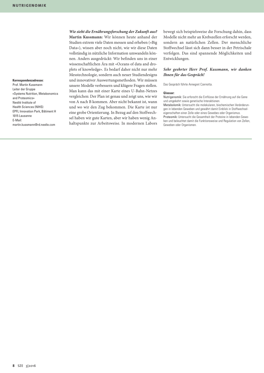 Korrespondenzadresse: Prof. Martin Kussmann Leiter der Gruppe «Systems Nutrition, Metabonomics and Proteomics» Nestlé Institute of Health Sciences (NIHS) EPFL Innovation Park, Bâtiment H 1015 Lausanne E-Mail: martin.kussmann@rd.nestle.com