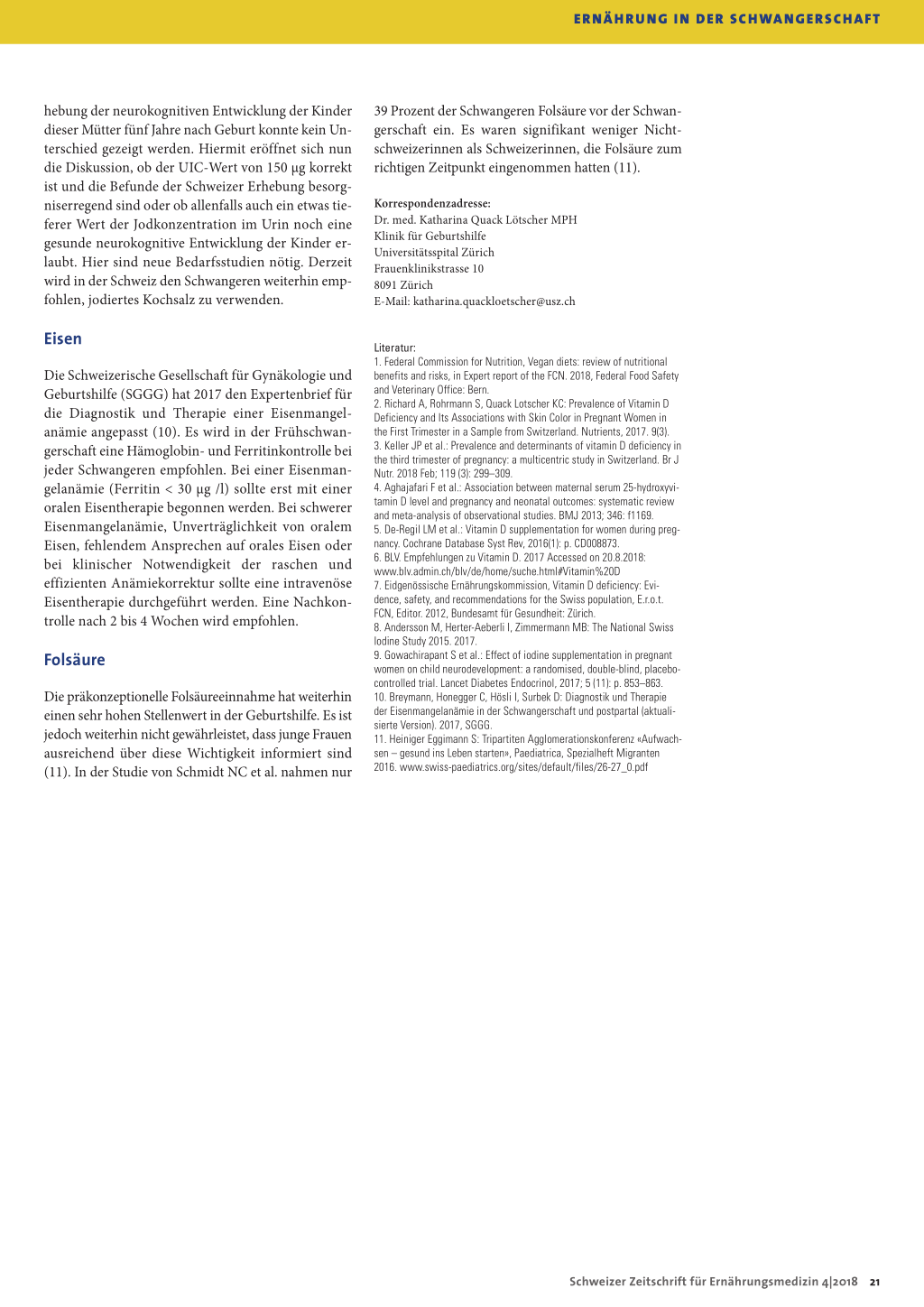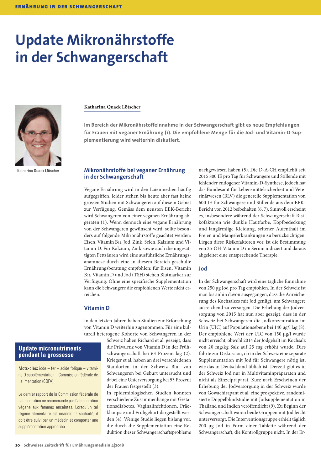 Literatur: 1. Federal Commission for Nutrition, Vegan diets: review of nutritional benefits and risks, in Expert report of the FCN. 2018, Federal Food Safety and Veterinary Office: Bern. 2. Richard A, Rohrmann S, Quack Lotscher KC: Prevalence of Vitamin D Deficiency and Its Associations with Skin Color in Pregnant Women in the First Trimester in a Sample from Switzerland. Nutrients, 2017. 9(3). 3. Keller JP et al.: Prevalence and determinants of vitamin D deficiency in the third trimester of pregnancy: a multicentric study in Switzerland. Br J Nutr. 2018 Feb; 119 (3): 299–309. 4. Aghajafari F et al.: Association between maternal serum 25-hydroxyvitamin D level and pregnancy and neonatal outcomes: systematic review and meta-analysis of observational studies. BMJ 2013; 346: f1169. 5. De-Regil LM et al.: Vitamin D supplementation for women during pregnancy. Cochrane Database Syst Rev, 2016(1): p. CD008873. 6. BLV. Empfehlungen zu Vitamin D. 2017 Accessed on 20.8.2018: www.blv.admin.ch/blv/de/home/suche.html#Vitamin%20D 7. Eidgenössische Ernährungskommission, Vitamin D deficiency: Evidence, safety, and recommendations for the Swiss population, E.r.o.t. FCN, Editor. 2012, Bundesamt für Gesundheit: Zürich. 8. Andersson M, Herter-Aeberli I, Zimmermann MB: The National Swiss Iodine Study 2015. 2017. 9. Gowachirapant S et al.: Effect of iodine supplementation in pregnant women on child neurodevelopment: a randomised, double-blind, placebocontrolled trial. Lancet Diabetes Endocrinol, 2017; 5 (11): p. 853–863. 10. Breymann, Honegger C, Hösli I, Surbek D: Diagnostik und Therapie der Eisenmangelanämie in der Schwangerschaft und postpartal (aktualisierte Version). 2017, SGGG. 11. Heiniger Eggimann S: Tripartiten Agglomerationskonferenz «Aufwachsen – gesund ins Leben starten», Paediatrica, Spezialheft Migranten 2016. www.swiss-paediatrics.org/sites/default/files/26-27_0.pdf