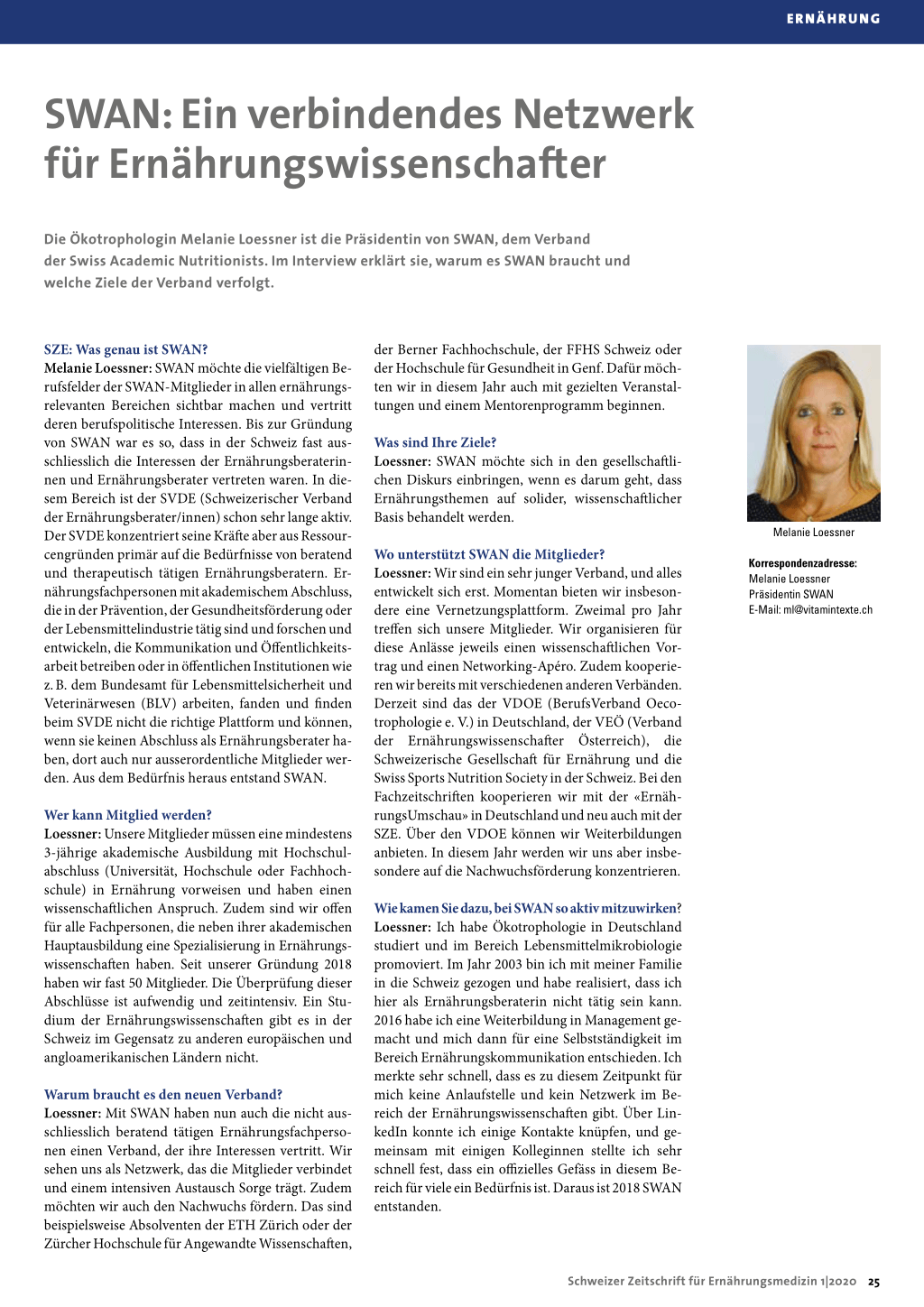der Berner Fachhochschule, der FFHS Schweiz oder der Hochschule für Gesundheit in Genf. Dafür möchten wir in diesem Jahr auch mit gezielten Veranstaltungen und einem Mentorenprogramm beginnen. Was sind Ihre Ziele? Loessner: SWAN möchte sich in den gesellschaftlichen Diskurs einbringen, wenn es darum geht, dass Ernährungsthemen auf solider, wissenschaftlicher Basis behandelt werden. Wo unterstützt SWAN die Mitglieder? Loessner: Wir sind ein sehr junger Verband, und alles entwickelt sich erst. Momentan bieten wir insbesondere eine Vernetzungsplattform. Zweimal pro Jahr treffen sich unsere Mitglieder. Wir organisieren für diese Anlässe jeweils einen wissenschaftlichen Vortrag und einen Networking-Apéro. Zudem kooperieren wir bereits mit verschiedenen anderen Verbänden. Derzeit sind das der VDOE (BerufsVerband Oecotrophologie e. V.) in Deutschland, der VEÖ (Verband der Ernährungswissenschafter Österreich), die Schweizerische Gesellschaft für Ernährung und die Swiss Sports Nutrition Society in der Schweiz. Bei den Fachzeitschriften kooperieren wir mit der «ErnährungsUmschau» in Deutschland und neu auch mit der SZE. Über den VDOE können wir Weiterbildungen anbieten. In diesem Jahr werden wir uns aber insbesondere auf die Nachwuchsförderung konzentrieren. Wie kamen Sie dazu, bei SWAN so aktiv mitzuwirken? Loessner: Ich habe Ökotrophologie in Deutschland studiert und im Bereich Lebensmittelmikrobiologie promoviert. Im Jahr 2003 bin ich mit meiner Familie in die Schweiz gezogen und habe realisiert, dass ich hier als Ernährungsberaterin nicht tätig sein kann. 2016 habe ich eine Weiterbildung in Management gemacht und mich dann für eine Selbstständigkeit im Bereich Ernährungskommunikation entschieden. Ich merkte sehr schnell, dass es zu diesem Zeitpunkt für mich keine Anlaufstelle und kein Netzwerk im Bereich der Ernährungswissenschaften gibt. Über LinkedIn konnte ich einige Kontakte knüpfen, und gemeinsam mit einigen Kolleginnen stellte ich sehr schnell fest, dass ein offizielles Gefäss in diesem Bereich für viele ein Bedürfnis ist. Daraus ist 2018 SWAN entstanden.