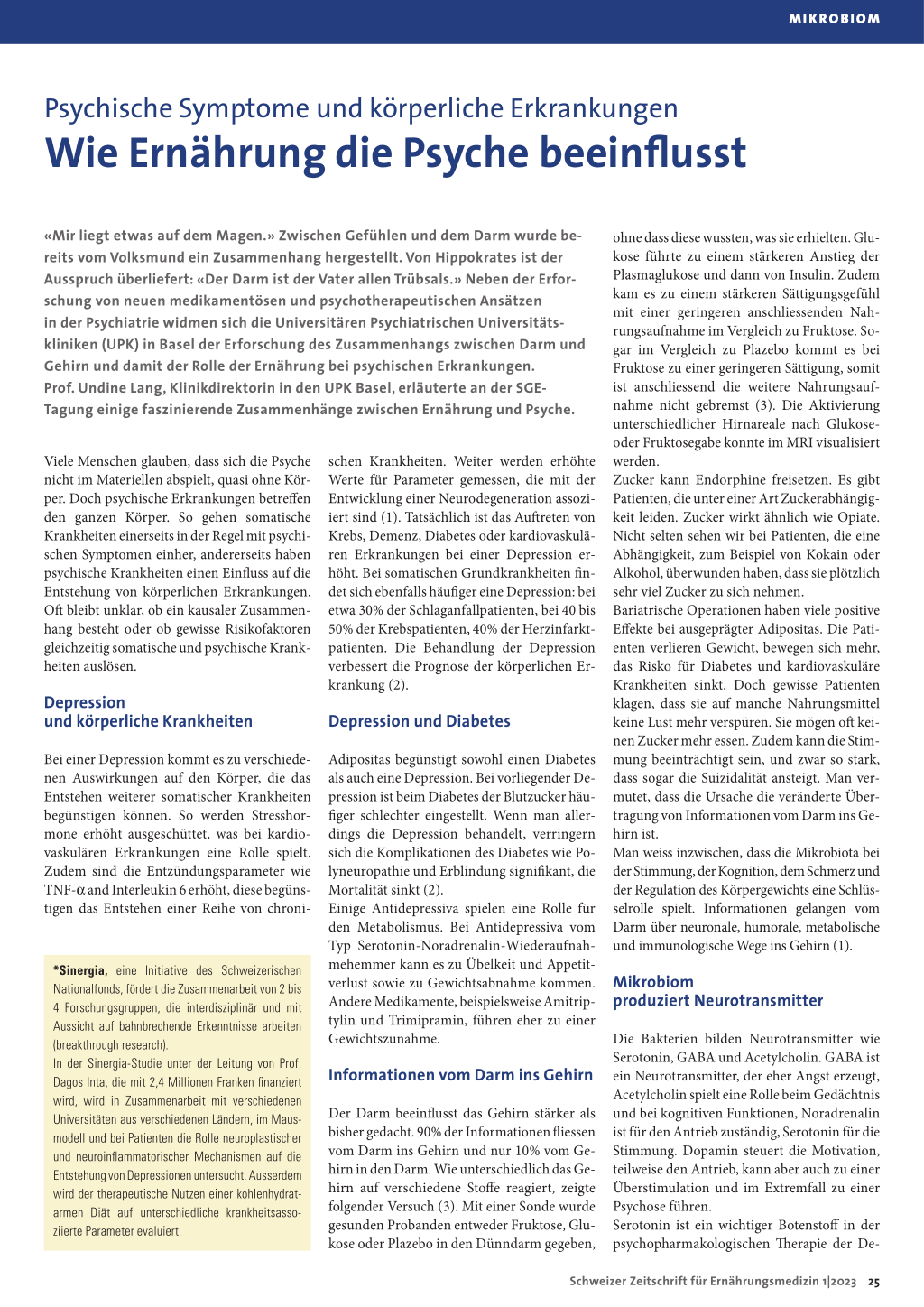 schweren Depression erhielten zusätzlich zur Standardtherapie entweder personalisierte Er nährungsempfehlungen, basierend auf einer mediterranen Diät, oder konnten an regelmäs sigen Treffen zur sozialen Unterstützung teil nehmen. Nach 12 Wochen zeigte die Gruppe mit Ernährungsberatung eine signifikante Ver besserung ihres Outcomes (14). Dank eines SINERGIA-Grants* von Prof. Dragos Inta (siehe Kasten), der mittlerweile an der Universität Fribourg forscht und lehrt, konnte in den UPK eine interdisziplinär an gelegte Studie zum Einsatz einer eiweissrei chen Diät bei D epressionen starten.