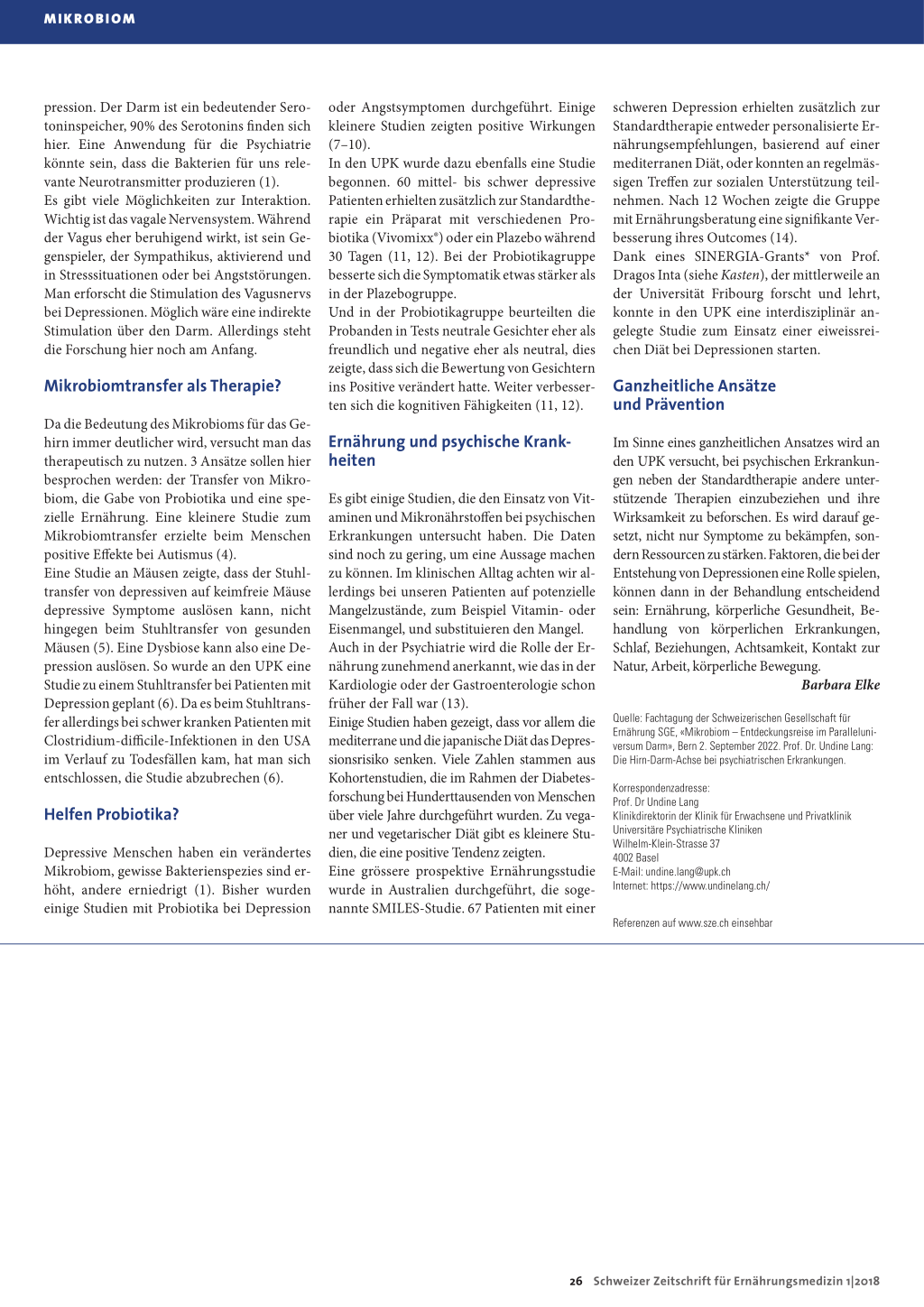 Quelle: Fachtagung der Schweizerischen Gesellschaft für Ernährung SGE, «Mikrobiom – Entdeckungsreise im Paralleluniversum Darm», Bern 2. September 2022. Prof. Dr. Undine Lang: Die Hirn-Darm-Achse bei psychiatrischen Erkrankungen. Korrespondenzadresse: Prof. Dr Undine Lang Klinikdirektorin der Klinik für Erwachsene und Privatklinik Universitäre Psychiatrische Kliniken Wilhelm-Klein-Strasse 37 4002 Basel E-Mail: undine.lang@upk.ch Internet: https://www.undinelang.ch/