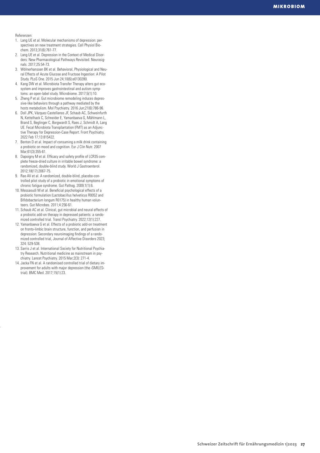 spectives on new treatment strategies. Cell Physiol Biochem. 2013;31(6):761-77. 2. Lang UE et al. Depression in the Context of Medical Disorders: New Pharmacological Pathways Revisited. Neurosignals. 2017;25:54-73. 3. Wölnerhanssen BK et al. Behavioral, Physiological and Neural Effects of Acute Glucose and Fructose Ingestion: A Pilot Study. PLoS One. 2015 Jun 24;10(6):e0130280. 4. Kang DW et al. Microbiota Transfer Therapy alters gut ecosystem and improves gastrointestinal and autism symptoms: an open-label study. Microbiome. 2017;5(1):10. 5. Zheng P et al. Gut microbiome remodeling induces depres sive-like behaviors through a pathway mediated by the hosts metabolism. Mol Psychiatry. 2016 Jun;21(6):786-96. 6. Doll JPK, Vázquez-Castellanos JF, Schaub AC, Schweinfurth N, Kettelhack C, Schneider E, Yamanbaeva G, Mählmann L, Brand S, Beglinger C, Borgwardt S, Raes J, Schmidt A, Lang UE. Fecal Microbiota Transplantation (FMT) as an Adjunctive Therapy for Depression-Case Report. Front Psychiatry. 2022 Feb 17;13:815422. 7. Benton D et al. Impact of consuming a milk drink containing a probiotic on mood and cognition. Eur J Clin Nutr. 2007 Mar;61(3):355-61. 8. Dapoigny M et al. Efficacy and safety profile of LCR35 complete freeze-dried culture in irritable bowel syndrome: a randomized, double-blind study. World J Gastroenterol. 2012;18(17):2067-75. 9. Rao AV et al. A randomized, double-blind, placebo-con trolled pilot study of a probiotic in emotional symptoms of chronic fatigue syndrome. Gut Pathog. 2009;1(1):6. 10. Messaoudi M et al. Beneficial psychological effects of a probiotic formulation (Lactobacillus helveticus R0052 and Bifidobacterium longum R0175) in healthy human volunteers. Gut Microbes. 2011;4:256-61. 11. Schaub AC et al. Clinical, gut microbial and neural effects of a probiotic add-on therapy in depressed patients: a randomized controlled trial. Transl Psychiatry. 2022;12(1):227. 12. Yamanbaeva G et al. Effects of a probiotic add-on treatment on fronto-limbic brain structure, function, and perfusion in depression: Secondary neuroimaging findings of a rando mized controlled trial, Journal of Affective Disorders 2023; 324: 529-538. 13. Sarris J et al. International Society for Nutritional Psychiatry Research. Nutritional medicine as mainstream in psychiatry. Lancet Psychiatry. 2015 Mar;2(3): 271-4. 14. Jacka FN et al. A randomised controlled trial of dietary improvement for adults with major depression (the ‹SMILES› trial). BMC Med. 2017;15(1):23.