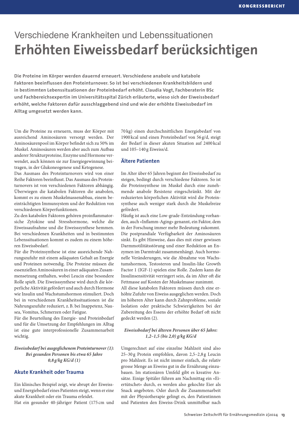 Die Proteine im Körper werden dauernd erneuert. Verschiedene anabole und katabole Faktoren beeinflussen den Proteinturnover. So ist bei verschiedenen Krankheitsbildern und in bestimmten Lebenssituationen der Proteinbedarf erhöht. Claudia Vogt, Fachberaterin BSc und Fachbereichsexpertin im Universitätsspital Zürich erläuterte, wieso sich der Eiweissbedarf erhöht, welche Faktoren dafür ausschlaggebend sind und wie der erhöhte Eiweissbedarf im Alltag umgesetzt werden kann.