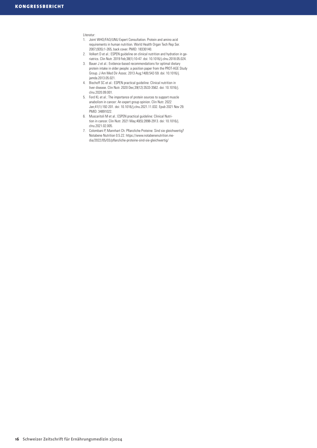 requirements in human nutrition. World Health Organ Tech Rep Ser. 2007;(935):1-265, back cover. PMID: 18330140. 2. Volkert D et al.: ESPEN guideline on clinical nutrition and hydration in geriatrics. Clin Nutr. 2019 Feb;38(1):10-47. doi: 10.1016/j.clnu.2018.05.024. 3. Bauer J et al.: Evidence-based recommendations for optimal dietary protein intake in older people: a position paper from the PROT-AGE Study Group. J Am Med Dir Assoc. 2013 Aug;14(8):542-59. doi: 10.1016/j. jamda.2013.05.021. 4. Bischoff SC et al.: ESPEN practical guideline: Clinical nutrition in liver disease. Clin Nutr. 2020 Dec;39(12):3533-3562. doi: 10.1016/j. clnu.2020.09.001. 5. Ford KL et al.: The importance of protein sources to support m uscle anabolism in cancer: An expert group opinion. Clin Nutr. 2022 Jan;41(1):192-201. doi: 10.1016/j.clnu.2021.11.032. Epub 2021 Nov 29. PMID: 34891022. 6. Muscaritoli M et al.: ESPEN practical guideline: Clinical Nutrition in cancer. Clin Nutr. 2021 May;40(5):2898-2913. doi: 10.1016/j. clnu.2021.02.005. 7. Colombani P, Mannhart Ch: Pflanzliche Proteine: Sind sie gleichwertig? Notabene Nutrition 0.5.22. https://www.notabenenutrition.media/2022/05/03/pflanzliche-proteine-sind-sie-gleichwertig/