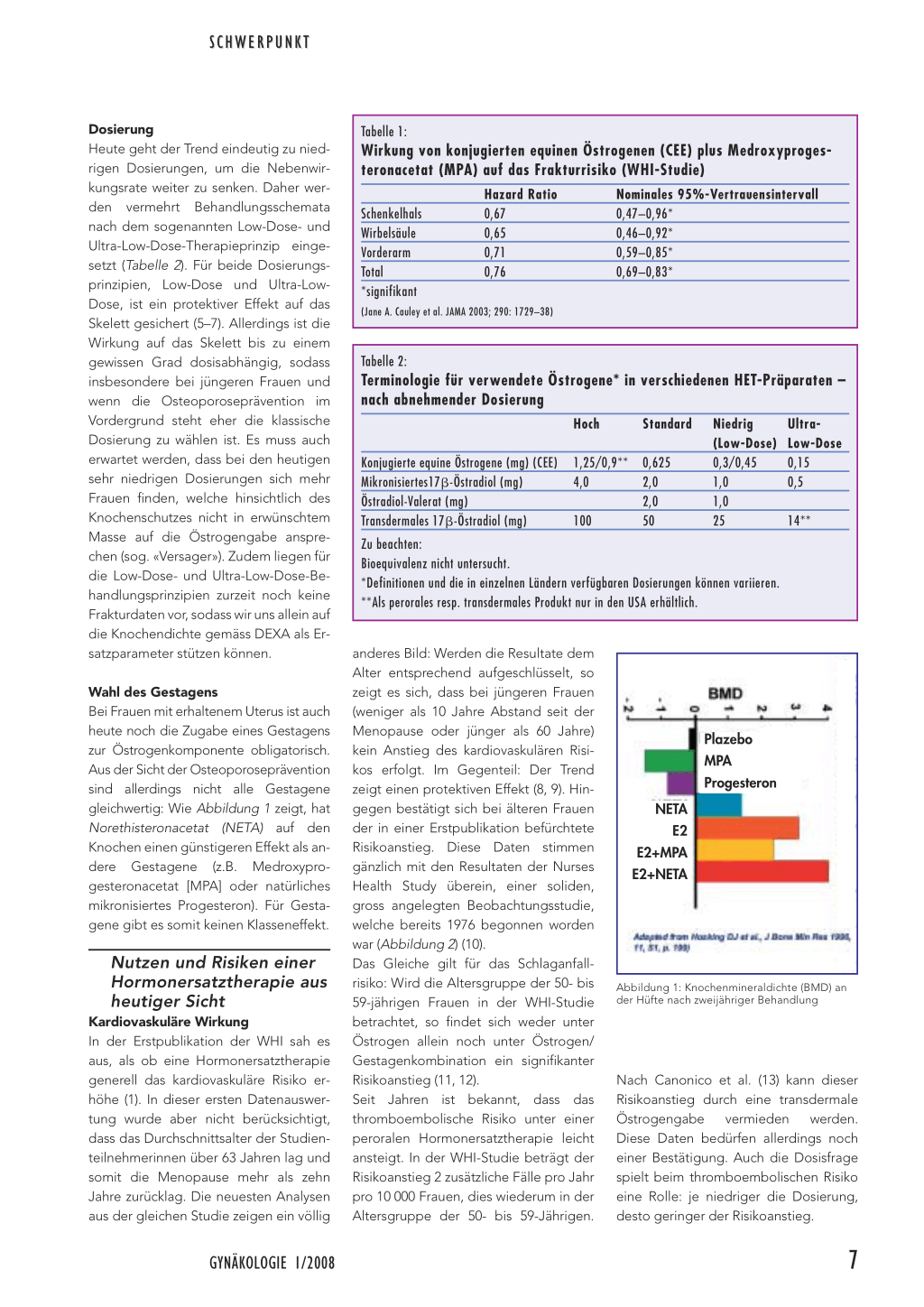 körperliche Aktivität, eine genügende Aufnahme von Kalzium (nach der Menopause 1200–1500 mg/Tag) und Vitamin D (nach heutiger Sicht mindestens 800 IE/Tag) und der Verzicht auf Rauchen. Bei Frauen, welche zur Behandlung ihres klimakterischen Syndroms Östrogene allein (EET) oder eine Östrogen/Gestagenkombination (HET) einnehmen, stellt die damit gleichzeitig erreichte Osteoporoseprävention einen zusätzlichen Nutzen zur primär beabsichtigten Linderung des klimakterischen Syndroms dar. Während das klimakterische Syndrom (sowie eine infolge Östrogenmangels verminderte Lebensqualität) für die HET/EET-Indikation nie umstritten war – bei Nichtansprechen auf mögliche Alternativen –, wurde die Rechtfertigung einer HET/EET zur Prävention der Osteoporose bei oligo- oder asymptomatischen Frauen als Folge der Erstpublikation der WHI infrage gestellt (1). Dass eine HET den postmenopausalen Knochenverlust verhindert, haben C. Christiansen et al. bereits 1981 (2) schlüssig nachgewiesen. Mit der PEPI-Studie (3) wurde der osteoprotektive Effekt erstmals mit einer doppelblinden randomisierten, plazebokontrollierten Versuchsanlage formell durch einen signifikanten Anstieg der Knochendichte sowohl an der Wirbelsäule als auch am Schenkelhals gesichert. Während diese ersten Studien sich noch als Ersatzparameter auf die Knochendichtemessung mittels DEXA stützten, zeigt die WHI (4) eine signifikante Verminderung des Frakturrisikos an allen erfassten Stellen des Skeletts (Wirbelsäule, Vorderarm, Schenkelhals; vgl. Tabelle 1). Sowohl die PEPI- als auch die WHI-Studie wurden mit konjugierten equinen Östrogenen (CEE, 0,625 mg pro Tag), fest kombiniert mit Medroxyprogesteronacetat (2,5 mg pro Tag), durchgeführt. Gleich gute Resultate werden aber auch mit peroralem 17-Östradiol (2 mg pro Tag) und transdermalem Östradiol (50-er Pflaster) erzielt. Diese Angaben entsprechen der klassischen Östrogendosierung.