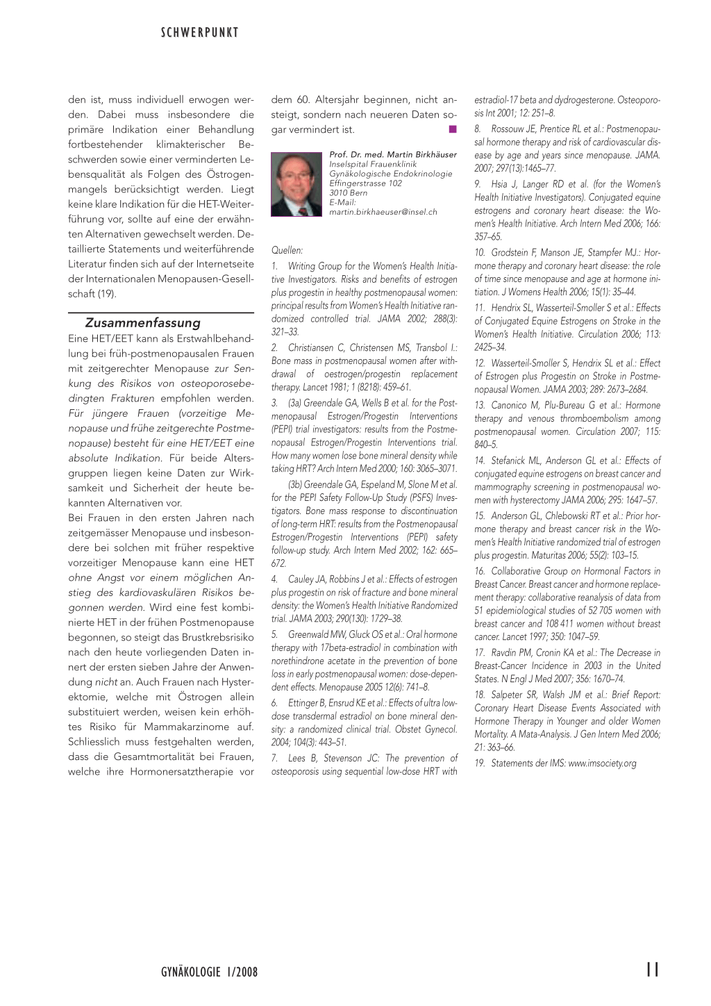 Prof. Dr. med. Martin Birkhäuser Inselspital Frauenklinik Gynäkologische Endokrinologie Effingerstrasse 102 3010 Bern E-Mail: martin.birkhaeuser@insel.ch