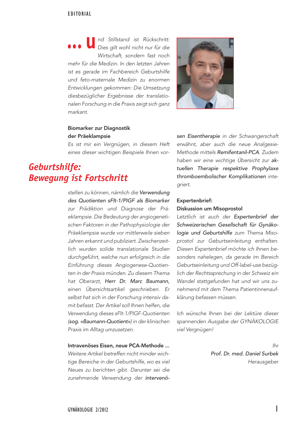 stellen zu können, nämlich die Verwendung des Quotienten sFlt-1/PIGF als Biomarker zur Prädiktion und Diagnose der Präeklampsie. Die Bedeutung der angiogenetischen Faktoren in der Pathophysiologie der Präeklampsie wurde vor mittlerweile sieben Jahren erkannt und publiziert. Zwischenzeitlich wurden solide translationale Studien durchgeführt, welche nun erfolgreich in die Einführung dieses Angiogenese-Quotienten in der Praxis münden. Zu diesem Thema hat Oberarzt, Herr Dr. Marc Baumann, einen Übersichtsartikel geschrieben. Er selbst hat sich in der Forschung intensiv damit befasst. Der Artikel soll Ihnen helfen, die Verwendung dieses sFlt-1/PIGF-Quotienten (sog. «Baumann-Quotient») in der klinischen Praxis im Alltag umzusetzen.