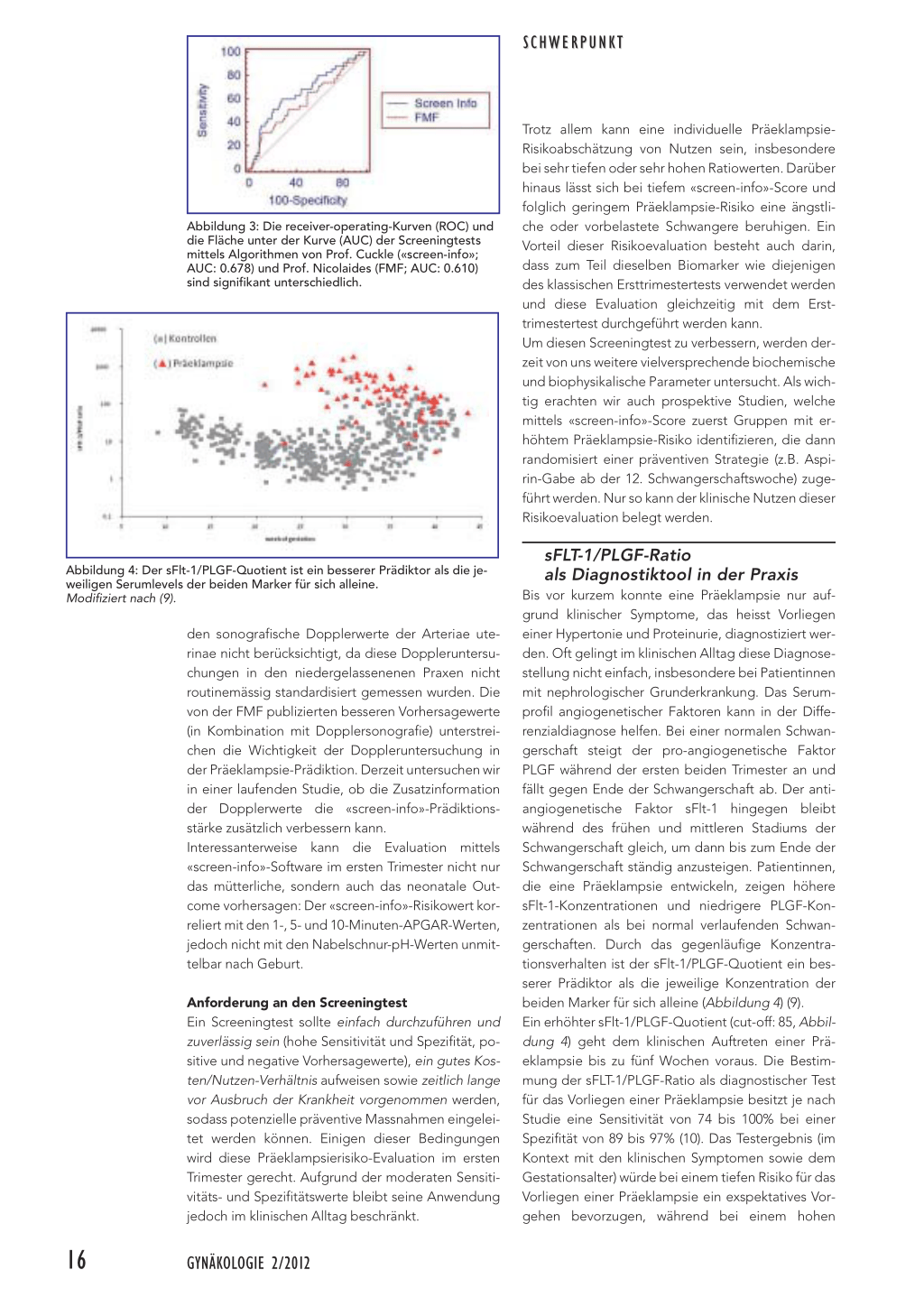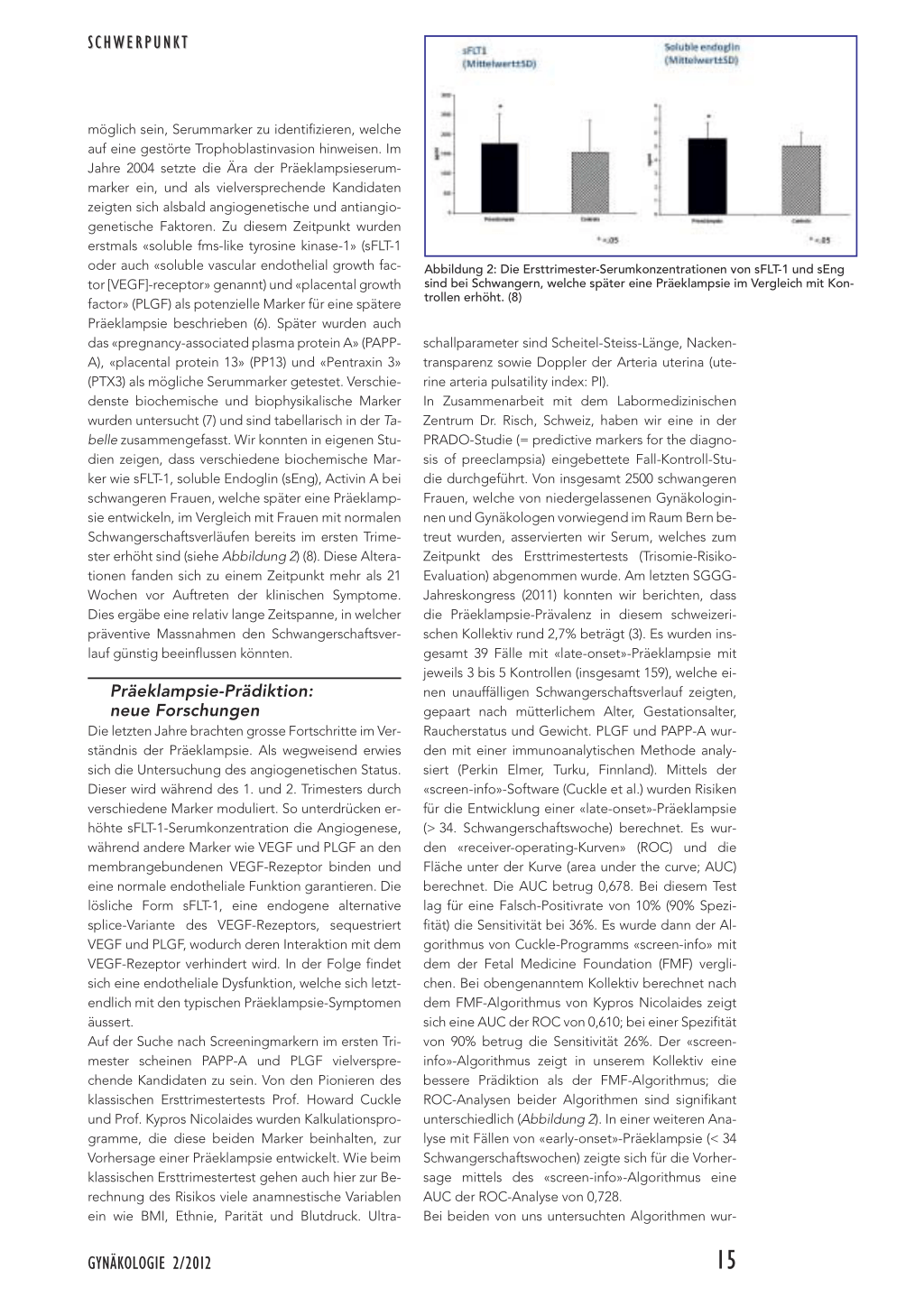 schallparameter sind Scheitel-Steiss-Länge, Nackentransparenz sowie Doppler der Arteria uterina (uterine arteria pulsatility index: PI). In Zusammenarbeit mit dem Labormedizinischen Zentrum Dr. Risch, Schweiz, haben wir eine in der PRADO-Studie (= predictive markers for the diagnosis of preeclampsia) eingebettete Fall-Kontroll-Studie durchgeführt. Von insgesamt 2500 schwangeren Frauen, welche von niedergelassenen Gynäkologinnen und Gynäkologen vorwiegend im Raum Bern betreut wurden, asservierten wir Serum, welches zum Zeitpunkt des Ersttrimestertests (Trisomie-RisikoEvaluation) abgenommen wurde. Am letzten SGGGJahreskongress (2011) konnten wir berichten, dass die Präeklampsie-Prävalenz in diesem schweizerischen Kollektiv rund 2,7% beträgt (3). Es wurden insgesamt 39 Fälle mit «late-onset»-Präeklampsie mit jeweils 3 bis 5 Kontrollen (insgesamt 159), welche einen unauffälligen Schwangerschaftsverlauf zeigten, gepaart nach mütterlichem Alter, Gestationsalter, Raucherstatus und Gewicht. PLGF und PAPP-A wurden mit einer immunoanalytischen Methode analysiert (Perkin Elmer, Turku, Finnland). Mittels der «screen-info»-Software (Cuckle et al.) wurden Risiken für die Entwicklung einer «late-onset»-Präeklampsie (> 34. Schwangerschaftswoche) berechnet. Es wurden «receiver-operating-Kurven» (ROC) und die Fläche unter der Kurve (area under the curve; AUC) berechnet. Die AUC betrug 0,678. Bei diesem Test lag für eine Falsch-Positivrate von 10% (90% Spezifität) die Sensitivität bei 36%. Es wurde dann der Algorithmus von Cuckle-Programms «screen-info» mit dem der Fetal Medicine Foundation (FMF) verglichen. Bei obengenanntem Kollektiv berechnet nach dem FMF-Algorithmus von Kypros Nicolaides zeigt sich eine AUC der ROC von 0,610; bei einer Spezifität von 90% betrug die Sensitivität 26%. Der «screeninfo»-Algorithmus zeigt in unserem Kollektiv eine bessere Prädiktion als der FMF-Algorithmus; die ROC-Analysen beider Algorithmen sind signifikant unterschiedlich (Abbildung 2). In einer weiteren Analyse mit Fällen von «early-onset»-Präeklampsie (< 34 Schwangerschaftswochen) zeigte sich für die Vorhersage mittels des «screen-info»-Algorithmus eine AUC der ROC-Analyse von 0,728. Bei beiden von uns untersuchten Algorithmen wur- GYNÄKOLOGIE 2/2012 15 SCHWERPUNKT Abbildung 3: Die receiver-operating-Kurven (ROC) und die Fläche unter der Kurve (AUC) der Screeningtests mittels Algorithmen von Prof. Cuckle («screen-info»; AUC: 0.678) und Prof. Nicolaides (FMF; AUC: 0.610) sind signifikant unterschiedlich. Trotz allem kann eine individuelle PräeklampsieRisikoabschätzung von Nutzen sein, insbesondere bei sehr tiefen oder sehr hohen Ratiowerten. Darüber hinaus lässt sich bei tiefem «screen-info»-Score und folglich geringem Präeklampsie-Risiko eine ängstliche oder vorbelastete Schwangere beruhigen. Ein Vorteil dieser Risikoevaluation besteht auch darin, dass zum Teil dieselben Biomarker wie diejenigen des klassischen Ersttrimestertests verwendet werden und diese Evaluation gleichzeitig mit dem Ersttrimestertest durchgeführt werden kann. Um diesen Screeningtest zu verbessern, werden derzeit von uns weitere vielversprechende biochemische und biophysikalische Parameter untersucht. Als wichtig erachten wir auch prospektive Studien, welche mittels «screen-info»-Score zuerst Gruppen mit erhöhtem Präeklampsie-Risiko identifizieren, die dann randomisiert einer präventiven Strategie (z.B. Aspirin-Gabe ab der 12. Schwangerschaftswoche) zugeführt werden. Nur so kann der klinische Nutzen dieser Risikoevaluation belegt werden. Abbildung 4: Der sFlt-1/PLGF-Quotient ist ein besserer Prädiktor als die jeweiligen Serumlevels der beiden Marker für sich alleine. Modifiziert nach (9). den sonografische Dopplerwerte der Arteriae uterinae nicht berücksichtigt, da diese Doppleruntersuchungen in den niedergelassenenen Praxen nicht routinemässig standardisiert gemessen wurden. Die von der FMF publizierten besseren Vorhersagewerte (in Kombination mit Dopplersonografie) unterstreichen die Wichtigkeit der Doppleruntersuchung in der Präeklampsie-Prädiktion. Derzeit untersuchen wir in einer laufenden Studie, ob die Zusatzinformation der Dopplerwerte die «screen-info»-Prädiktionsstärke zusätzlich verbessern kann. Interessanterweise kann die Evaluation mittels «screen-info»-Software im ersten Trimester nicht nur das mütterliche, sondern auch das neonatale Outcome vorhersagen: Der «screen-info»-Risikowert korreliert mit den 1-, 5- und 10-Minuten-APGAR-Werten, jedoch nicht mit den Nabelschnur-pH-Werten unmittelbar nach Geburt. Anforderung an den Screeningtest Ein Screeningtest sollte einfach durchzuführen und zuverlässig sein (hohe Sensitivität und Spezifität, positive und negative Vorhersagewerte), ein gutes Kosten/Nutzen-Verhältnis aufweisen sowie zeitlich lange vor Ausbruch der Krankheit vorgenommen werden, sodass potenzielle präventive Massnahmen eingeleitet werden können. Einigen dieser Bedingungen wird diese Präeklampsierisiko-Evaluation im ersten Trimester gerecht. Aufgrund der moderaten Sensitivitäts- und Spezifitätswerte bleibt seine Anwendung jedoch im klinischen Alltag beschränkt. sFLT-1/PLGF-Ratio als Diagnostiktool in der Praxis Bis vor kurzem konnte eine Präeklampsie nur aufgrund klinischer Symptome, das heisst Vorliegen einer Hypertonie und Proteinurie, diagnostiziert werden. Oft gelingt im klinischen Alltag diese Diagnosestellung nicht einfach, insbesondere bei Patientinnen mit nephrologischer Grunderkrankung. Das Serumprofil angiogenetischer Faktoren kann in der Differenzialdiagnose helfen. Bei einer normalen Schwangerschaft steigt der pro-angiogenetische Faktor PLGF während der ersten beiden Trimester an und fällt gegen Ende der Schwangerschaft ab. Der antiangiogenetische Faktor sFlt-1 hingegen bleibt während des frühen und mittleren Stadiums der Schwangerschaft gleich, um dann bis zum Ende der Schwangerschaft ständig anzusteigen. Patientinnen, die ei