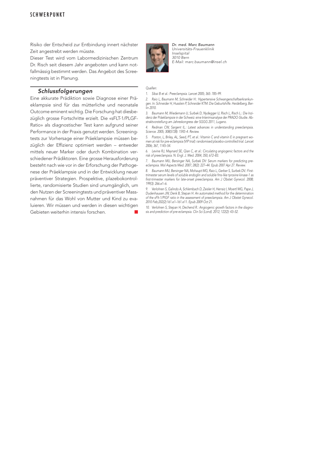 Screeningtests sind zunehmend im Fokus der klinischen Forschung. Aufgrund der klinischen und sozioökonomischen Relevanz ist es äusserst wichtig, eine Präeklampsie voraussagen zu können. Die Präeklampsie ist definiert durch eine neuaufgetretene Hypertonie und Proteinurie in der zweiten Schwangerschaftshälfte, das heisst nach der 20. Schwangerschaftswoche. Somit bleiben 20 Wochen Zeit für eine Prädiktion. Eine frühe Risikoevaluation ermöglicht, ein Kollektiv mit erhöhtem Risiko bezüglich einer späteren Präeklampsie zu identifizieren. Diese Patientinnengruppe sollte engmaschiger als Schwangere ohne erhöhtes Risiko überwacht werden und gegebenenfalls einer präventiven Massnahme wie der Aspirin-Gabe zugeführt werden. Für eine effiziente Prävention ist es jedoch unerlässlich, das Präeklampsierisiko frühzeitig evaluieren zu können. Verschiedene Algorithmen wurden entwickelt, um das Risiko einer subsequenten Präeklampsie abzuschätzen. Initial verliess man sich auf anamnestische Faktoren: Risikofaktoren bezüglich einer Präeklampsie sind (in absteigender Reihenfolge): Zustand nach schwerer Präeklampsie vor der 28. Schwangerschaftswoche, AngiotensinogenGenmutation, chronische Nierenkrankheit, Antiphospholipidsyndrom, chronische Hypertonie, Präeklampsie in der Familie, Zwillingsschwangerschaft, Alter über 40 Jahre, Primigravidität, Diabetes mellitus (2). Mit diesen anamnestischen Angaben lässt sich jedoch nur beschränkt ein individuelles Präeklampsierisiko bestimmen (1). Einen anderen Ansatz verfolgten klinische Forschungsgruppen, indem sie biophysikalische Marker analysierten. Zu diesen gehören unter anderem der sogenante «roll-over test» (Blutdruckerhöhung), die flussabhängige Vasodilatation (erhöht in der Schwangerschaft und erniedrigt bei Präeklampsie im Vergleich zur normalen Schwangerschaft) und der Angiotensin-II-Sensitivitätstest (erhöhtes Ansprechen bei Präeklampsie). Da diese Screeningtests frühestens im zweiten Trimester eine Beurteilung des Präeklampsie-Risikos erlauben, kann eine wirksame präventive Massnahme nicht greifen.