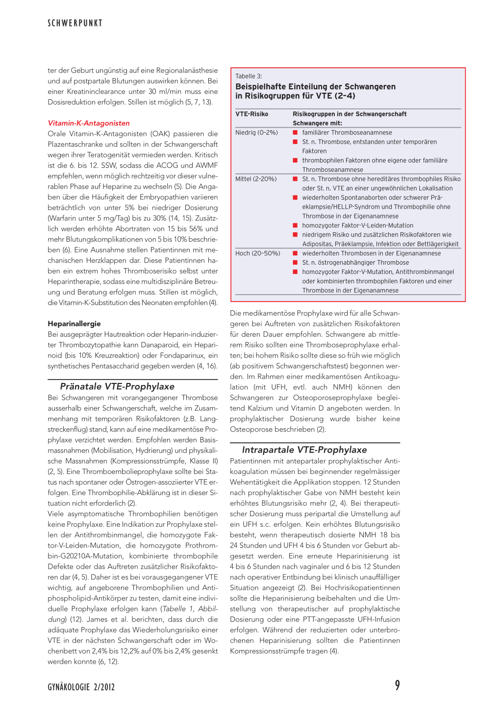 zwischen 0,5 und 1,7/1000 Geburten; dabei besteht eine Mortalitätsrate für VTE von 1,1/100 000 Geburten (6). Ray et al. zeigten 1999 in einer Metaanalyse, dass das Risiko für eine VTE in allen drei Schwangerschaftstrimestern gleich ist (2, 10). Gherman et al. berichteten, dass die Hälfte aller Thrombosen vor der 15. Schwangerschaftswoche (SSW) auftritt, während Pomp et al. das höchste Risiko im dritten Trimenon angeben (11, 9). Im Wochenbett, in dem sich die Hälfte der VTE ereignen, ist das Risiko 20-fach erhöht (8, 11). Eine Fallkontrollstudie aus den Niederlanden zeigt sogar einen 60-fachen Anstieg (9). Das Risiko bleibt bis 14 Wochen nach der Geburt bestehen, ist aber in den ersten 7 Tagen am höchsten (9).