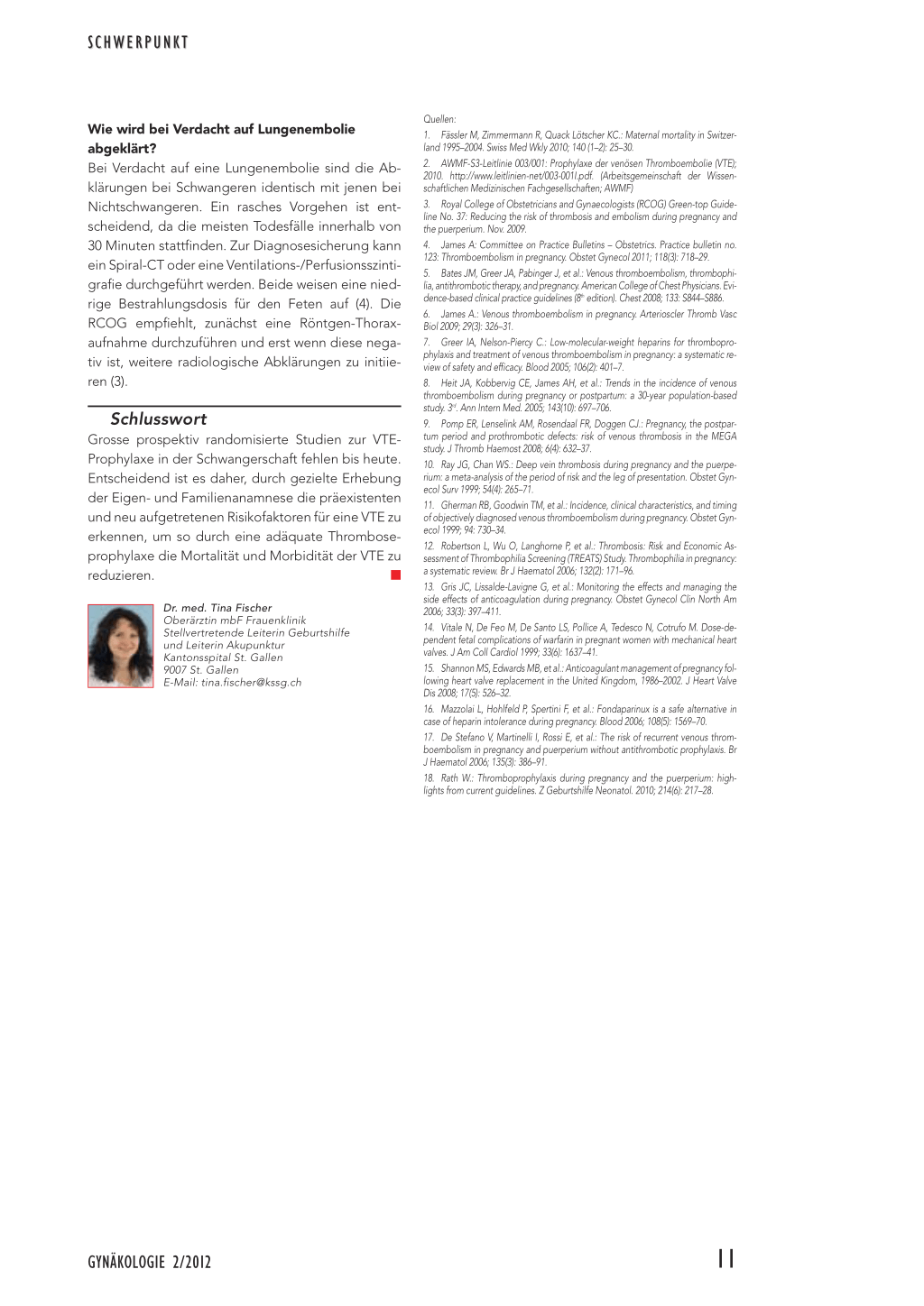 Dr. med. Tina Fischer Oberärztin mbF Frauenklinik Stellvertretende Leiterin Geburtshilfe und Leiterin Akupunktur Kantonsspital St. Gallen 9007 St. Gallen E-Mail: tina.fischer@kssg.ch
