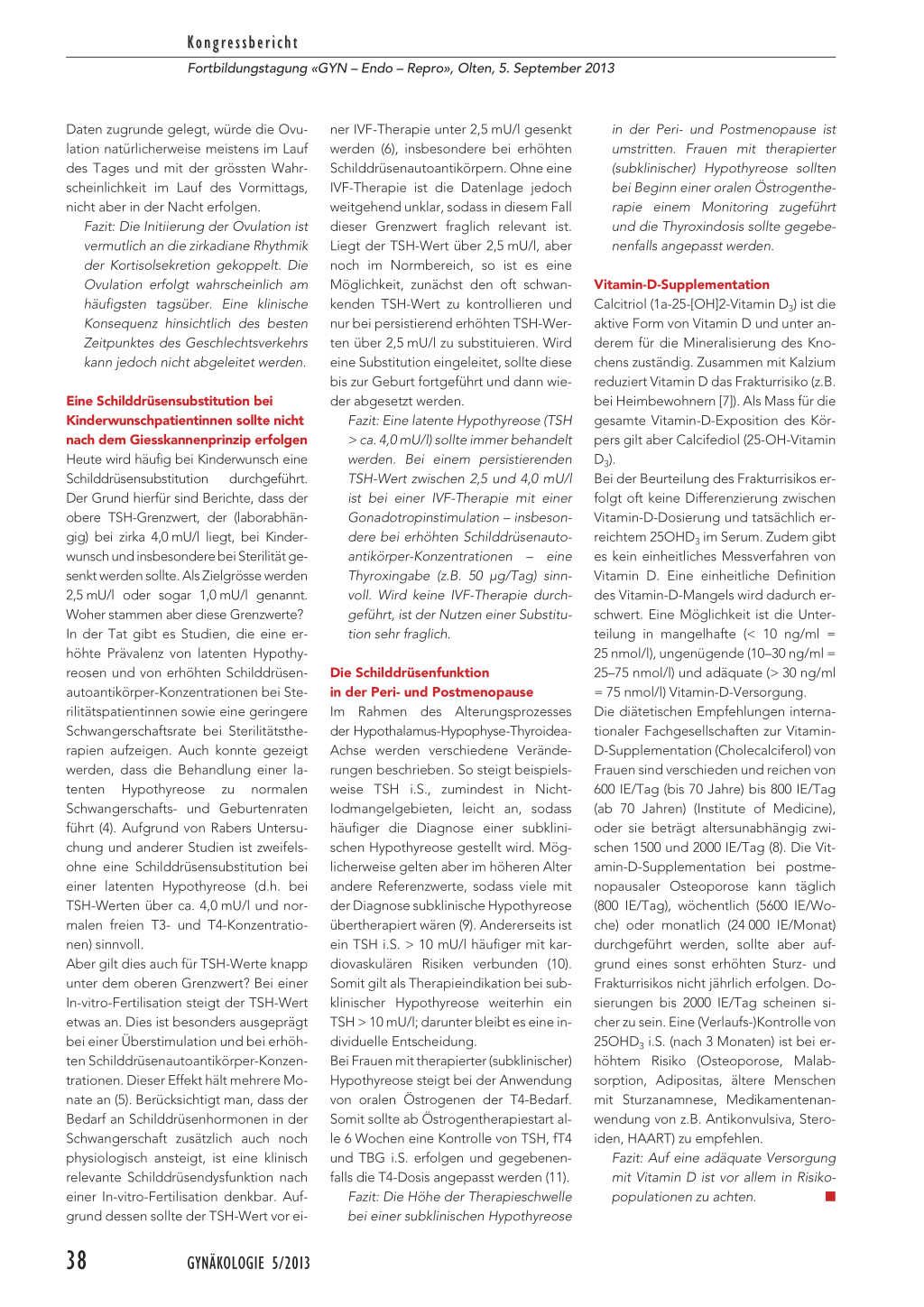 Eine Schilddrüsensubstitution bei Kinderwunschpatientinnen sollte nicht nach dem Giesskannenprinzip erfolgen Heute wird häufig bei Kinderwunsch eine Schilddrüsensubstitution durchgeführt. Der Grund hierfür sind Berichte, dass der obere TSH-Grenzwert, der (laborabhängig) bei zirka 4,0 mU/l liegt, bei Kinderwunsch und insbesondere bei Sterilität gesenkt werden sollte. Als Zielgrösse werden 2,5 mU/l oder sogar 1,0 mU/l genannt. Woher stammen aber diese Grenzwerte? In der Tat gibt es Studien, die eine erhöhte Prävalenz von latenten Hypothyreosen und von erhöhten Schilddrüsenautoantikörper-Konzentrationen bei Sterilitätspatientinnen sowie eine geringere Schwangerschaftsrate bei Sterilitätstherapien aufzeigen. Auch konnte gezeigt werden, dass die Behandlung einer latenten Hypothyreose zu normalen Schwangerschafts- und Geburtenraten führt (4). Aufgrund von Rabers Untersuchung und anderer Studien ist zweifelsohne eine Schilddrüsensubstitution bei einer latenten Hypothyreose (d.h. bei TSH-Werten über ca. 4,0 mU/l und normalen freien T3- und T4-Konzentrationen) sinnvoll. Aber gilt dies auch für TSH-Werte knapp unter dem oberen Grenzwert? Bei einer In-vitro-Fertilisation steigt der TSH-Wert etwas an. Dies ist besonders ausgeprägt bei einer Überstimulation und bei erhöhten Schilddrüsenautoantikörper-Konzentrationen. Dieser Effekt hält mehrere Monate an (5). Berücksichtigt man, dass der Bedarf an Schilddrüsenhormonen in der Schwangerschaft zusätzlich auch noch physiologisch ansteigt, ist eine klinisch relevante Schilddrüsendysfunktion nach einer In-vitro-Fertilisation denkbar. Aufgrund dessen sollte der TSH-Wert vor ei-