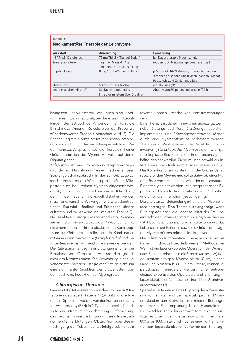 6 subserös < 50% intramural 7 subserös gestielt, in die Peritonealhöhle reichend 8 sonstige Hybridmyome reichen vom Endometrium bis zur Serosa. Die Leiomyome werden mit zwei Nummern separat aufgelistet, getrennt durch einen Binde- strich. Die erste Nummer bezieht sich auf das Endometrium, die zweite Nummer auf die Serosa. Tabelle 2: Untersuchungen zur frühzeitigen Diagnose von Myomen modifiziert nach Römer T et al.: Frauenarzt; 2017: 497–503 Anamnese Palpation (bimanuell) Ultraschall MRT Hb, Hk, Ferritin bei jeder Konsultation bei Beschwerden und jeder Konsultation bei Blutungsstörungen oder Tastbefund bei speziellen Fragestellungen, wenn keine abschliessende Beurteilung sonografisch möglich ist (Adenomyosis uteri, Leiomyosarkom, Therapierelevanz) bei Blutungsstörungen grösse, Vaskularisation und den Bezug der Myome zu Endometrium, Serosa und normalem Myometrium liefern (5). Sinnvoll ist die MRT-Untersuchung für Patientinnen, die einer minimalinvasiven Operation unterzogen werden zur Planung des Vorgehens und der Trokarplatzierung. Beim Vergleich der diagnostischen Methoden ist die Sensitivität zur Detektion der Myome für die MRT am höchsten. Submuköse Tumoren werden damit am besten erkannt (100% Sensitivität, 91% Spezifität). Sensitivität und Spezifität für die Sonografie betragen 83% und 90%, für die Hysteroskopie 82% und 87% (10). Problematisch ist die Differenzierung zwischen Uterusmyomen und Uterussarkomen. Kugelige, schnell wachsende Raumforderungen mit inhomogenen, echoreichen und echoarmen sowie stark vaskularisierten Arealen können sonografisch Hinweise auf das Vorliegen von Uterussarkomen liefern. Das MRT kann die Diagnose eines Sarkoms weder bestätigen noch ausschliessen (6). Die Sensitivität und Spezifität zur Detektion von Sarkomen sind in der MRT am höchsten. Nur 54% der Leiomyomsarkome werden präoperativ diagnostiziert. Das MRT hat hier die grösste Sensitivität und Spezifität. Leiden Betroffene unter Blutungsstörungen, sind Blutbild- und Ferritinbestimmungen (Hämoglobin, Hämatokrit) empfehlenswert, da myombedingte sekundäre Anämien oft unterschätzt werden. Eine Nierensonografie ist wichtig, um vor allem bei grossen intraligamentären Myomen eine Harnabflussstörung auszuschliessen. Diagnostische Untersuchungen sind in der Tabelle 2 zusammengefasst. Medikamentöse Therapie Der subjektive Leidensdruck der Patientin ist entscheidend für die Indikation zur Therapie, vor allem bei Blutungsstörungen, Unterbauchschmerzen und anderen myombedingten Beschwerden. Nicht hormonelle Behandlungen wie die Anwendung nicht steroidaler Antirheumatika (NSAR) und Tranhexamsäure reduzieren Schmerzen beziehungsweise den uterinen Blutverlust, beeinflussen jedoch nicht die Grösse der Myome (Tabelle 3) (1). Hormonelle Therapien, die sowohl die Myomgrösse als auch den Blutverlust effektiv reduzieren, sind Gonadotropin-Releasing-Hormon-(GnRH-)Agonisten und selektive Progesteron-Rezeptor-Modulatoren (SPRM). GnRH-Agonisten hemmen bei längerfristiger Applikation die Sekretion von LH und FSH aus der Hypophyse (7). Damit senken sie den Östrogenund Androgenspiegel. Die Östrogenrezeptoren der Myome werden vermindert stimuliert und sie nehmen an Grösse ab. Nebenwirkungen sind klimakterische Beschwerden mit Hitzewallungen, vaginaler Trockenheit, Stimmungsschwankungen und Osteopenie (7). Die Anwendung ist daher zeitlich limitiert. Die SPRM binden an den Progesteronrezeptor und weisen, je nach Substanz, agonistische wie auch antagonistische Eigenschaften auf (7). Ulipristalacetat ist ein oral wirksamer, synthetischer selektiver Progesteronrezeptor-Modulator mit steroidaler Struktur. Er ist gekennzeichnet durch einen gewebespezifischen partiellen Progesteron-antagonistischen Effekt. Damit wirkt Ulipristalacetat direkt auf Myome und verringert deren Grösse durch Apoptose und Hemmung der Zellproliferation. Die 32 GYNÄKOLOGIE 4/2017 UPDATE Tabelle 3: Medikamentöse Therapie der Leiomyome Wirkstoff NSAR z.B. Diclofenac Tranhexamsäure Ulipristalacetat Anwendung 75 mg Tbl. 2 x/Tag bei Bedarf Tag 1 der Mens 4 x 1 g, Tag 2 und 3 der Mens 3 x 1 g 5 mg Tbl. 1 x/Tag ohne Pause Mifepriston Levonorgestrel (Mirena®) 50 mg Tbl. 1 x/Woche Gestagen abgebendes Intrauterinsystem über 5 Jahre Bemerkung bei Dauertherapie Magenschutz reduziert Blutungsmenge perimenstruell präoperativ für 3 Monate; Intervallbehandlung: 3-monatige Behandlungszyklen, danach 1 Monat Pause (bis zu 4 Zyklen möglich) off label use (8) Abgabe von 20 μg Levonorgestrel/24 h häufigsten unerwünschten Wirkungen sind Kopfschmerzen, Endometriumhyperplasie und Hitzewallungen. Bei fast 80% der Anwenderinnen führt die Einnahme zur Amenorrhö, welche von den Frauen als wünschenswertes Ergebnis betrachtet wird (7). Die Behandlung mit Ulipristalacetat kann sowohl präoperativ als auch zur Erhaltungstherapie erfolgen. Zudem kann das Ansprechen auf die Therapie mit einer Grössenreduktion der Myome Hinweise auf deren Dignität geben. Mifepriston ist ein Progesteron-Rezeptor-Antagonist, der zur Durchführung eines medikamentösen Schwangerschaftsabbruchs in der Schweiz zugelassen ist. Vonseiten des Wirkungsprofils könnte Mifepriston auch bei uterinen Myomen eingesetzt werden (8). Dabei handelt es sich um einen off label use, der mit der Patientin individuell diskutiert werden muss. Unerwünschte Wirkungen wie Uteruskontraktionen, Durchfall, Übelkeit und Erbrechen können auftreten und die Anwendung limitieren (Tabelle 3). Der selektive Östrogenrezeptormodulator Ormeloxin, in Indien eingesetzt seit den 1990er-Jahren als nicht hormonales, nicht steroidales orales Kontrazeptivum zur Geburtenkontrolle, kann in Kombination mit einer kombinierten Pille (Ethinylestradiol und Desogestrel) zweimal wöchentlich angewendet werden. Die Rate abnormer vaginaler Blutungen ist unter der Einnahme vom Ormeloxin zwar reduziert, jedoch nicht das Myomvulomen. Die Anwendung eines Levonorgestrel-haltigen IUD (Mirena®) zeigt nicht nur 