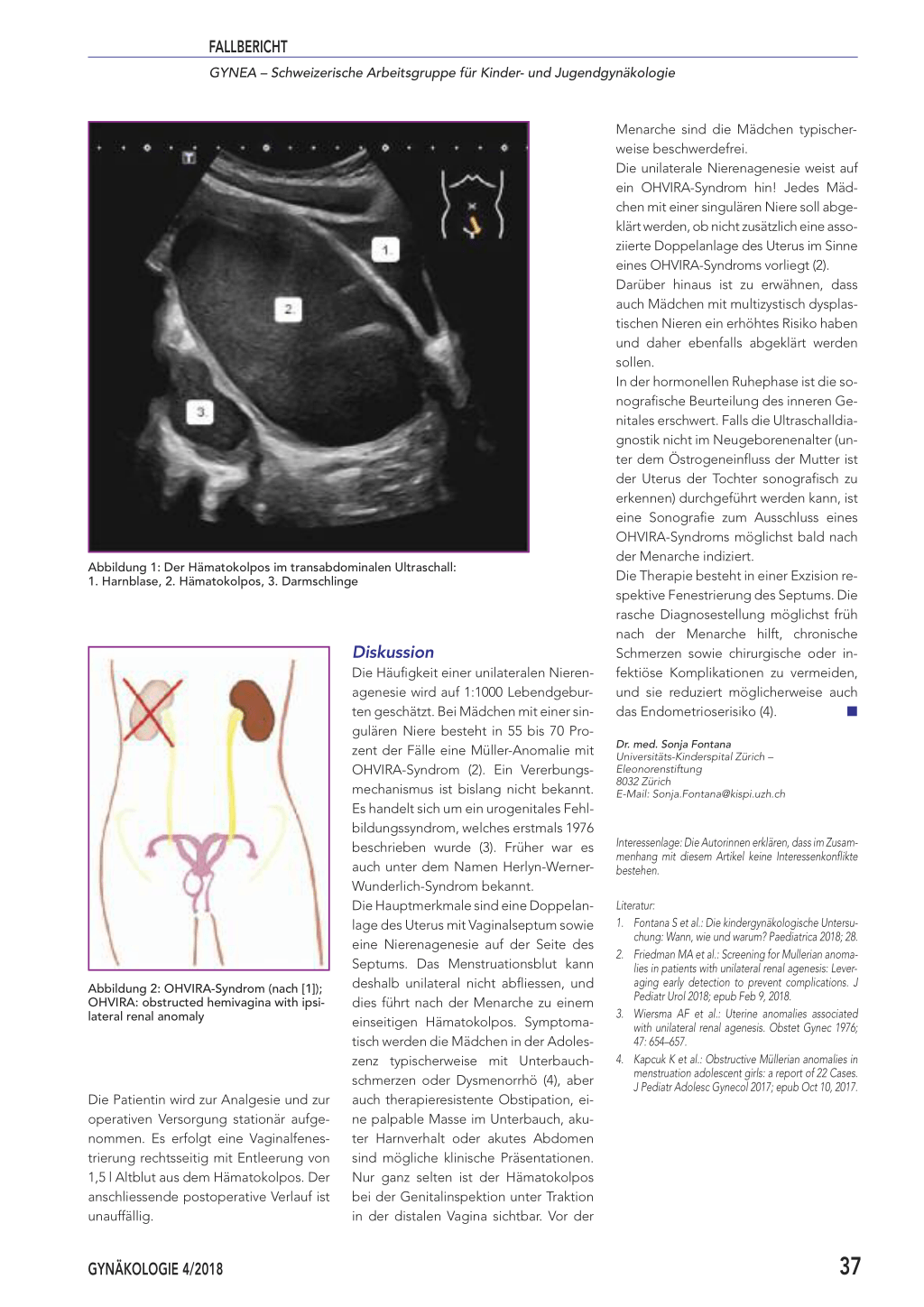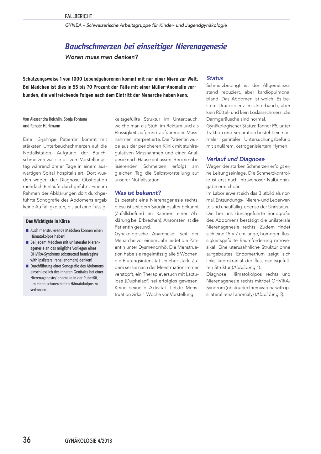 Die Häufigkeit einer unilateralen Nierenagenesie wird auf 1:1000 Lebendgeburten geschätzt. Bei Mädchen mit einer singulären Niere besteht in 55 bis 70 Prozent der Fälle eine Müller-Anomalie mit OHVIRA-Syndrom (2). Ein Vererbungsmechanismus ist bislang nicht bekannt. Es handelt sich um ein urogenitales Fehlbildungssyndrom, welches erstmals 1976 beschrieben wurde (3). Früher war es auch unter dem Namen Herlyn-WernerWunderlich-Syndrom bekannt. Die Hauptmerkmale sind eine Doppelanlage des Uterus mit Vaginalseptum sowie eine Nierenagenesie auf der Seite des Septums. Das Menstruationsblut kann deshalb unilateral nicht abfliessen, und dies führt nach der Menarche zu einem einseitigen Hämatokolpos. Symptomatisch werden die Mädchen in der Adoleszenz typischerweise mit Unterbauchschmerzen oder Dysmenorrhö (4), aber auch therapieresistente Obstipation, eine palpable Masse im Unterbauch, akuter Harnverhalt oder akutes Abdomen sind mögliche klinische Präsentationen. Nur ganz selten ist der Hämatokolpos bei der Genitalinspektion unter Traktion in der distalen Vagina sichtbar. Vor der