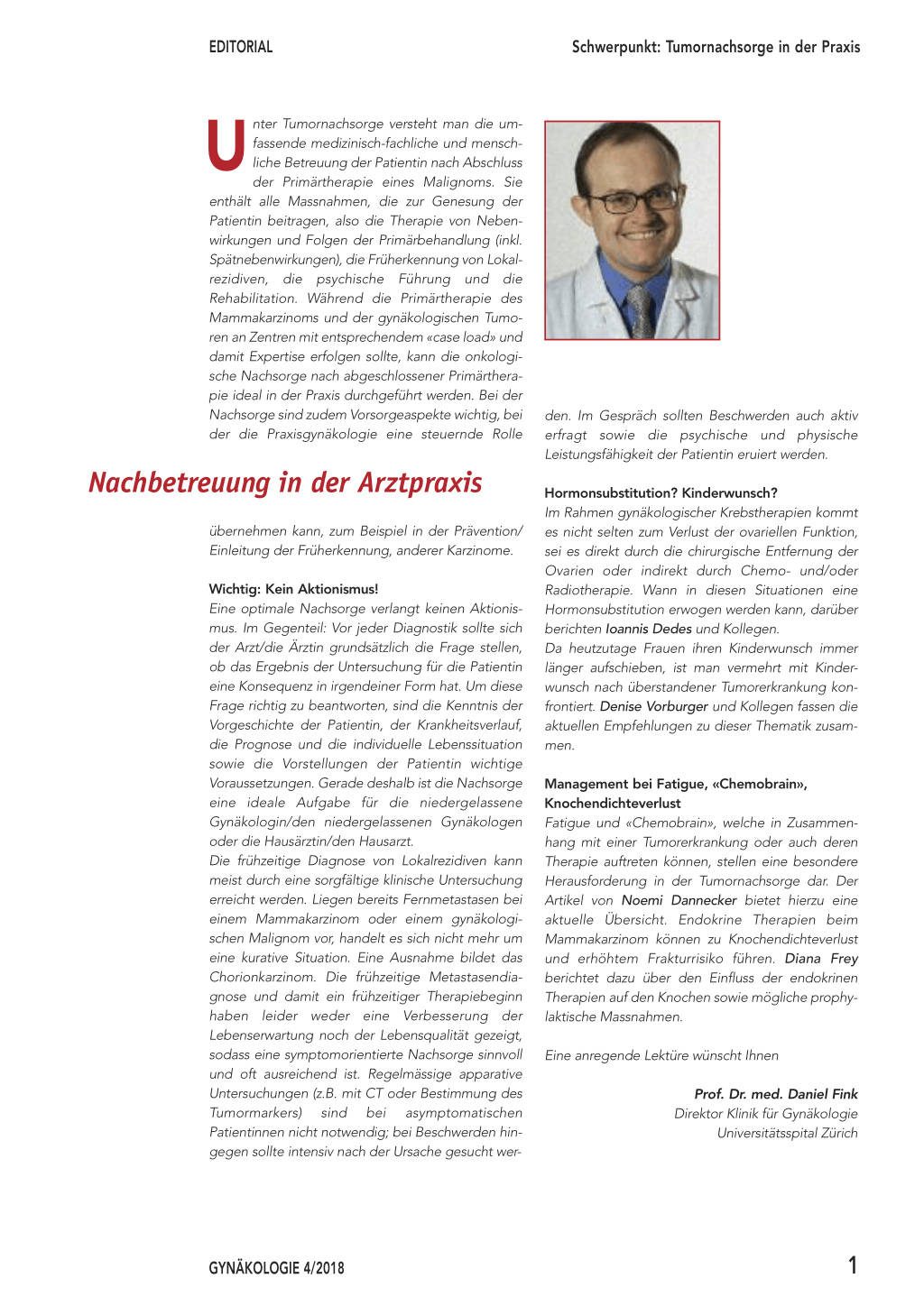 U nter Tumornachsorge versteht man die umfassende medizinisch-fachliche und menschliche Betreuung der Patientin nach Abschluss der Primärtherapie eines Malignoms. Sie enthält alle Massnahmen, die zur Genesung der Patientin beitragen, also die Therapie von Nebenwirkungen und Folgen der Primärbehandlung (inkl. Spätnebenwirkungen), die Früherkennung von Lokalrezidiven, die psychische Führung und die Rehabilitation. Während die Primärtherapie des Mammakarzinoms und der gynäkologischen Tumoren an Zentren mit entsprechendem «case load» und damit Expertise erfolgen sollte, kann die onkologische Nachsorge nach abgeschlossener Primärtherapie ideal in der Praxis durchgeführt werden. Bei der Nachsorge sind zudem Vorsorgeaspekte wichtig, bei der die Praxisgynäkologie eine steuernde Rolle