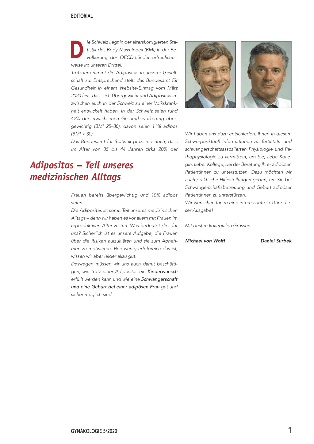 Wir haben uns dazu entschieden, Ihnen in diesem Schwerpunktheft Informationen zur fertilitäts- und schwangerschaftsassoziierten Physiologie und Pathophysiologie zu vermitteln, um Sie, liebe Kollegin, lieber Kollege, bei der Beratung Ihrer adipösen Patientinnen zu unterstützen. Dazu möchten wir auch praktische Hilfestellungen geben, um Sie bei Schwangerschaftsbetreuung und Geburt adipöser Patientinnen zu unterstützen. Wir wünschen Ihnen eine interessante Lektüre dieser Ausgabe!