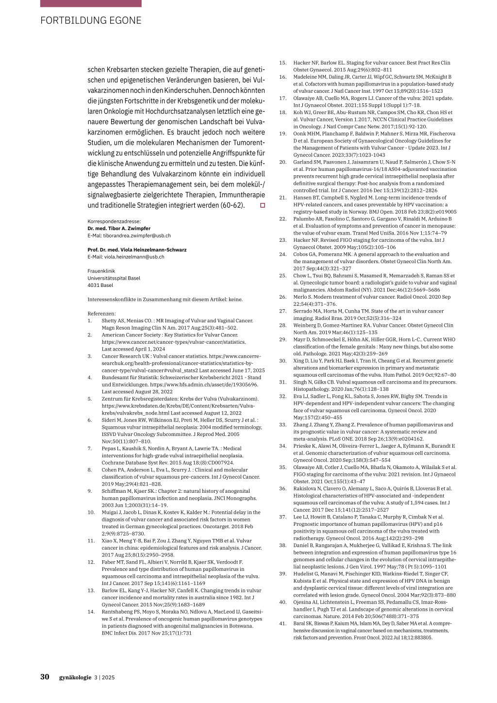 Zukunftsperspektiven Es ist wichtig, die Prognose des Vulvakarzinoms zu verbessern, insbesondere für Patientinnen mit einem Vulvakarzinom im fortgeschrittenen Stadium. Derzeit gibt es noch keine Evidenz, die ein Screening auf Vulvakarzinome in einer unselektierten Population stützt. Ausserdem sprechen primäre und rezidivierende Vulvakarzinome nur schlecht auf eine systemische Behandlung an und im Gegensatz zu anderen gynäkologi-