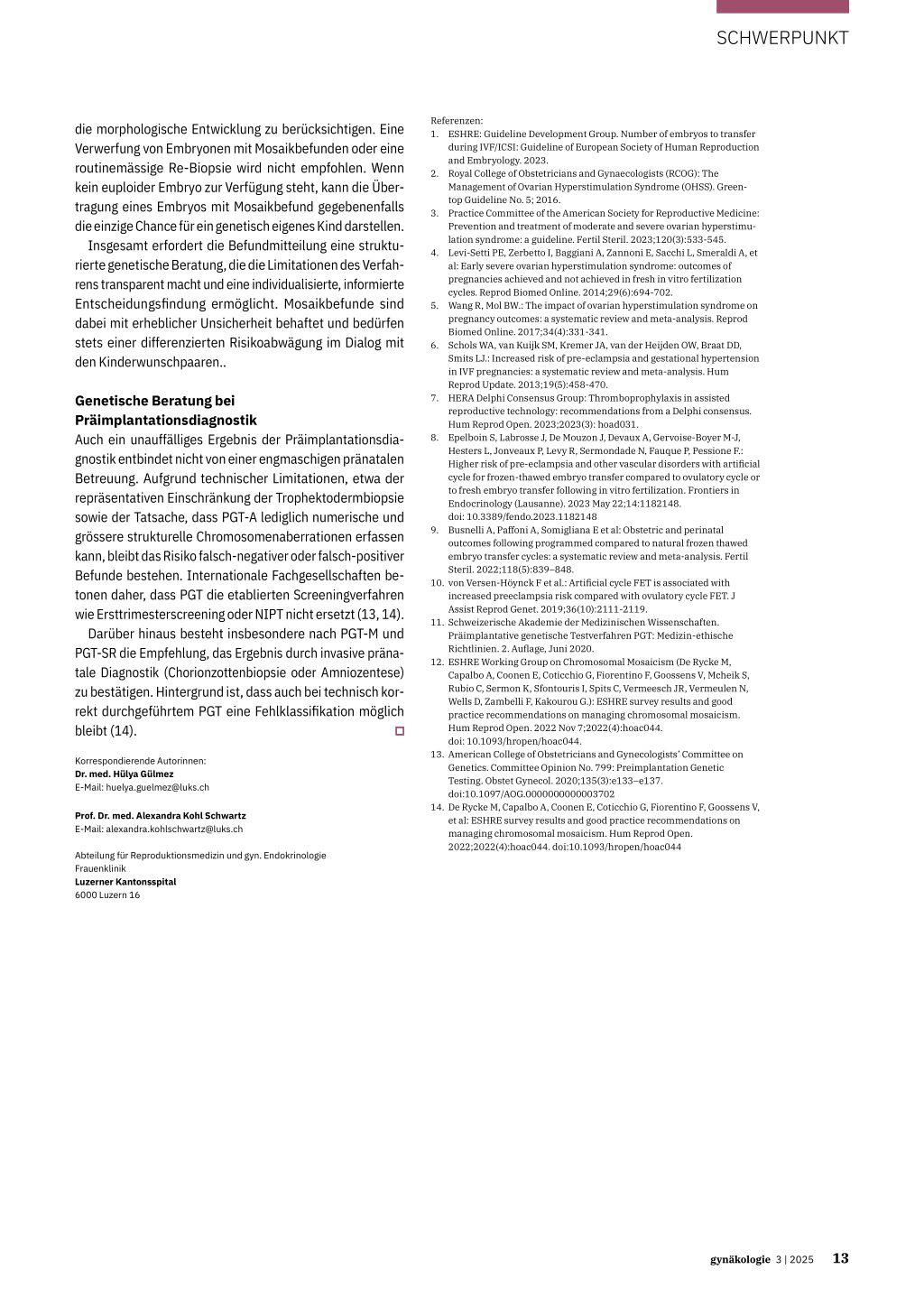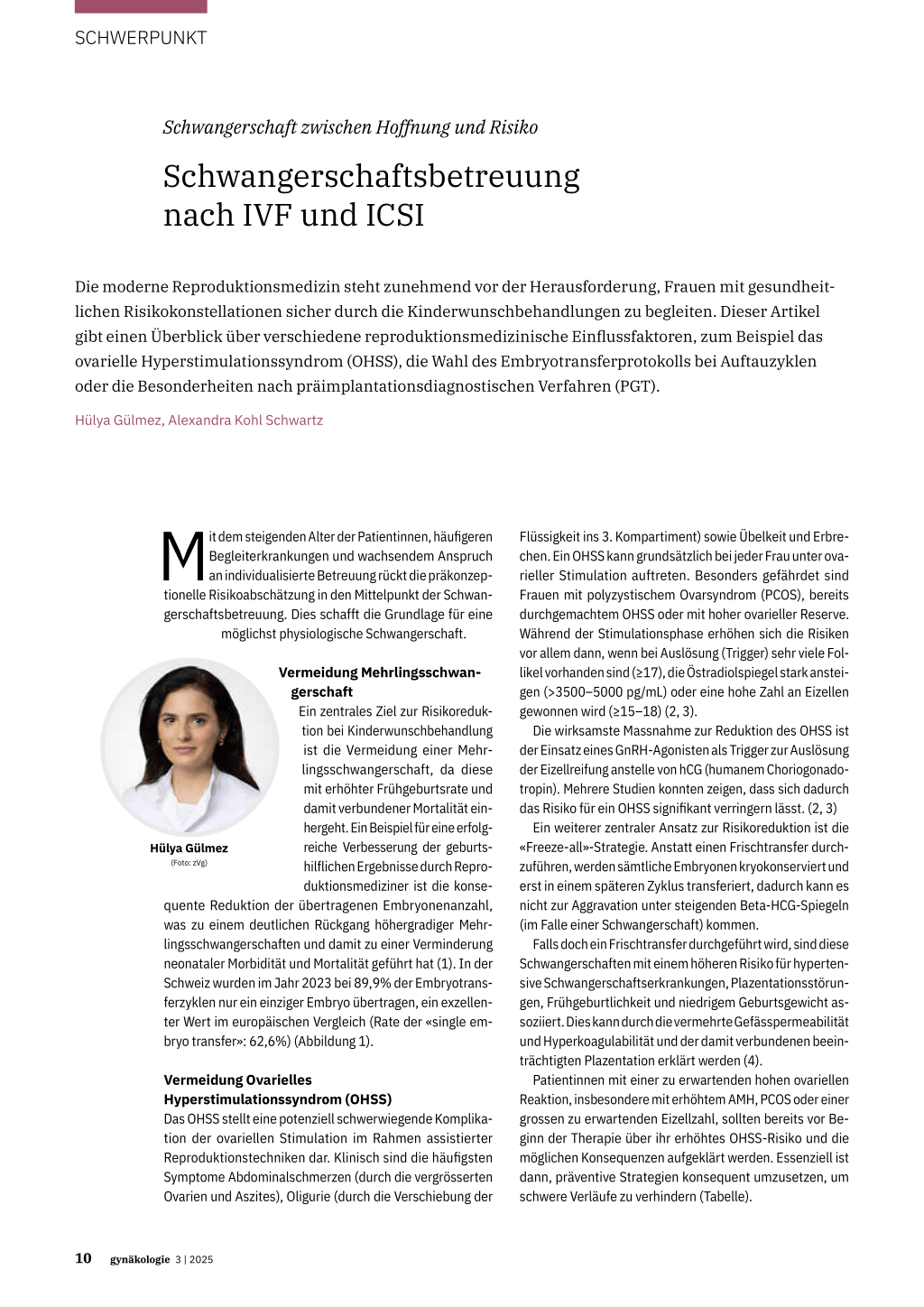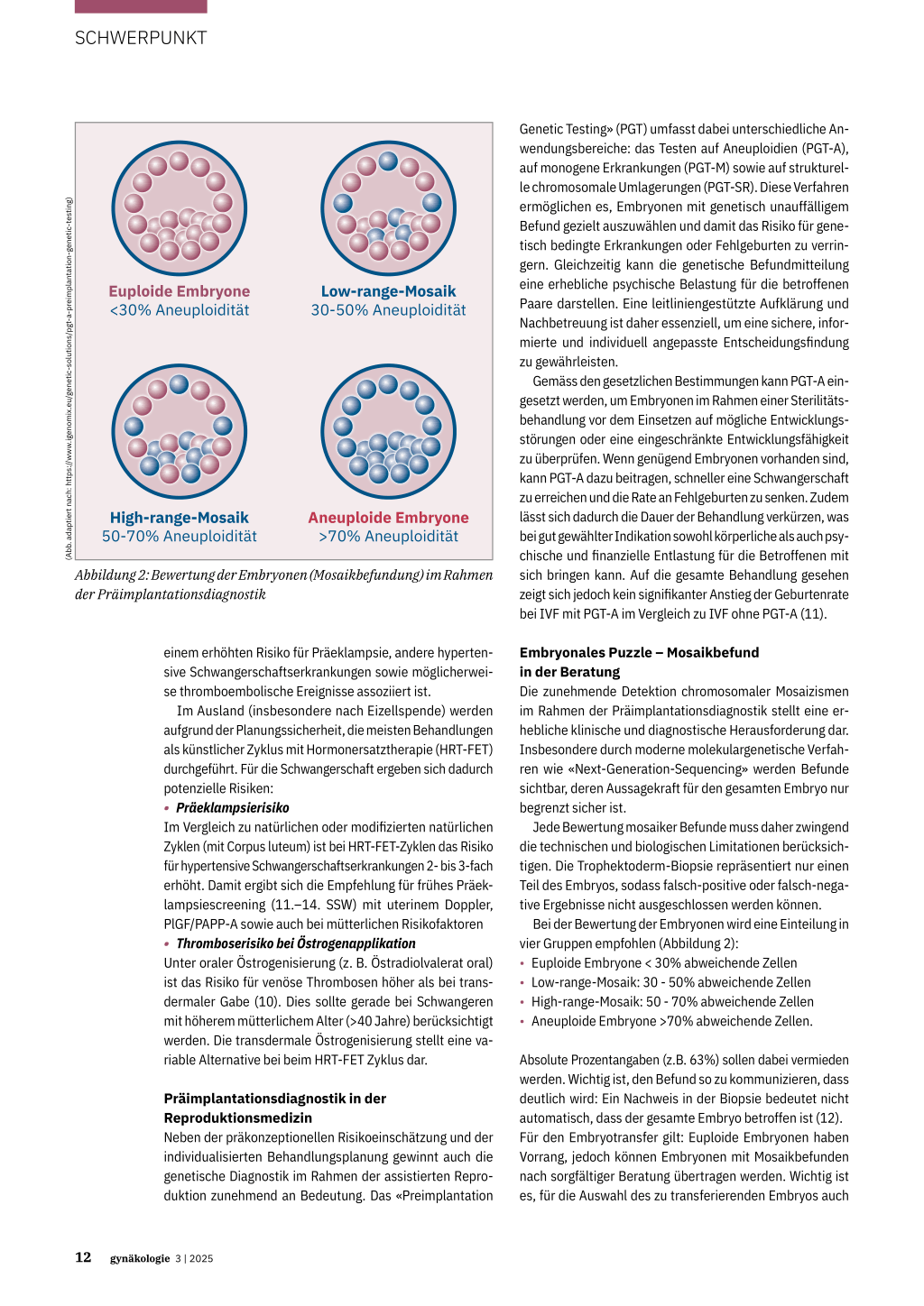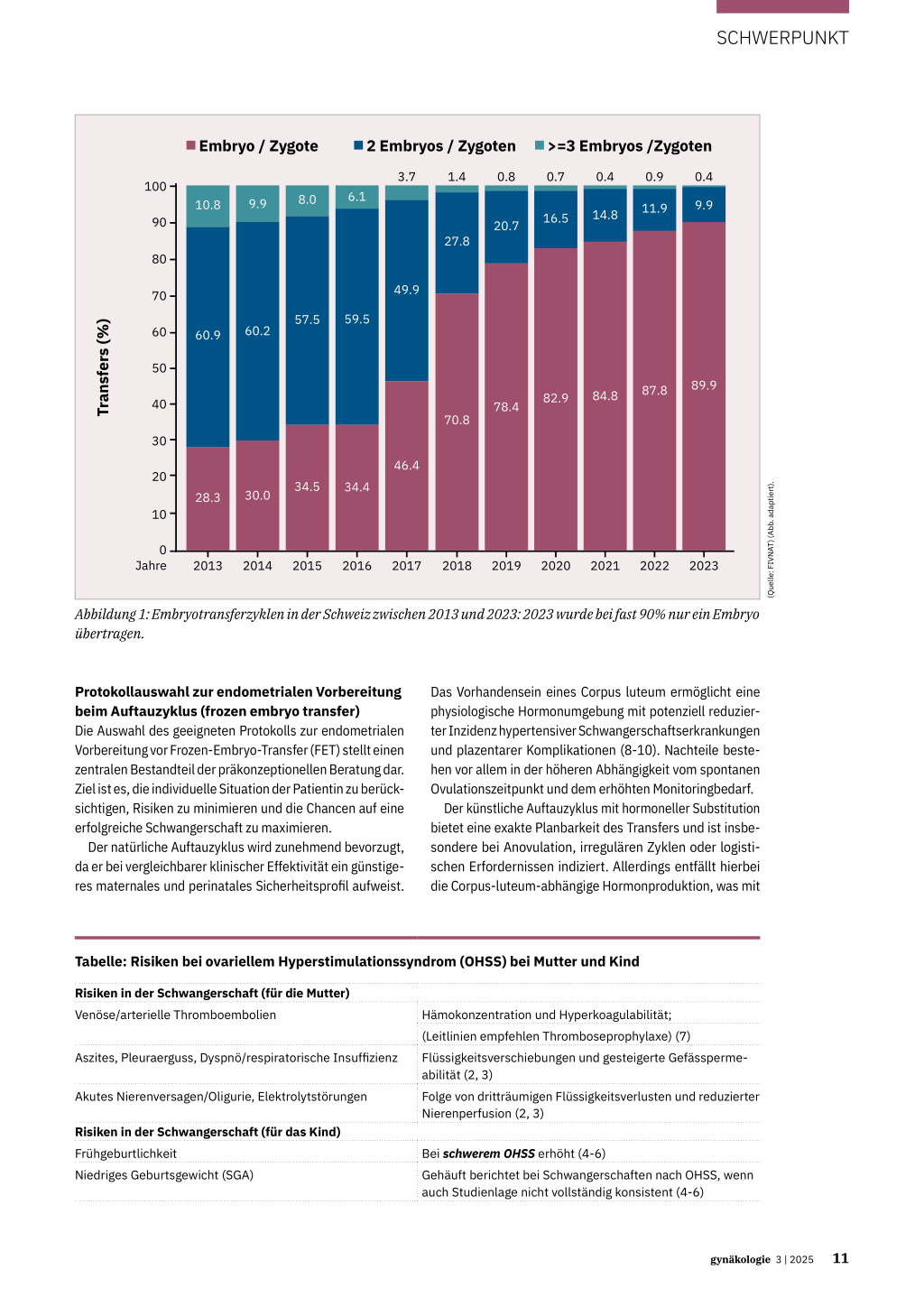 during IVF/ICSI: Guideline of European Society of Human Reproduction and Embryology. 2023. 2. Royal College of Obstetricians and Gynaecologists (RCOG): The Management of Ovarian Hyperstimulation Syndrome (OHSS). Greentop Guideline No. 5; 2016. 3. Practice Committee of the American Society for Reproductive Medicine: Prevention and treatment of moderate and severe ovarian hyperstimulation syndrome: a guideline. Fertil Steril. 2023;120(3):533-545. 4. Levi-Setti PE, Zerbetto I, Baggiani A, Zannoni E, Sacchi L, Smeraldi A, et al: Early severe ovarian hyperstimulation syndrome: outcomes of pregnancies achieved and not achieved in fresh in vitro fertilization cycles. Reprod Biomed Online. 2014;29(6):694-702. 5. Wang R, Mol BW.: The impact of ovarian hyperstimulation syndrome on pregnancy outcomes: a systematic review and meta-analysis. Reprod Biomed Online. 2017;34(4):331-341. 6. Schols WA, van Kuijk SM, Kremer JA, van der Heijden OW, Braat DD, Smits LJ.: Increased risk of pre-eclampsia and gestational hypertension in IVF pregnancies: a systematic review and meta-analysis. Hum Reprod Update. 2013;19(5):458-470. 7. HERA Delphi Consensus Group: Thromboprophylaxis in assisted reproductive technology: recommendations from a Delphi consensus. Hum Reprod Open. 2023;2023(3): hoad031. 8. Epelboin S, Labrosse J, De Mouzon J, Devaux A, Gervoise-Boyer M-J, Hesters L, Jonveaux P, Levy R, Sermondade N, Fauque P, Pessione F.: Higher risk of pre-eclampsia and other vascular disorders with artificial cycle for frozen-thawed embryo transfer compared to ovulatory cycle or to fresh embryo transfer following in vitro fertilization. Frontiers in Endocrinology (Lausanne). 2023 May 22;14:1182148. doi: 10.3389/fendo.2023.1182148 9. Busnelli A, Paffoni A, Somigliana E et al: Obstetric and perinatal outcomes following programmed compared to natural frozen thawed embryo transfer cycles: a systematic review and meta-analysis. Fertil Steril. 2022;118(5):839–848. 10. von Versen-Höynck F et al.: Artificial cycle FET is associated with increased preeclampsia risk compared with ovulatory cycle FET. J Assist Reprod Genet. 2019;36(10):2111-2119. 11. Schweizerische Akademie der Medizinischen Wissenschaften. Präimplantative genetische Testverfahren PGT: Medizin-ethische Richtlinien. 2. Auflage, Juni 2020. 12. ESHRE Working Group on Chromosomal Mosaicism (De Rycke M, Capalbo A, Coonen E, Coticchio G, Fiorentino F, Goossens V, Mcheik S, Rubio C, Sermon K, Sfontouris I, Spits C, Vermeesch JR, Vermeulen N, Wells D, Zambelli F, Kakourou G.): ESHRE survey results and good practice recommendations on managing chromosomal mosaicism. Hum Reprod Open. 2022 Nov 7;2022(4):hoac044. doi: 10.1093/hropen/hoac044. 13. American College of Obstetricians and Gynecologists’ Committee on Genetics. Committee Opinion No. 799: Preimplantation Genetic Testing. Obstet Gynecol. 2020;135(3):e133–e137. doi:10.1097/AOG.0000000000003702 14. De Rycke M, Capalbo A, Coonen E, Coticchio G, Fiorentino F, Goossens V, et al: ESHRE survey results and good practice recommendations on managing chromosomal mosaicism. Hum Reprod Open. 2022;2022(4):hoac044. doi:10.1093/hropen/hoac044