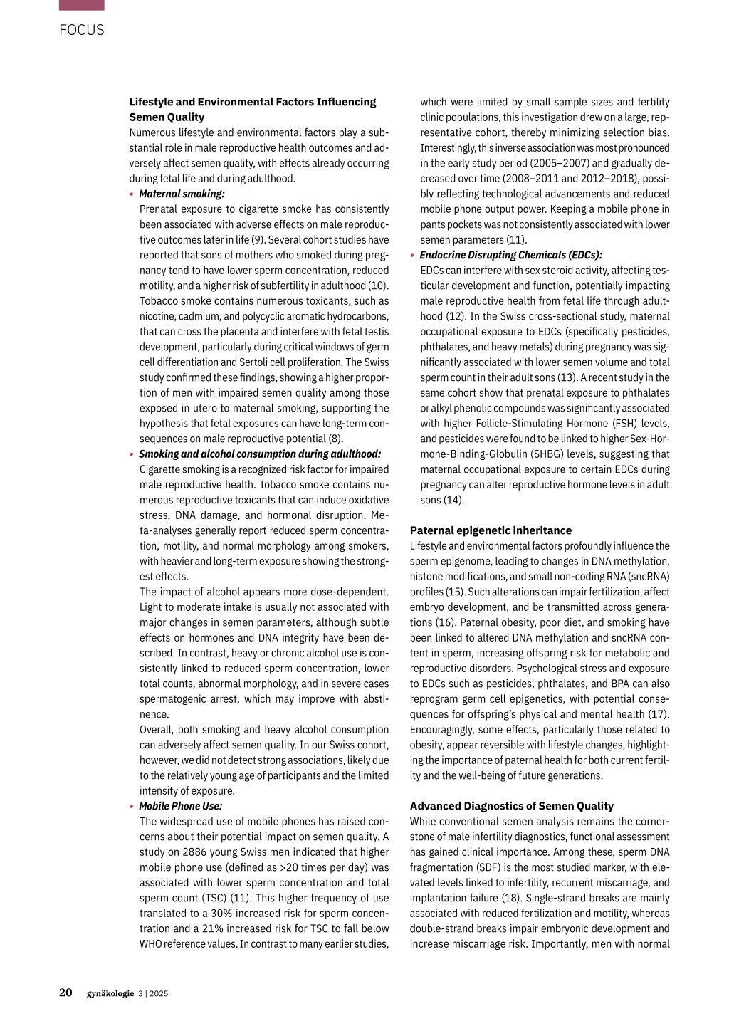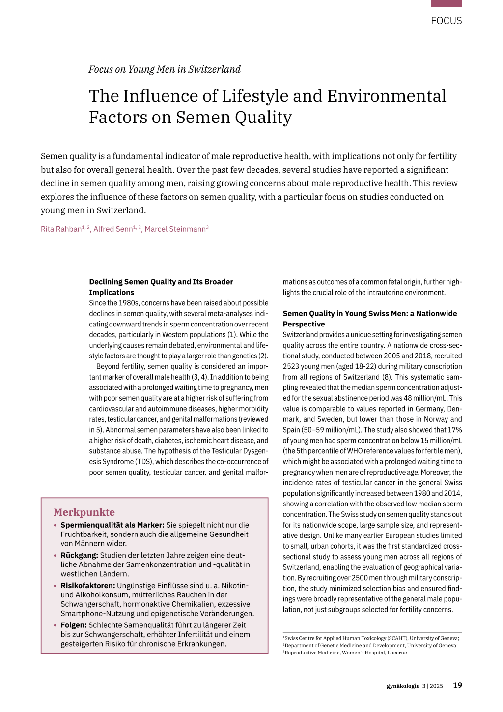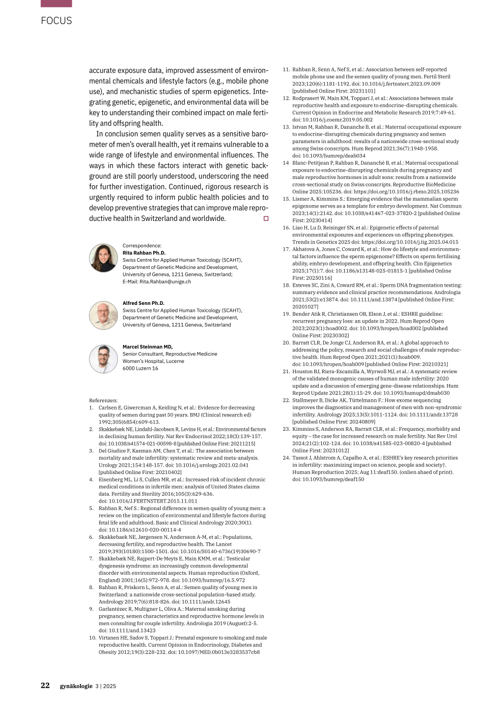 From Semen Parameters to Functional Assessment and Genetic Screening Beyond functional testing, male infertility diagnostics increasingly incorporate hormonal evaluation and standardized andrological examination, particularly in cases of abnormal semen results or suspected hypogonadism (20). Genetic testing is also gaining ground: more than 2000 genes are involved in spermatogenesis, with over 1000 pathogenic variants linked to male subfertility (21). Current guidelines recommend genetic screening (karyotyping, Ychromosome microdeletions, CFTR testing) mainly in men with severe oligozoospermia (<5 million/ml), but expanding evidence suggests that broader use will become standard. The International Male Infertility Genomics Consortium already advocates next-generation sequencing (NGS) as a future diagnostic tool in male infertility, underscoring the shift toward a more comprehensive and personalized evaluation of male reproductive health (22). Public Health Implications and the Need for Preventive Action Male infertility presents significant public health implications, extending beyond the challenge of conception to serve as a biomarker for systemic illness, including an increased risk of chronic diseases such as cancer, cardiometabolic di sease, and early mortality (23). The largely unexplained etiology of most male infertility cases highlights a critical knowledge gap, which can lead to missed opportunities for preventing co-morbidities and shifts the burden of medically assisted reproduction (MAR) to women. To address these issues, preventive actions must focus on increasing education and awareness among the public, governments, and clinicians about the frequency and consequences of male infertility (24). It is essential to promote better preconception and reproductive care, encompassing lifestyle modifications like smoking cessation, weight management, and reduced alcohol intake, as these can improve sperm parameters and potentially enhance offspring health. Further research into modifiable risk factors, alongside the development of targeted interventions and less invasive fertility restoration strategies, is also critical for improving male reproductive health and overall well-being across generations. Challenges and Future Directions Investigating the influence of environmental factors on semen quality is challenging due to the complex interplay of Figure: Lifestyle and environmental factors affecting semen quality from fetal life to adulthood, a focus on young Swiss men The nationwide cross-sectional study evaluated semen quality in about 3,000 men, a cohort broadly representative of the Swiss population. Participants were recruited during mandatory military conscription between 2005 and 2018. Each man completed detailed questionnaires on demographics, education, and lifestyle, while mothers provided information on exposures around the time of conception. Association studies revealed that maternal occupational exposure to endocrine-disrupting chemicals (EDCs, e.g., phthalates, pesticides) and maternal smoking during pregnancy were linked to reduced semen quality in sons. In adulthood, mobile phone use (radiofrequency electromagnetic fields), along with other lifestyle factors such as smoking and alcohol consumption, also influences semen quality. Further prospective research is needed to clarify how semen quality is shaped across the life course, underscoring the importance of preventive strategies from early life through adulthood. (Illustration of pregnant women and men were provided by Smart Servier). various exposures, genetic susceptibility, and the timing of exposure (fetal vs. adult life). The field of male fertility has also been underfunded, with advancements in MAR sometimes overshadowing research into underlying etiologies (20). Future priorities include prospective cohort studies with gynäkologie 3 | 2025 21 FOCUS accurate exposure data, improved assessment of environmental chemicals and lifestyle factors (e.g., mobile phone use), and mechanistic studies of sperm epigenetics. Integrating genetic, epigenetic, and environmental data will be key to understanding their combined impact on male ferti lity and offspring health. In conclusion semen quality serves as a sensitive baro meter of men’s overall health, yet it remains vulnerable to a wide range of lifestyle and environmental influences. The ways in which these factors interact with genetic background are still poorly understood, underscoring the need for further investigation. Continued, rigorous research is urgently required to inform public health policies and to develop preventive strategies that can improve male reproductive health in Switzerland and worldwide. Correspondence: Rita Rahban Ph.D. Swiss Centre for Applied Human Toxicology (SCAHT), Department of Genetic Medicine and Development, University of Geneva, 1211 Geneva, Switzerland; E-Mail: Rita.Rahban@unige.ch Alfred Senn Ph.D. Swiss Centre for Applied Human Toxicology (SCAHT), Department of Genetic Medicine and Development, University of Geneva, 1211 Geneva, Switzerland Marcel Steinman MD, Senior Consultant, Reproductive Medicine Women’s Hospital, Lucerne 6000 Luzern 16 Referenzen: 1. Carlsen E, Giwercman A, Keiding N, et al.: Evidence for decreasing quality of semen during past 50 years. BMJ (Clinical research ed) 1992;305(6854):609-613. 2. Skakkebæk NE, Lindahl-Jacobsen R, Levine H, et al.: Environmental factors in declining human fertility. Nat Rev Endocrinol 2022;18(3):139-157. doi: 10.1038/s41574-021-00598-8 [published Online First: 20211215] 3. Del Giudice F, Kasman AM, Chen T, et al.: The association between mortality and male infertility: systematic review and meta-analysis. Urology 2021;154:148-157. doi: 10.1016/j.urology.2021.02.041 [published Online First: 20210402] 4. Eisenberg ML, Li S, Cullen MR, et al.: Increased risk of incident chronic medical conditions in infertile men: analysis of United States claims data. Fertility and Sterility