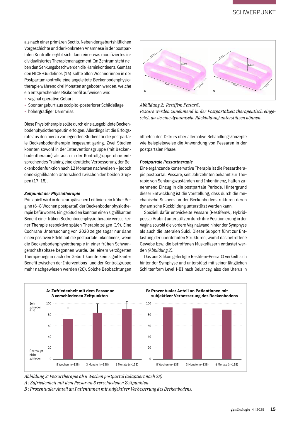 is life-altering and preventable: what can we do about it? Am J Obstet Gynecol 2024 Mar;230(3):279-294.e2. 2. Guri Rortveit G, Daltveit AK et al.: Urinary Incontinence after Vaginal Delivery or Caesarean Section. N Engl J Med 2003;348:900-907. 3. Jansson MH, Franzén K et al.: Stress and urgency urinary incontinence one year after a firstbirth—prevalence and risk factors. A prospective cohort study. Acta Obstet Gynecol Scand. 2021;100:2193–2201. 4. Smith LA, Price N, Simonite V, Burns EE.: Incidence of and risk factors for perineal trauma: a prospective observational study. BMC Pregnancy Childbirth. 2013;13:59. 5. Okeahialam N, Sultan AH et al.: The prevention of perineal trauma during vaginal birth Am J Obstet Gynecol 2024; 230(3), Supplement S991-S1004. 6. Sideris M, McCaughey T et al.: Risk of obstetric anal sphincter injuries (OASIS) and anal incontinence: A meta-analysis. European J Obstetrics & Gynecology and Reproductive Biology 2020; 252: 303-312. 7. Woon Wong K, Okeahialam N et al.: Obstetric risk factors for levator ani muscle avulsion: A systematic review and meta-analysis. Eur J Obstet Gynecol Repr Biology. 219 ;296:99-106. 8. Dietz HP, Walsh C et al.: Levator avulsion and vaginal parity: do subsequent vaginal births matter? Int Urogynecol 2020; J 31: 2311-2315. 9. Shek KL et al.: How much does the levator hiatus have to stretch during childbirth? BJOG 2009; 116(12):1657-1662. 10. Dietz HP, Franco AV et al.: Avulsion injury and levator hiatal ballooning: two indenpendent risk factors for prolapse? An observational study. Acta Obstet Gynecol Scand 2012; 91: 211–214. 11. Model AN, Shek KL et al.: Levator defects are associated with prolapse after pelvic floor surgery. European Journal of Obstetrics and Gynecology and Reproductive Biology, 2010; 153, (2) : 220-223. 12. Cheng W, English E et al.: Hiatal Failure: effects of pregnancy, delivery, and pelvic floor disorders on level III factors. Int Urogynecol J. 2023;34(2): 327-343. 13. WHO Postnatal Care for Mothers and Newborns. April 2015. 14. Hilde G, Stær Jensen J et al.: Postpartum pelvic floor muscle training, levator ani avulsion and levator hiatus area: a randomized trial International Urogynecology J. 2023; 34:413-423. 15. SGGG Expertenbrief No. 75 Der Beckenboden während Schwangerschaft, Geburt und postpartal. 19.4.2021. www.sggg.ch 16. Pelvic floor dysfunction: prevention and non-surgical management. NICE guideline Reference number:NG210 Published: 09 December 2021. 17. Schutze S, Heinloth M et al.: The effect of pelvic floor muscle training on pelvic floor function and sexuality postpartum. A randomized study including 300 primiparous. Arch Gynecol Obstet 2022; 306(3):785–793. 18. Ahlund S, Nordgren B et al.: Is home-based pelvic floor muscle training effective in treatment of urinary incontinence after birth in primiparous women? A randomized controlled trial. Acta Obstet Gynecol Scand 2013; 92(8):909–915. 19. 19. Boyole, J et al: The impact of early pelvic floor muscle training on postpartum pelvic floor dysfunction: A randomized controlled trial. Cochrane Database Syst Rev. 2012 Oct 17:10:CD007471 20. Woodley SJ, Lawrenson P et al. : Pelvic floor muscle training for preventing and treating urinary and faecal incontinence in antenatal and postnatal women. Cochrane Database of Systematic Reviews 2020, Issue 5. Art. No.: CD007471. 21. Baessler K, Heihoff-Klose A et al.: Does an early postpartum pessary treatment lead to remission of pelvic organ prolapse after vaginal birth? A pilot study. Int Urogynecol J 2019; 30(1):S349–S350. 22. Lange R, Tabibi E et al.: Beckenboden-REhabilitations-STudie BREST. Kongress der Deutschen Kontinenz Gesellschaft sine loco [digital], 05.-06.-11.2021. German Medical Science GMS Publishing House, Düsseldorf, p Doc65. 23. Kiefner B, Schwab F et al.: Evaluating compliance and applicability of postpartum pessary use for preventing and treating pelvic floor dysfunction: a prospective multicenter study. Arch Gynecol Obstet 2023 Aug;308(2):651-659.