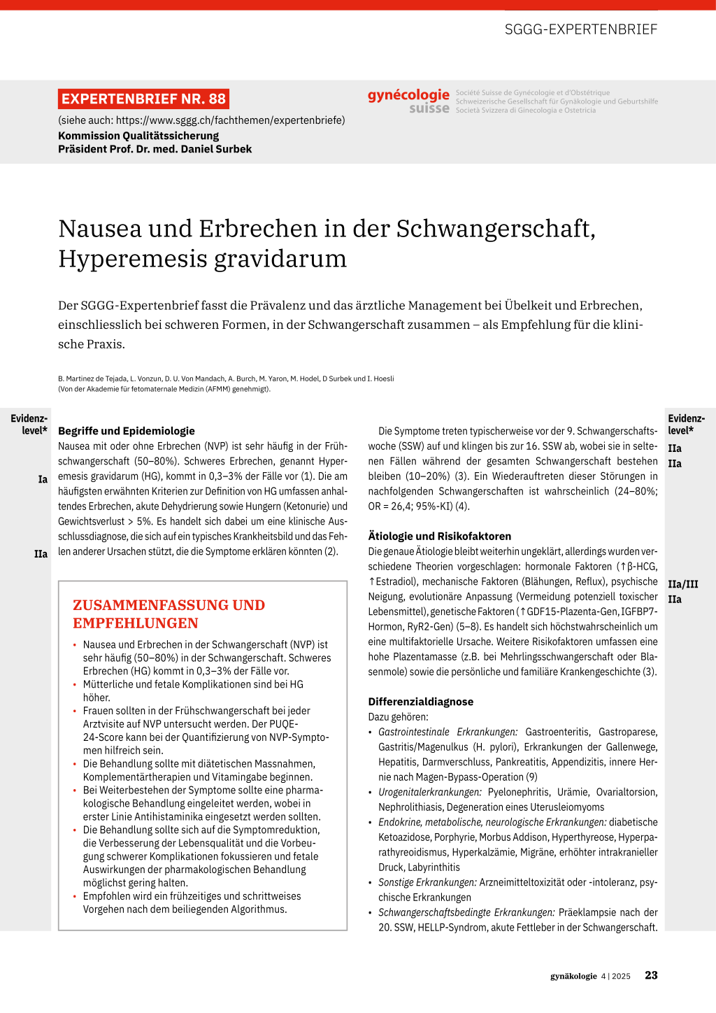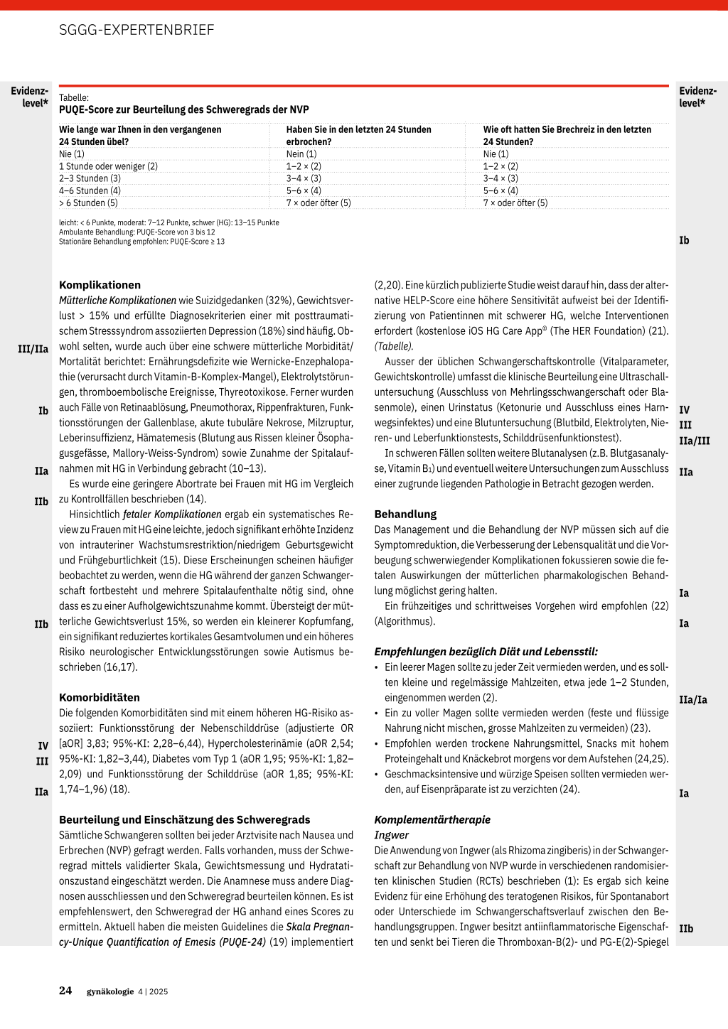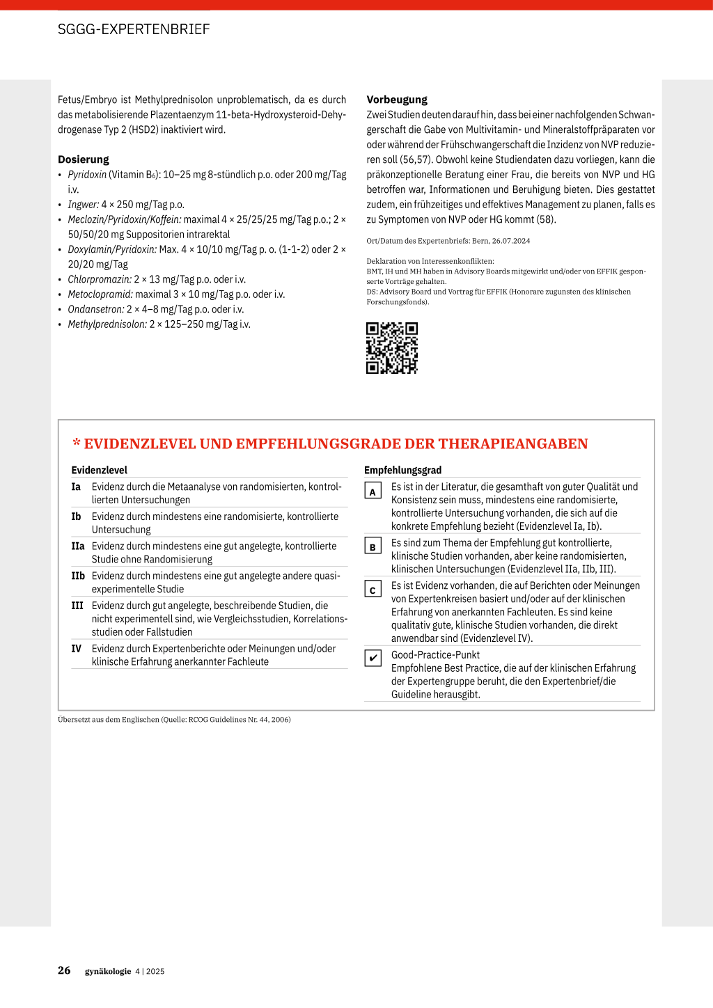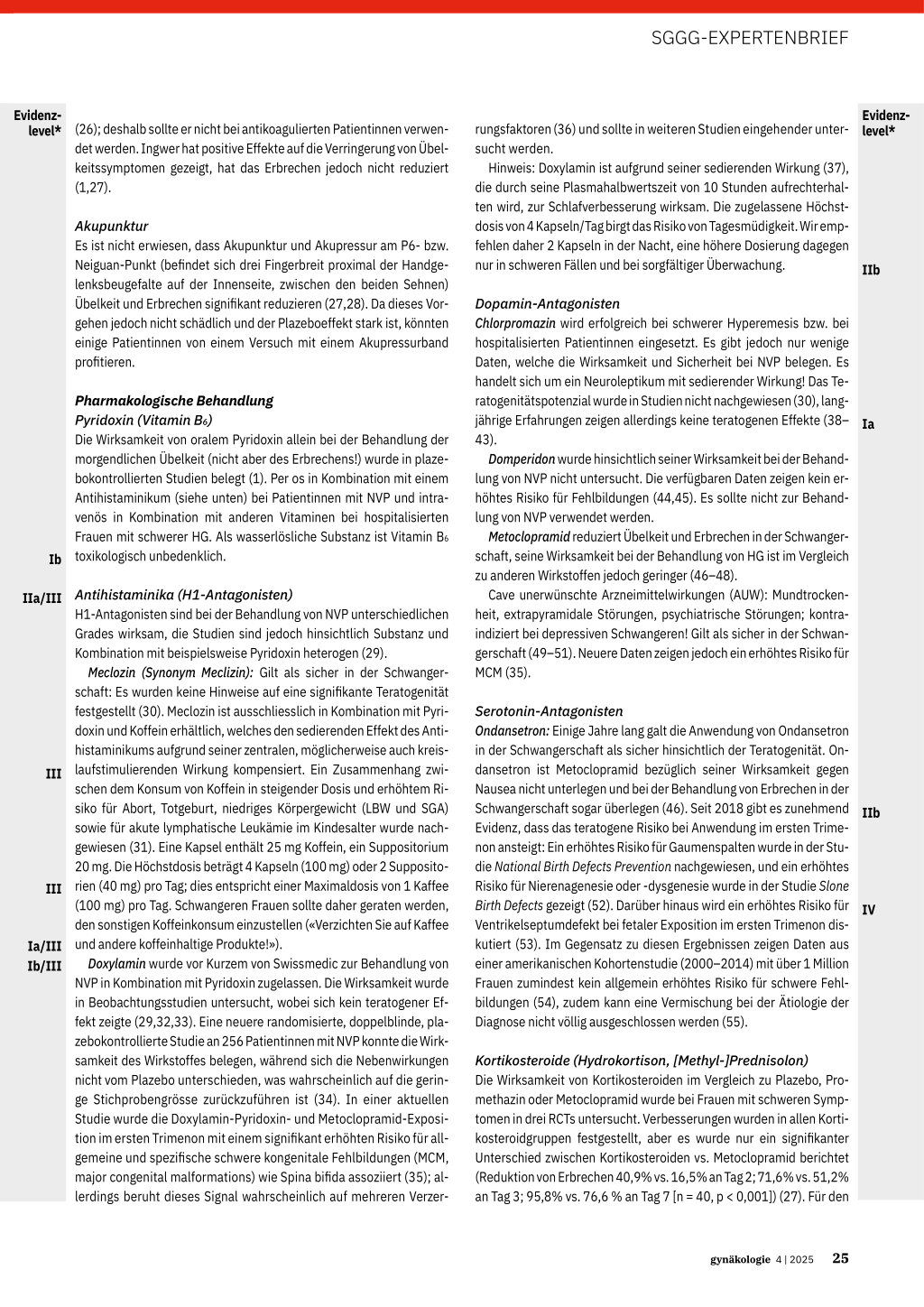 Kortikosteroide (Hydrokortison, [Methyl-]Prednisolon) Die Wirksamkeit von Kortikosteroiden im Vergleich zu Plazebo, Promethazin oder Metoclopramid wurde bei Frauen mit schweren Symptomen in drei RCTs untersucht. Verbesserungen wurden in allen Kortikosteroidgruppen festgestellt, aber es wurde nur ein signifikanter Unterschied zwischen Kortikosteroiden vs. Metoclopramid berichtet (Reduktion von Erbrechen 40,9% vs. 16,5% an Tag 2; 71,6% vs. 51,2% an Tag 3; 95,8% vs. 76,6 % an Tag 7 [n = 40, p < 0,001]) (27). Für den gynäkologie 4 | 2025 25 SGGG-EXPERTENBRIEF Fetus/Embryo ist Methylprednisolon unproblematisch, da es durch das metabolisierende Plazentaenzym 11-beta-Hydroxysteroid-Dehydrogenase Typ 2 (HSD2) inaktiviert wird. Dosierung • Pyridoxin (Vitamin B6): 10–25 mg 8-stündlich p.o. oder 200 mg/Tag i.v. • Ingwer: 4 × 250 mg/Tag p.o. • Meclozin/Pyridoxin/Koffein: maximal 4 × 25/25/25 mg/Tag p.o.; 2 × 50/50/20 mg Suppositorien intrarektal • Doxylamin/Pyridoxin: Max. 4 × 10/10 mg/Tag p. o. (1-1-2) oder 2 × 20/20 mg/Tag • Chlorpromazin: 2 × 13 mg/Tag p.o. oder i.v. • Metoclopramid: maximal 3 × 10 mg/Tag p.o. oder i.v. • Ondansetron: 2 × 4–8 mg/Tag p.o. oder i.v. • Methylprednisolon: 2 × 125–250 mg/Tag i.v. Vorbeugung Zwei Studien deuten darauf hin, dass bei einer nachfolgenden Schwangerschaft die Gabe von Multivitamin- und Mineralstoffpräparaten vor oder während der Frühschwangerschaft die Inzidenz von NVP reduzieren soll (56,57). Obwohl keine Studiendaten dazu vorliegen, kann die präkonzeptionelle Beratung einer Frau, die bereits von NVP und HG betroffen war, Informationen und Beruhigung bieten. Dies gestattet zudem, ein frühzeitiges und effektives Management zu planen, falls es zu Symptomen von NVP oder HG kommt (58). Ort/Datum des Expertenbriefs: Bern, 26.07.2024 Deklaration von Interessenkonflikten: BMT, IH und MH haben in Advisory Boards mitgewirkt und/oder von EFFIK gesponserte Vorträge gehalten. DS: Advisory Board und Vortrag für EFFIK (Honorare zugunsten des klinischen Forschungsfonds). * EVIDENZLEVEL UND EMPFEHLUNGSGRADE DER THERAPIEANGABEN Evidenzlevel Ia Evidenz durch die Metaanalyse von randomisierten, kontrollierten Untersuchungen Ib Evidenz durch mindestens eine randomisierte, kontrollierte Untersuchung IIa Evidenz durch mindestens eine gut angelegte, kontrollierte Studie ohne Randomisierung IIb Evidenz durch mindestens eine gut angelegte andere quasiexperimentelle Studie III Evidenz durch gut angelegte, beschreibende Studien, die nicht experimentell sind, wie Vergleichsstudien, Korrelationsstudien oder Fallstudien IV Evidenz durch Expertenberichte oder Meinungen und/oder klinische Erfahrung anerkannter Fachleute Empfehlungsgrad A Es ist in der Literatur, die gesamthaft von guter Qualität und Konsistenz sein muss, mindestens eine randomisierte, kontrollierte Untersuchung vorhanden, die sich auf die konkrete Empfehlung bezieht (Evidenzlevel Ia, Ib). B Es sind zum Thema der Empfehlung gut kontrollierte, klinische Studien vorhanden, aber keine randomisierten, klinischen Untersuchungen (Evidenzlevel IIa, IIb, III). C Es ist Evidenz vorhanden, die auf Berichten oder Meinungen von Expertenkreisen basiert und/oder auf der klinischen Erfahrung von anerkannten Fachleuten. Es sind keine qualitativ gute, klinische Studien vorhanden, die direkt anwendbar sind (Evidenzlevel IV). ✔ Good-Practice-Punkt Empfohlene Best Practice, die auf der klinischen Erfahrung der Expertengruppe beruht, die den Expertenbrief/die Guideline herausgibt. Übersetzt aus dem Englischen (Quelle: RCOG Guidelines Nr. 44, 2006) 26 gynäkologie 4 | 2025