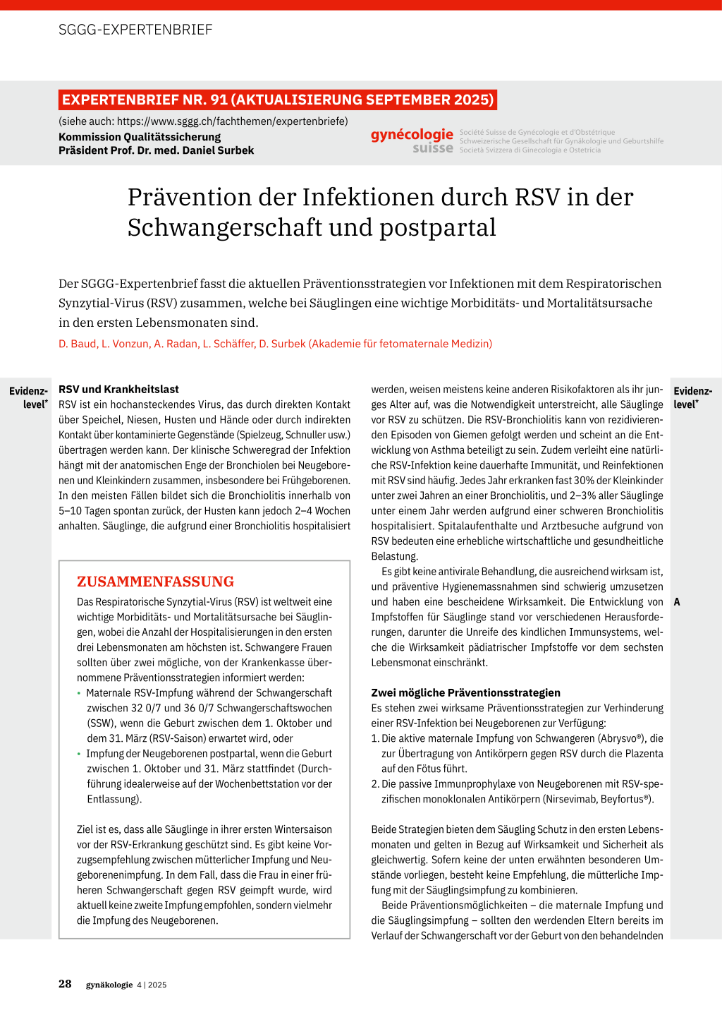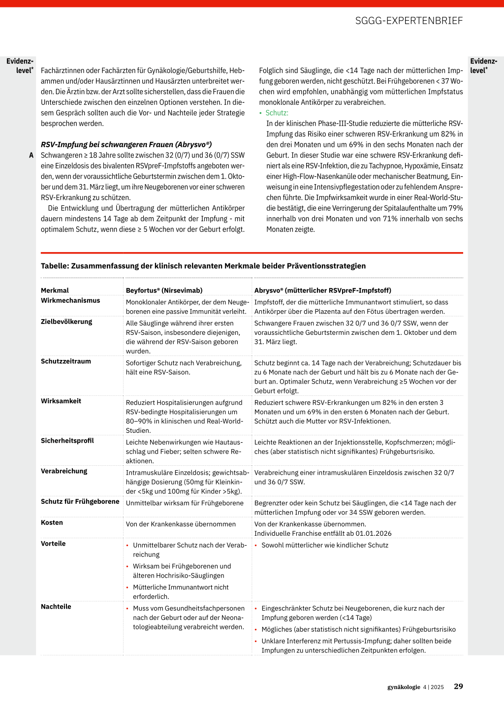 Unmittelbar wirksam für Frühgeborene Begrenzter oder kein Schutz bei Säuglingen, die <14 Tage nach der mütterlichen Impfung oder vor 34 SSW geboren werden. Von der Krankenkasse übernommen Von der Krankenkasse übernommen. Individuelle Franchise entfällt ab 01.01.2026 • Unmittelbarer Schutz nach der Verab- • Sowohl mütterlicher wie kindlicher Schutz reichung • Wirksam bei Frühgeborenen und älteren Hochrisiko-Säuglingen Nachteile • Mütterliche Immunantwort nicht erforderlich. • Muss vom Gesundheitsfachpersonen nach der Geburt oder auf der Neonatologieabteilung verabreicht werden. • Eingeschränkter Schutz bei Neugeborenen, die kurz nach der Impfung geboren werden (<14 Tage) • Mögliches (aber statistisch nicht signifikantes) Frühgeburtsrisiko • Unklare Interferenz mit Pertussis-Impfung; daher sollten beide Impfungen zu unterschiedlichen Zeitpunkten erfolgen. gynäkologie 4 | 2025 29 SGGG-EXPERTENBRIEF Evidenzlevel* A • Nebenwirkungen: Die am häufigsten berichteten Nebenwirkungen waren Schmerzen an der Injektionsstelle, Kopfschmerzen, Muskelschmerzen und Übelkeit. Die Teilnehmerinnen der klinischen Studie, welche die mütterliche RSV-Impfung erhielten, wurden zwischen 24 und 36 SSW geimpft. Aus einem noch ungeklärten Grund und ähnlich wie in anderen Studien auf diesem Gebiet wurden bei den Teilnehmerinnen, welche die mütterliche RSV-Impfung erhielten, mehr Frühgeburten beobachtet (5,7%) als bei denen, die ein Plazebo erhielten (4,2%). Dieser Unterschied war jedoch statistisch nicht signifikant. Um dieses potenzielle Frühgeburtsrisiko zu minimieren, sollte der mütterliche RSV-Impfstoff ausschliesslich ab 32 (0/7) SSW verabreicht werden. Zu den Kontraindikationen gehören eine Überempfindlichkeit gegenüber dem Wirkstoff und eine akute Infektion. • Nachfolgende Schwangerschaften: Wiederholte mütterliche Impfungen in nachfolgenden Schwangerschaften werden nicht empfohlen aufgrund des aktuell unzureichenden Wissensstands hinsichtlich der Wirksamkeit und Sicherheit von Auffrischungsdosen von Abrysvo® und der Tatsache, dass langwirksame monoklonale Antikörper als alternative Präventionsmassnahme verfügbar sind. • Kosten: Die Kosten der mütterlichen Immunisierung mit Abrysvo® werden in der Schweiz von der Grundversicherung übernommen. Ab dem 1. Januar 2026 ist sie auch von der Franchise ausgenommen. Neonatale Immunisierung mit monoklonalen Antikörpern (Nirsevimab, Beyfortus®): (siehe auch Konsenserklärung RSV_Nirsevimab) Die passive Immunisierung mit RSV-spezifischen monoklonalen Antikörpern wird für alle Neugeborenen ungeimpfter Frauen empfohlen, die während der RSV-Saison (1. Oktober bis 31. März) geboren werden, innerhalb von 7 Tagen nach der Geburt oder so bald wie möglich danach – idealerweise auf der Wochenbettstation vor der Entlassung. Bei Säuglingen, die ausserhalb dieses Zeitraums (April–September) geboren werden, sollte eine Einzeldosis zu Beginn ihrer ersten RSV-Saison (ab Oktober) verabreicht werden. Zusätzlich benötigen Hochrisiko-Säuglinge (wie solche mit chronischen Erkrankungen) möglicherweise eine zweite Dosis vor ihrer zweiten RSV-Saison, um einen kontinuierlichen Schutz zu gewährleisten. Bei Frühgeborenen <37 Wochen wird empfohlen, unabhängig vom mütterlichen Impfstatus monoklonale Antikörper zu verabreichen. • Schutz: Nirsevimab ist ein hochwirksamer, zur RSV-Neutralisierung entwickelter, monoklonaler Antikörper, der gegen das F-Protein, ein Schlüsselelement für den Viruseintritt in die Zelle, gerichtet ist. Klinische Studien haben gezeigt, dass Nirsevimab die Anzahl der Hospitalisierungen aufgrund von RSV-Infektion um 80–90% senken kann und dank seiner langen Halbwertszeit mit einer Einzeldosis eine ganze Saison lang Schutz bietet. Ähnlich hohe Schutzniveaus ergaben sich aus Real-World-Daten in europäischen Ländern, die bereits während der RSV-Saison 2023/2024 mit der Anwendung von Nirsevimab begonnen haben. Mit einem überzeugenden Sicherheitsprofil und einer nachgewiesenen Wirksamkeit ist Nirsevimab ein wichtiges Instrument zum Schutz vor RSV-bedingten Komplikationen in gefährdeten Bevölkerungsgruppen. • Nebenwirkungen: Nirsevimab ist im Allgemeinen gut verträglich. Leichte Nebenwirkungen wie Hautausschlag, Fieber und Reaktionen an der Injektionsstelle treten in <1% der Fälle auf, während seltene, jedoch schwerwiegende allergische Reaktionen äusserst ungewöhnlich sind. • Kosten: Die Kosten für die Immunisierung von Neugeborenen mit Nirsevimab werden in der Schweiz sowohl im stationären als auch im ambulanten Bereich von der Grundversicherung übernommen. Evidenzlevel* Datum des Expertenbriefs: 5. September 2025 Referenzen bei den Autorinnen und Autoren. Deklaration von Interessenkonflikten: DS: Advisory Board Sanofi (Honorar zugunsten des Forschungsfonds der Abteilung). * Evidenzlevel und Empfehlungsgrade der Therapieangaben Evidenzlevel Ia Evidenz durch die Metaanalyse von randomisierten, kontrollierten Untersuchungen Ib Evidenz durch mindestens eine randomisierte, kontrollierte Untersuchung IIa Evidenz durch mindestens eine gut angelegte, kontrollierte Studie ohne Randomisierung IIb Evidenz durch mindestens eine gut angelegte andere quasi-experimentelle Studie III Evidenz durch gut angelegte, beschreibende Studien, die nicht experimentell sind, wie Vergleichsstudien, Korrelationsstudien oder Fallstudien IV Evidenz durch Expertenberichte oder Meinungen und/oder klinische Erfahrung anerkannter Fachleute Übersetzt aus dem Englischen (Quelle: RCOG Guidelines Nr. 44, 2006) Empfehlungsgrad Es ist in der Literatur, die gesamthaft von guter Qualität und A Konsistenz sein muss, mindestens eine randomisierte, kontrollierte Untersuchung vorhanden, die sich auf die konkrete Empfehlung bezieht (Evidenzlevel Ia, Ib). Es sind zum Thema der Empfehlung gut kontrollierte, klinische B Studien vorhanden, aber keine randomisierten, klinischen Untersuchungen (Evidenzlevel IIa, IIb, III). C Es ist