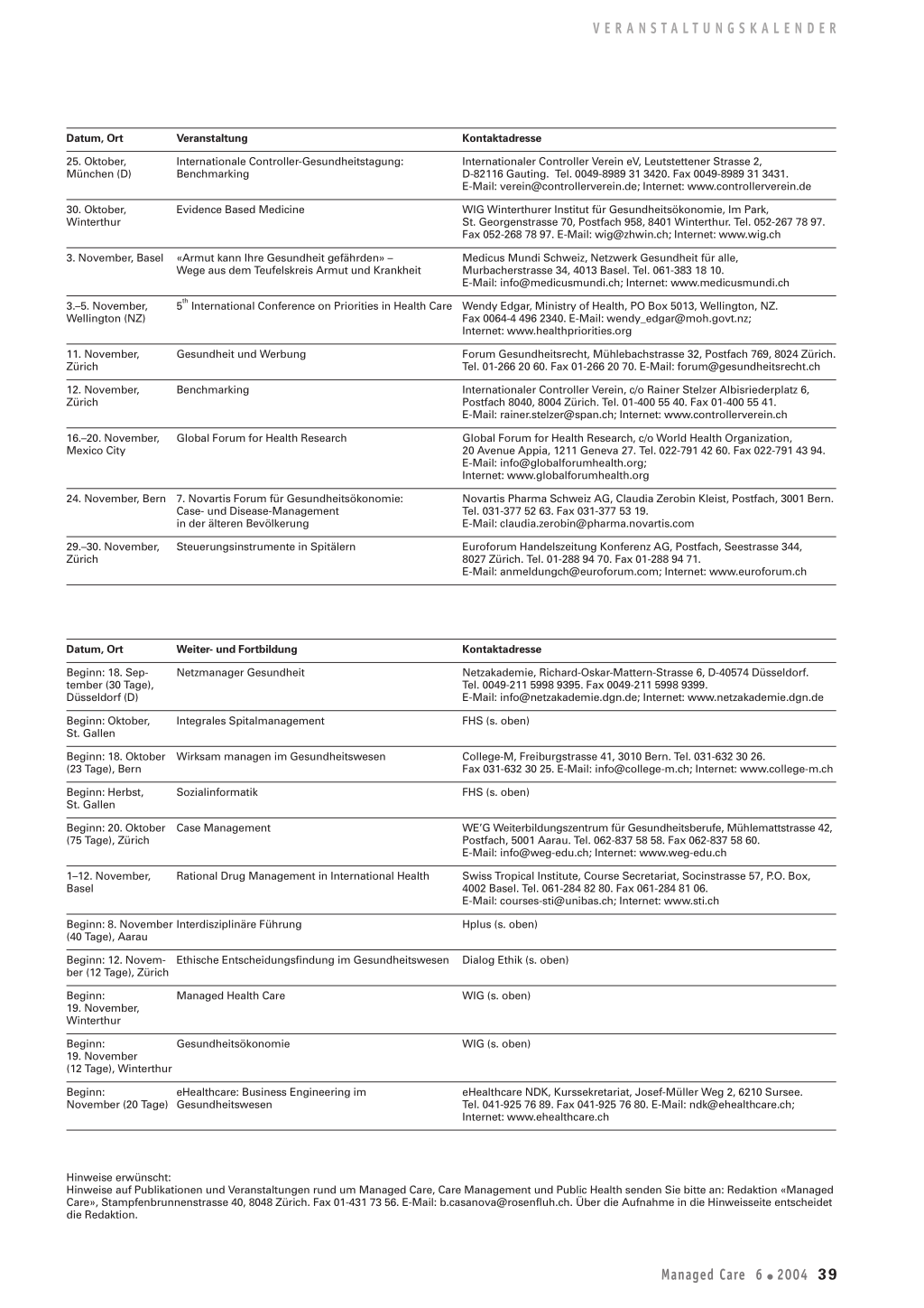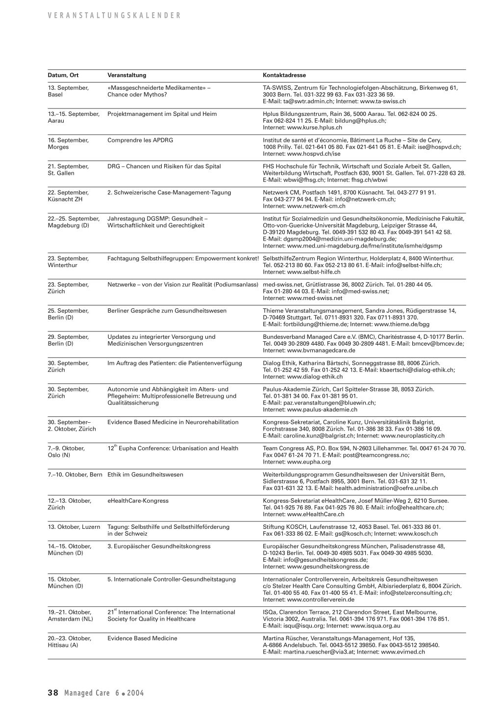 Hinweise erwünscht: Hinweise auf Publikationen und Veranstaltungen rund um Managed Care, Care Management und Public Health senden Sie bitte an: Redaktion «Managed Care», Stampfenbrunnenstrasse 40, 8048 Zürich. Fax 01-431 73 56. E-Mail: b.casanova@rosenfluh.ch. Über die Aufnahme in die Hinweisseite entscheidet die Redaktion.