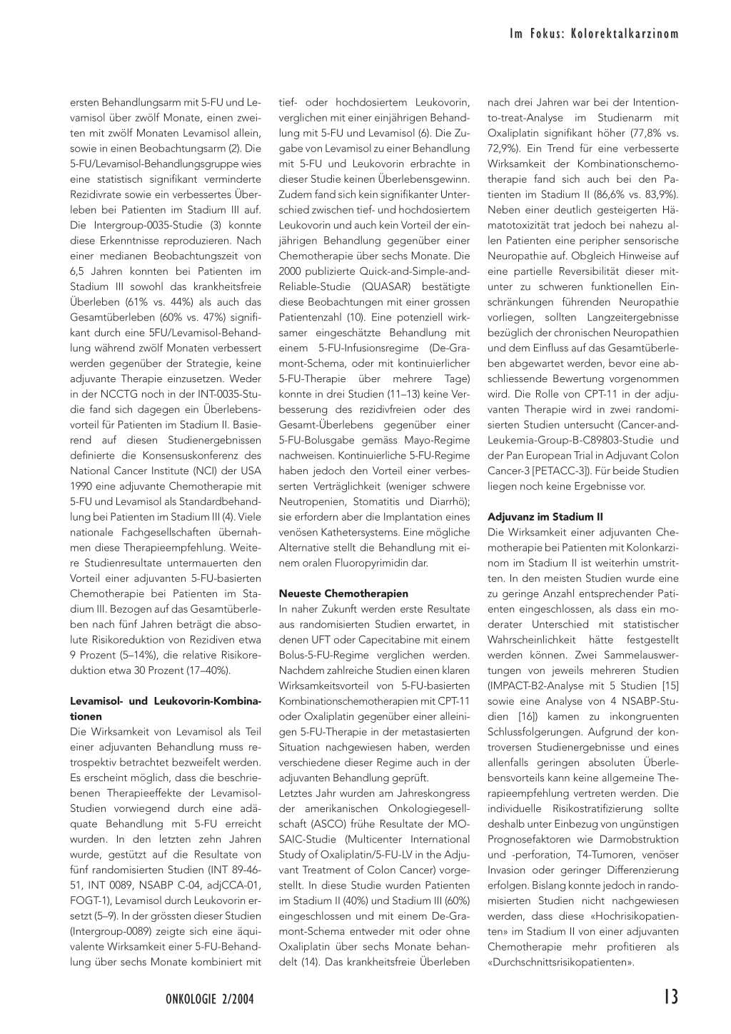 Levamisol- und Leukovorin-Kombinationen Die Wirksamkeit von Levamisol als Teil einer adjuvanten Behandlung muss retrospektiv betrachtet bezweifelt werden. Es erscheint möglich, dass die beschriebenen Therapieeffekte der LevamisolStudien vorwiegend durch eine adäquate Behandlung mit 5-FU erreicht wurden. In den letzten zehn Jahren wurde, gestützt auf die Resultate von fünf randomisierten Studien (INT 89-4651, INT 0089, NSABP C-04, adjCCA-01, FOGT-1), Levamisol durch Leukovorin ersetzt (5–9). In der grössten dieser Studien (Intergroup-0089) zeigte sich eine äquivalente Wirksamkeit einer 5-FU-Behandlung über sechs Monate kombiniert mit
