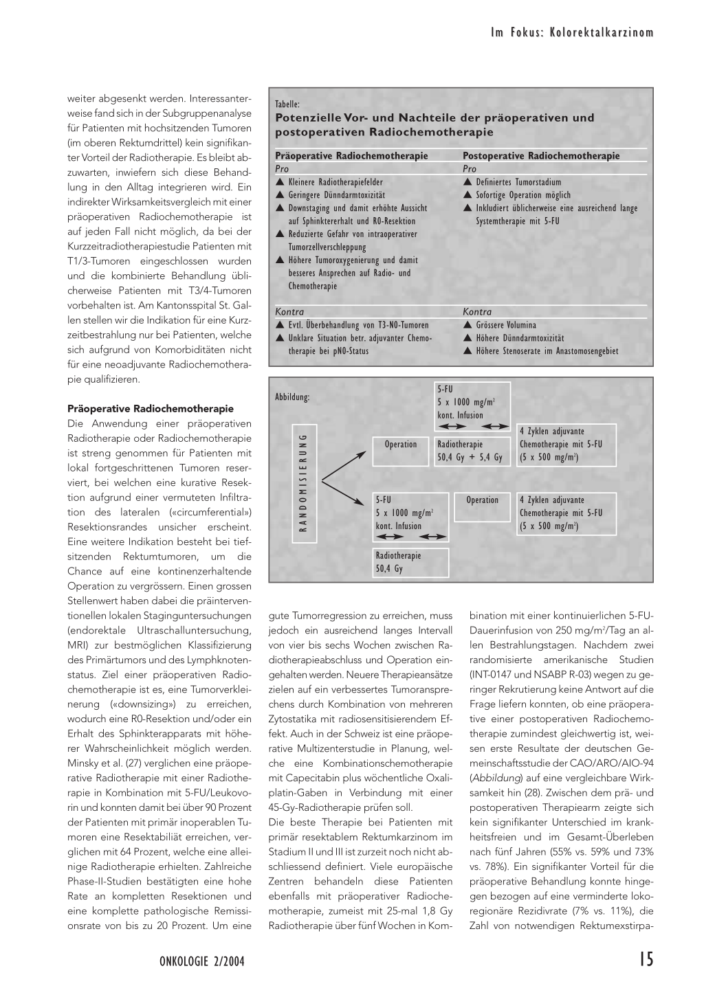 bination mit einer kontinuierlichen 5-FUDauerinfusion von 250 mg/m2/Tag an allen Bestrahlungstagen. Nachdem zwei randomisierte amerikanische Studien (INT-0147 und NSABP R-03) wegen zu geringer Rekrutierung keine Antwort auf die Frage liefern konnten, ob eine präoperative einer postoperativen Radiochemotherapie zumindest gleichwertig ist, weisen erste Resultate der deutschen Gemeinschaftsstudie der CAO/ARO/AIO-94 (Abbildung) auf eine vergleichbare Wirksamkeit hin (28). Zwischen dem prä- und postoperativen Therapiearm zeigte sich kein signifikanter Unterschied im krankheitsfreien und im Gesamt-Überleben nach fünf Jahren (55% vs. 59% und 73% vs. 78%). Ein signifikanter Vorteil für die präoperative Behandlung konnte hingegen bezogen auf eine verminderte lokoregionäre Rezidivrate (7% vs. 11%), die Zahl von notwendigen Rektumexstirpa-