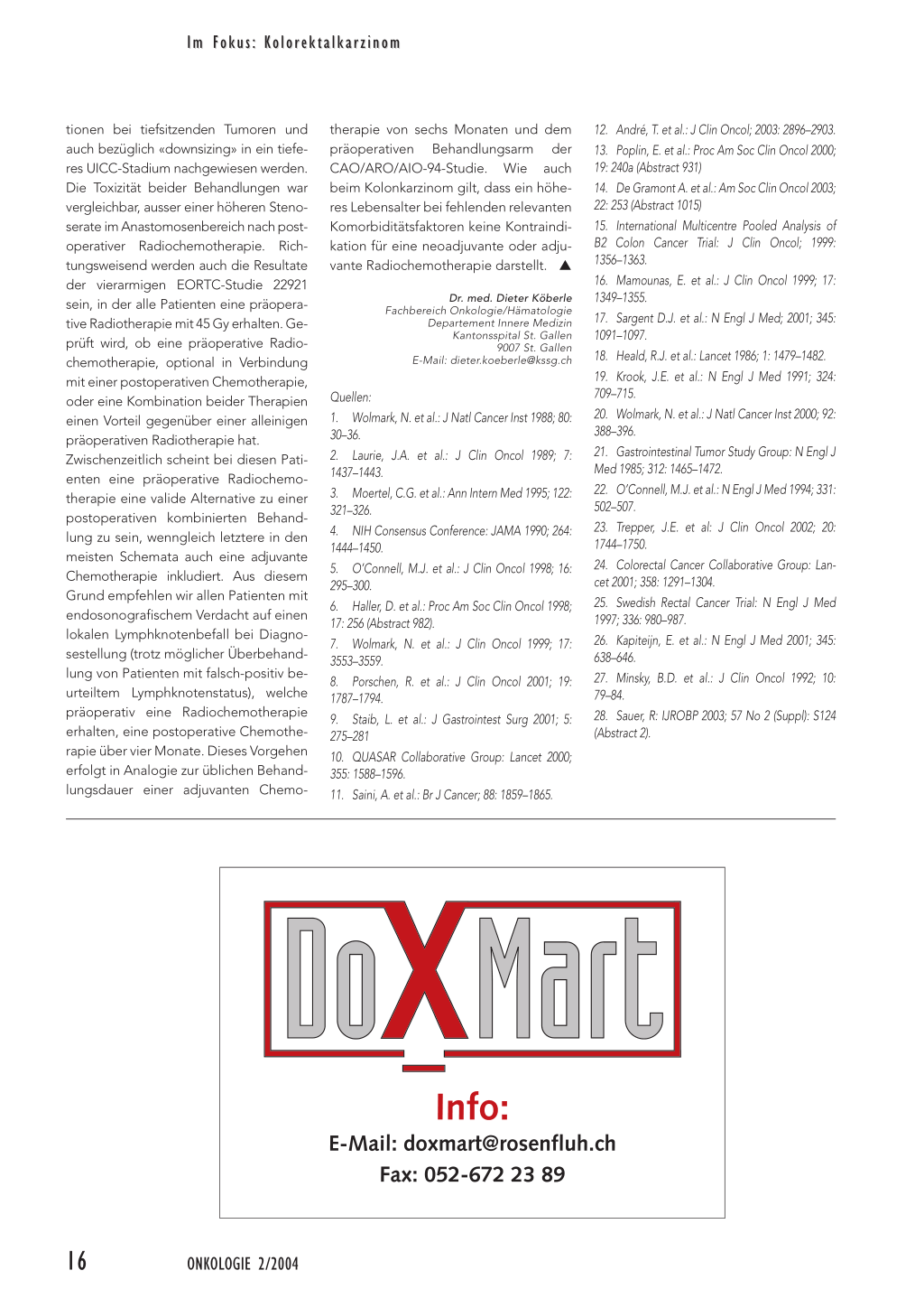 tionen bei tiefsitzenden Tumoren und auch bezüglich «downsizing» in ein tieferes UICC-Stadium nachgewiesen werden. Die Toxizität beider Behandlungen war vergleichbar, ausser einer höheren Stenoserate im Anastomosenbereich nach postoperativer Radiochemotherapie. Richtungsweisend werden auch die Resultate der vierarmigen EORTC-Studie 22921 sein, in der alle Patienten eine präoperative Radiotherapie mit 45 Gy erhalten. Geprüft wird, ob eine präoperative Radiochemotherapie, optional in Verbindung mit einer postoperativen Chemotherapie, oder eine Kombination beider Therapien einen Vorteil gegenüber einer alleinigen präoperativen Radiotherapie hat. Zwischenzeitlich scheint bei diesen Patienten eine präoperative Radiochemotherapie eine valide Alternative zu einer postoperativen kombinierten Behandlung zu sein, wenngleich letztere in den meisten Schemata auch eine adjuvante Chemotherapie inkludiert. Aus diesem Grund empfehlen wir allen Patienten mit endosonografischem Verdacht auf einen lokalen Lymphknotenbefall bei Diagnosestellung (trotz möglicher Überbehandlung von Patienten mit falsch-positiv beurteiltem Lymphknotenstatus), welche präoperativ eine Radiochemotherapie erhalten, eine postoperative Chemotherapie über vier Monate. Dieses Vorgehen erfolgt in Analogie zur üblichen Behandlungsdauer einer adjuvanten Chemo-