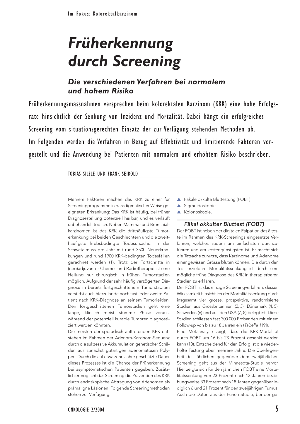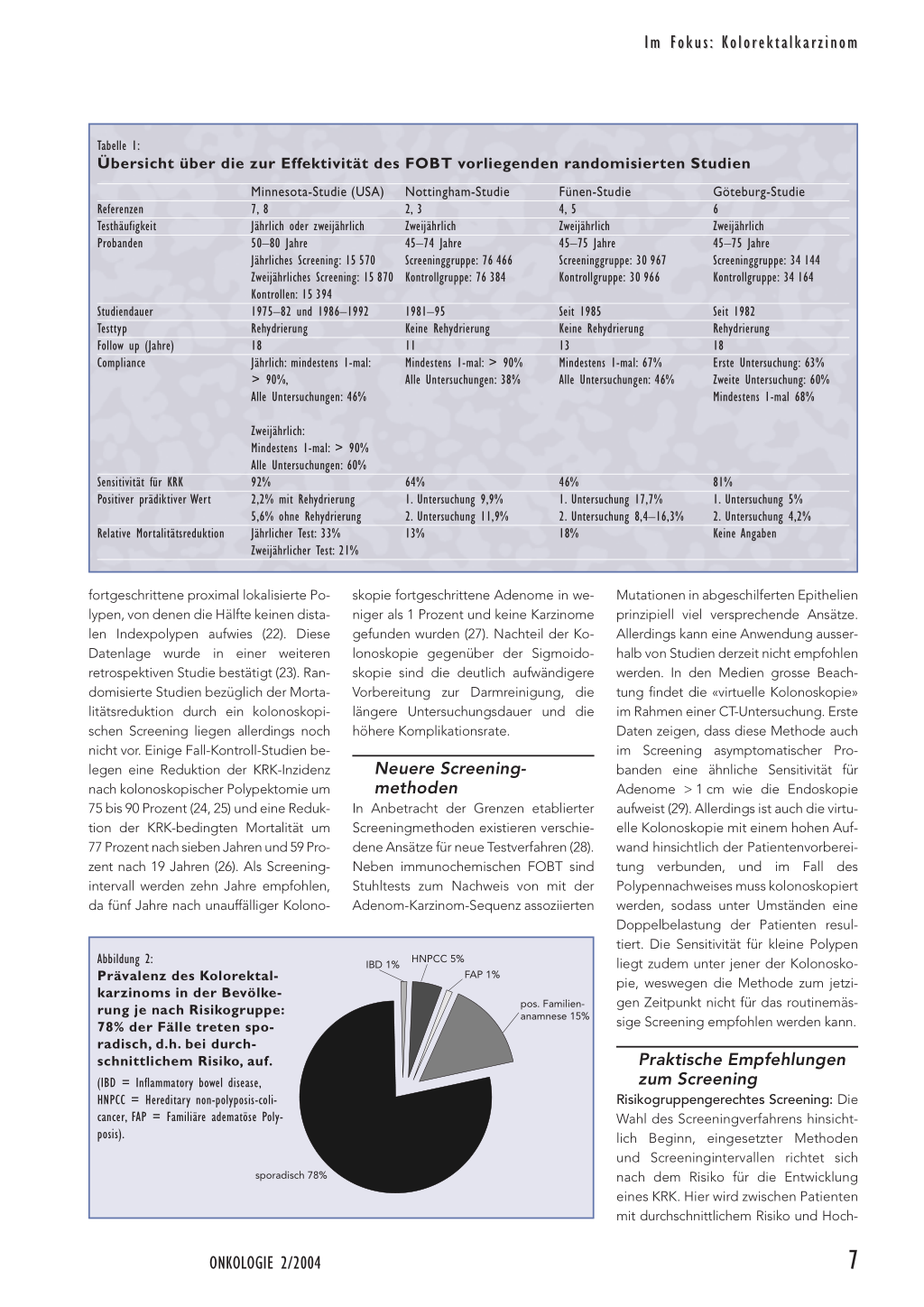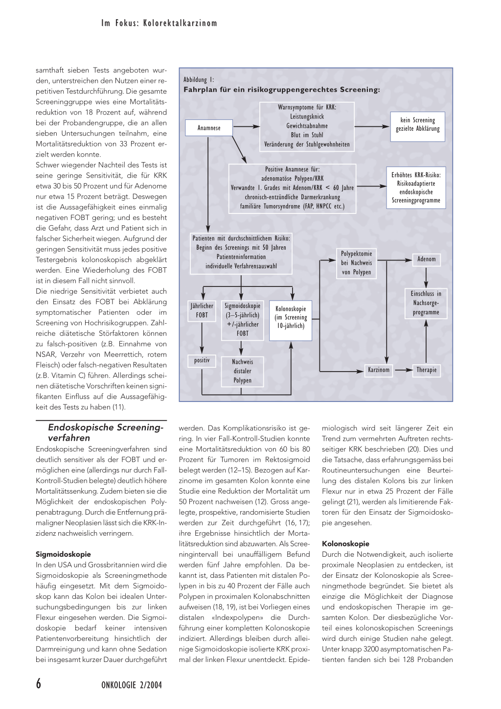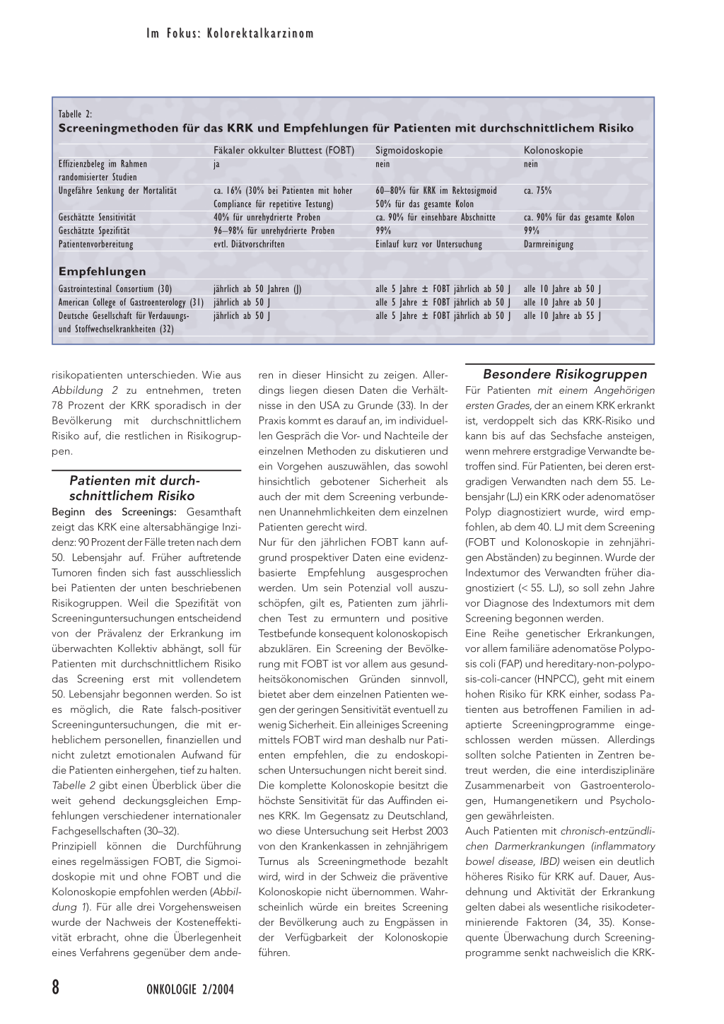 ren in dieser Hinsicht zu zeigen. Allerdings liegen diesen Daten die Verhältnisse in den USA zu Grunde (33). In der Praxis kommt es darauf an, im individuellen Gespräch die Vor- und Nachteile der einzelnen Methoden zu diskutieren und ein Vorgehen auszuwählen, das sowohl hinsichtlich gebotener Sicherheit als auch der mit dem Screening verbundenen Unannehmlichkeiten dem einzelnen Patienten gerecht wird. Nur für den jährlichen FOBT kann aufgrund prospektiver Daten eine evidenzbasierte Empfehlung ausgesprochen werden. Um sein Potenzial voll auszuschöpfen, gilt es, Patienten zum jährlichen Test zu ermuntern und positive Testbefunde konsequent kolonoskopisch abzuklären. Ein Screening der Bevölkerung mit FOBT ist vor allem aus gesundheitsökonomischen Gründen sinnvoll, bietet aber dem einzelnen Patienten wegen der geringen Sensitivität eventuell zu wenig Sicherheit. Ein alleiniges Screening mittels FOBT wird man deshalb nur Patienten empfehlen, die zu endoskopischen Untersuchungen nicht bereit sind. Die komplette Kolonoskopie besitzt die höchste Sensitivität für das Auffinden eines KRK. Im Gegensatz zu Deutschland, wo diese Untersuchung seit Herbst 2003 von den Krankenkassen in zehnjährigem Turnus als Screeningmethode bezahlt wird, wird in der Schweiz die präventive Kolonoskopie nicht übernommen. Wahrscheinlich würde ein breites Screening der Bevölkerung auch zu Engpässen in der Verfügbarkeit der Kolonoskopie führen.