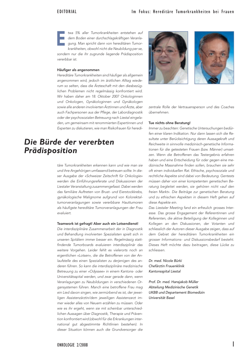 täre Tumorkrankheiten erkennen kann und wie man sie und ihre Angehörigen umfassend betreuen sollte. In dieser Ausgabe der «Schweizer Zeitschrift für Onkologie» werden die Einführungsreferate und Diskussionen der Liestaler Veranstaltung zusammengefasst. Dabei werden das familiäre Auftreten von Brust- und Eierstockkrebs, gynäkologische Malignome aufgrund von Kolorektaltumorveranlagungen sowie vererbbare Hauttumoren als häufigste hereditäre Tumorveranlagungen der Frau evaluiert.