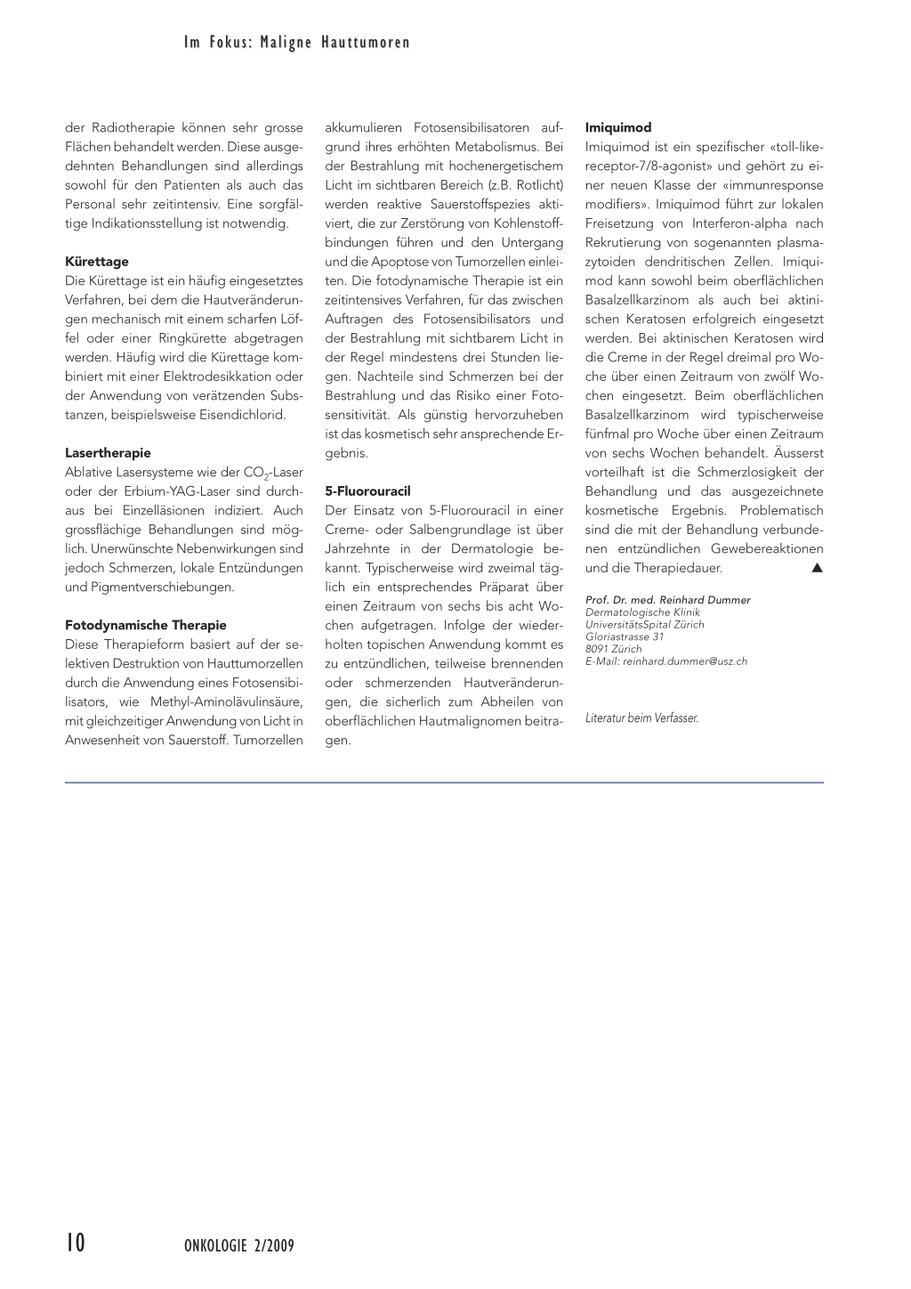 Prof. Dr. med. Reinhard Dummer Dermatologische Klinik UniversitätsSpital Zürich Gloriastrasse 31 8091 Zürich E-Mail: reinhard.dummer@usz.ch