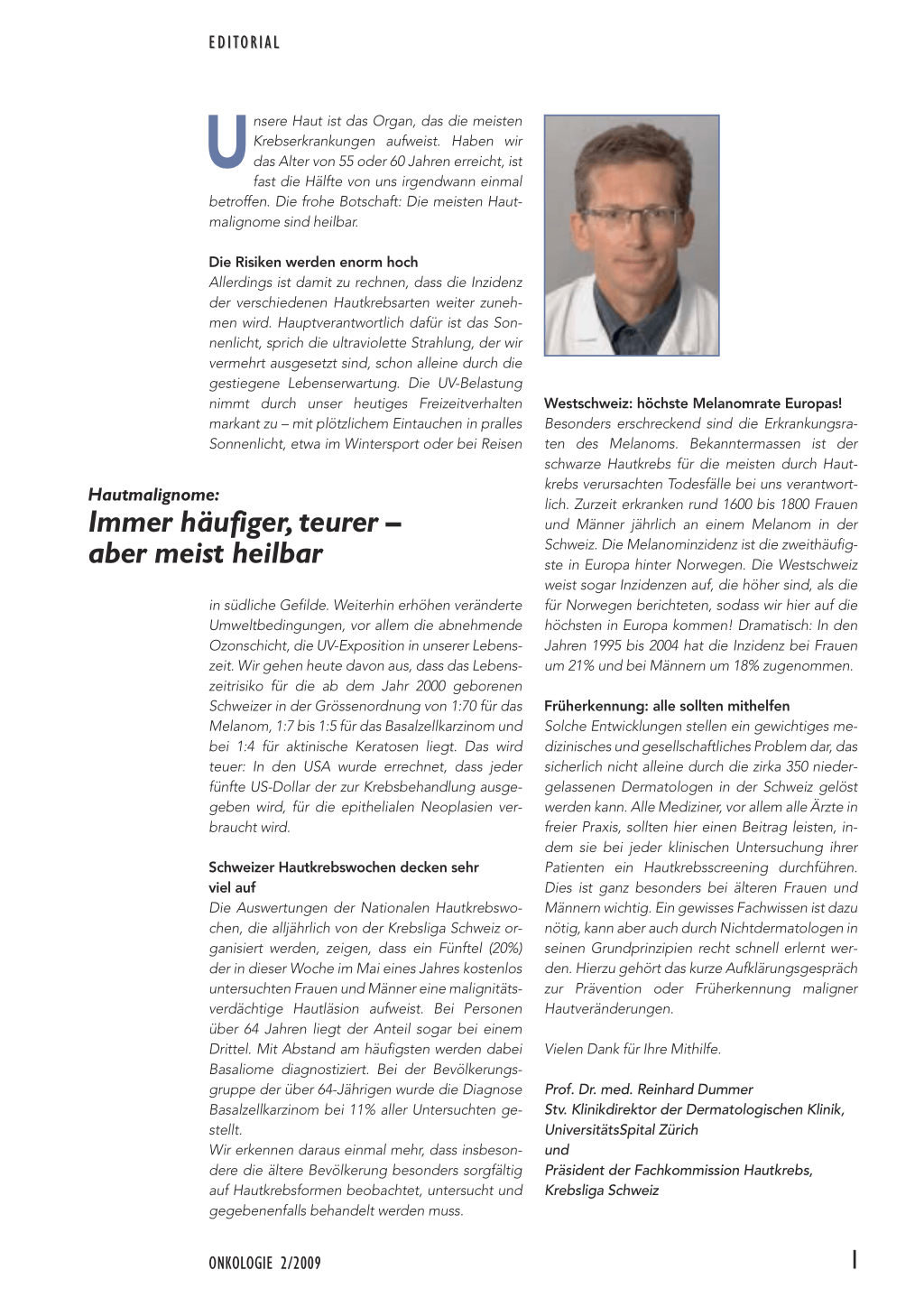 in südliche Gefilde. Weiterhin erhöhen veränderte Umweltbedingungen, vor allem die abnehmende Ozonschicht, die UV-Exposition in unserer Lebenszeit. Wir gehen heute davon aus, dass das Lebenszeitrisiko für die ab dem Jahr 2000 geborenen Schweizer in der Grössenordnung von 1:70 für das Melanom, 1:7 bis 1:5 für das Basalzellkarzinom und bei 1:4 für aktinische Keratosen liegt. Das wird teuer: In den USA wurde errechnet, dass jeder fünfte US-Dollar der zur Krebsbehandlung ausgegeben wird, für die epithelialen Neoplasien verbraucht wird.