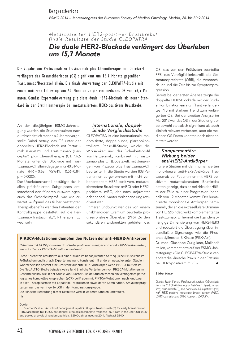 Bärbel Hirrle Quelle: Swain S et al.: Final overall survival (OS) analysis from the CLEOPATRA study of first-line (1L) pertuzumab (Ptz), trastuzumab (T), and docetaxel (D) in patients (pts) with HER2-positive metastatic breast cancer (MBC). ESMO-Jahrestagung 2014; Abstract: 350O_PR.