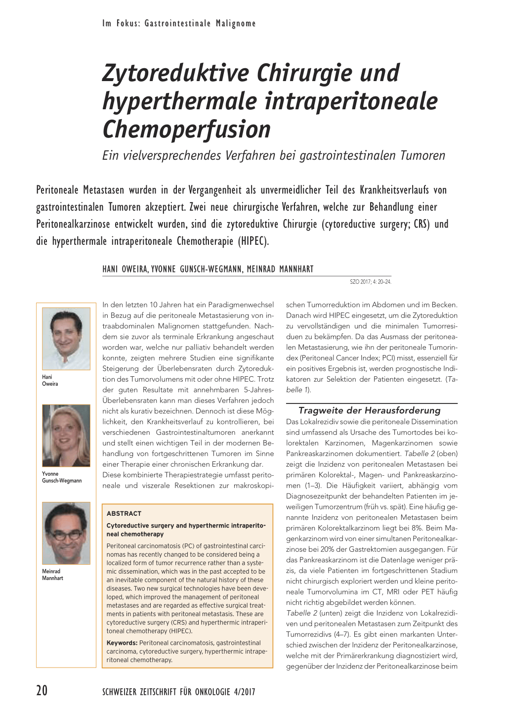 In den letzten 10 Jahren hat ein Paradigmenwechsel in Bezug auf die peritoneale Metastasierung von intraabdominalen Malignomen stattgefunden. Nachdem sie zuvor als terminale Erkrankung angeschaut worden war, welche nur palliativ behandelt werden konnte, zeigten mehrere Studien eine signifikante Steigerung der Überlebensraten durch Zytoreduktion des Tumorvolumens mit oder ohne HIPEC. Trotz der guten Resultate mit annehmbaren 5-JahresÜberlebensraten kann man dieses Verfahren jedoch nicht als kurativ bezeichnen. Dennoch ist diese Möglichkeit, den Krankheitsverlauf zu kontrollieren, bei verschiedenen Gastrointestinaltumoren anerkannt und stellt einen wichtigen Teil in der modernen Behandlung von fortgeschrittenen Tumoren im Sinne einer Therapie einer chronischen Erkrankung dar. Diese kombinierte Therapiestrategie umfasst peritoneale und viszerale Resektionen zur makroskopi-