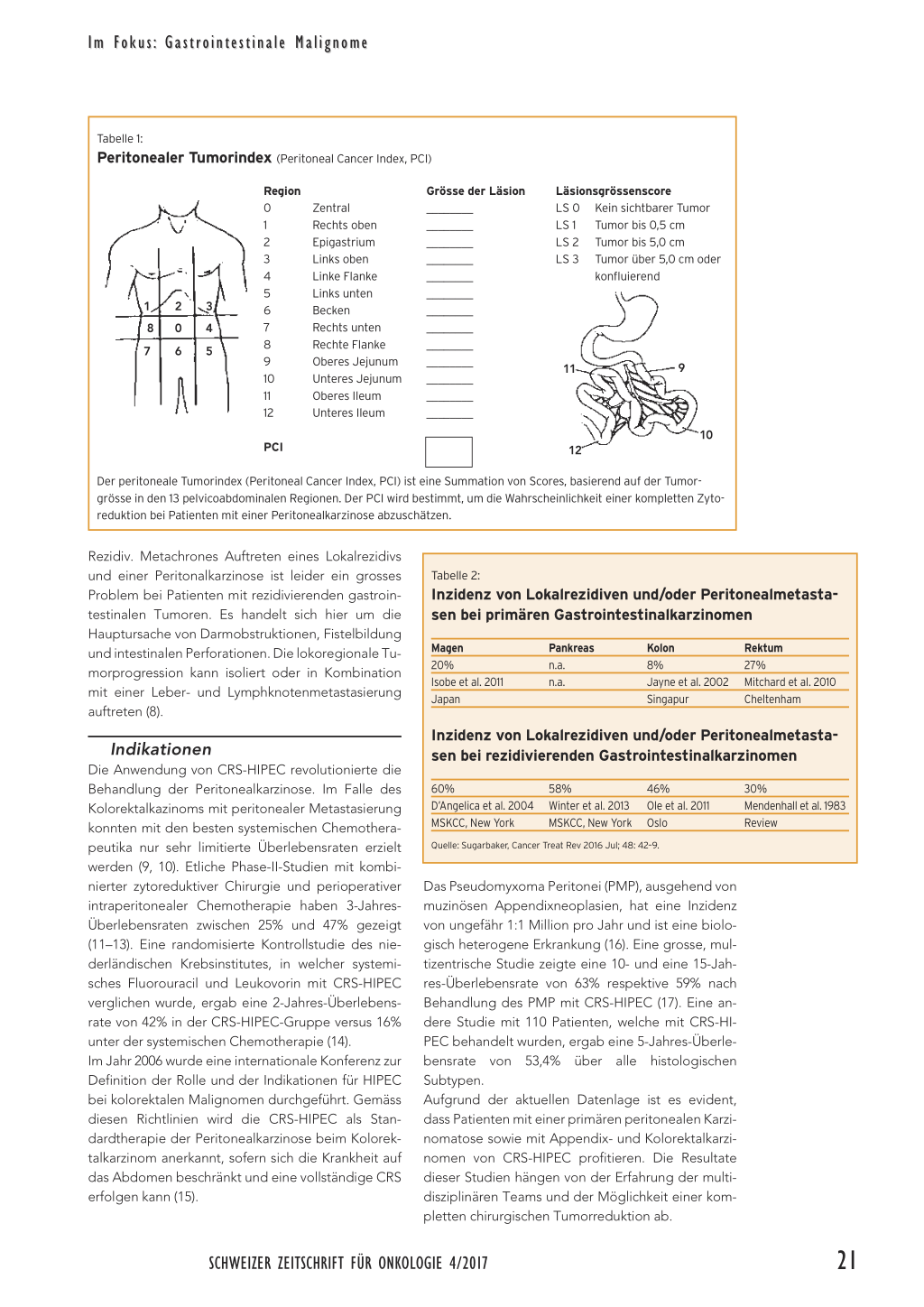 schen Tumorreduktion im Abdomen und im Becken. Danach wird HIPEC eingesetzt, um die Zytoreduktion zu vervollständigen und die minimalen Tumorresiduen zu bekämpfen. Da das Ausmass der peritonealen Metastasierung, wie ihn der peritoneale Tumorindex (Peritoneal Cancer Index; PCI) misst, essenziell für ein positives Ergebnis ist, werden prognostische Indikatoren zur Selektion der Patienten eingesetzt. (Tabelle 1).