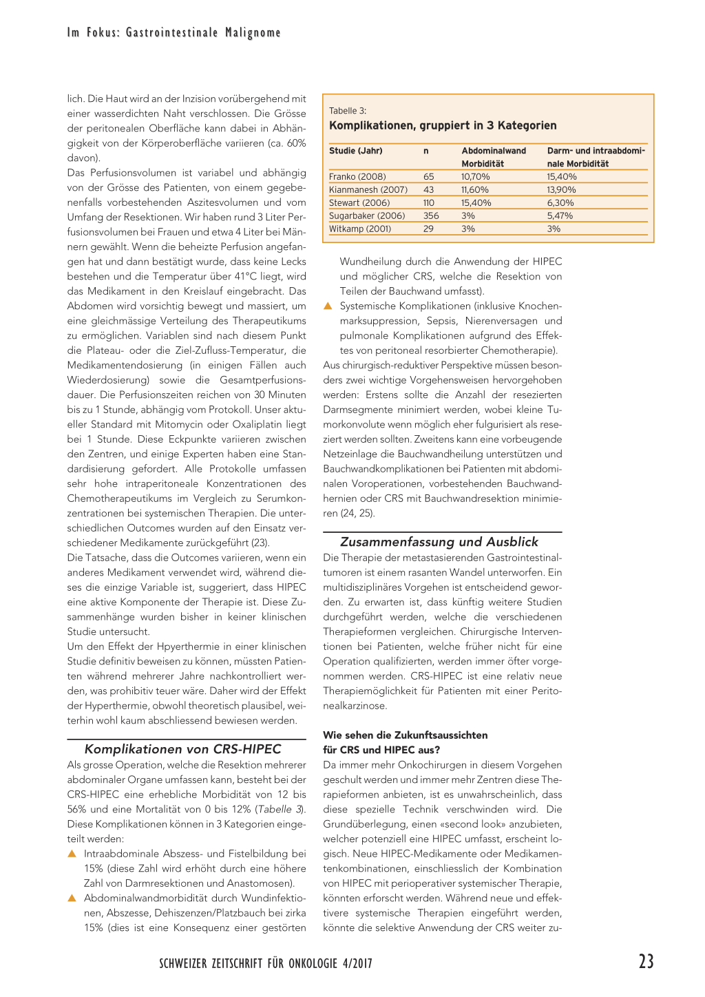 Als grosse Operation, welche die Resektion mehrerer abdominaler Organe umfassen kann, besteht bei der CRS-HIPEC eine erhebliche Morbidität von 12 bis 56% und eine Mortalität von 0 bis 12% (Tabelle 3). Diese Komplikationen können in 3 Kategorien eingeteilt werden: L Intraabdominale Abszess- und Fistelbildung bei