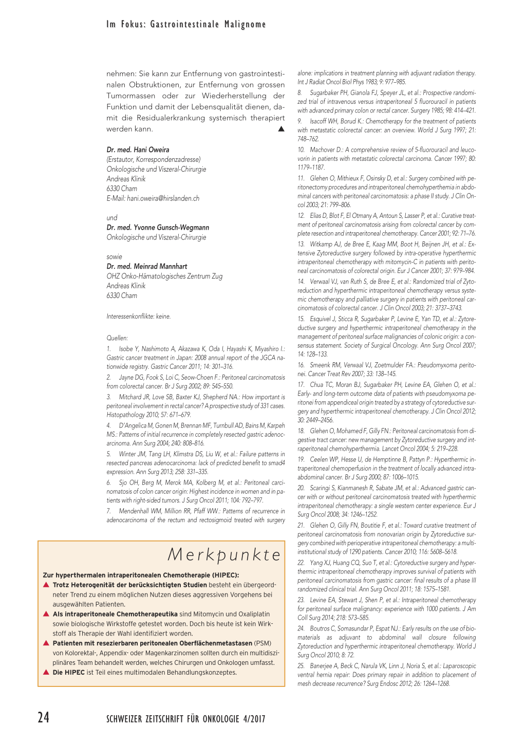 Dr. med. Hani Oweira (Erstautor, Korrespondenzadresse) Onkologische und Viszeral-Chirurgie Andreas Klinik 6330 Cham E-Mail: hani.oweira@hirslanden.ch