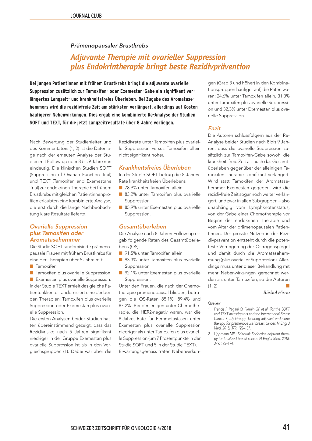 Die Studie SOFT randomisierte prämenopausale Frauen mit frühem Brustkrebs für eine der Therapien über 5 Jahre mit: I Tamoxifen I Tamoxifen plus ovarielle Suppression I Exemestan plus ovarielle Suppression. In der Studie TEXT erhielt das gleiche Patientenklientel randomisiert eine der beiden Therapien: Tamoxifen plus ovarielle Suppression oder Exemestan plus ovarielle Suppression. Die ersten Analysen beider Studien hatten übereinstimmend gezeigt, dass das Rezidivrisiko nach 5 Jahren signifikant niedriger in der Gruppe Exemestan plus ovarielle Suppression ist als in den Vergleichsgruppen (1). Dabei war aber die